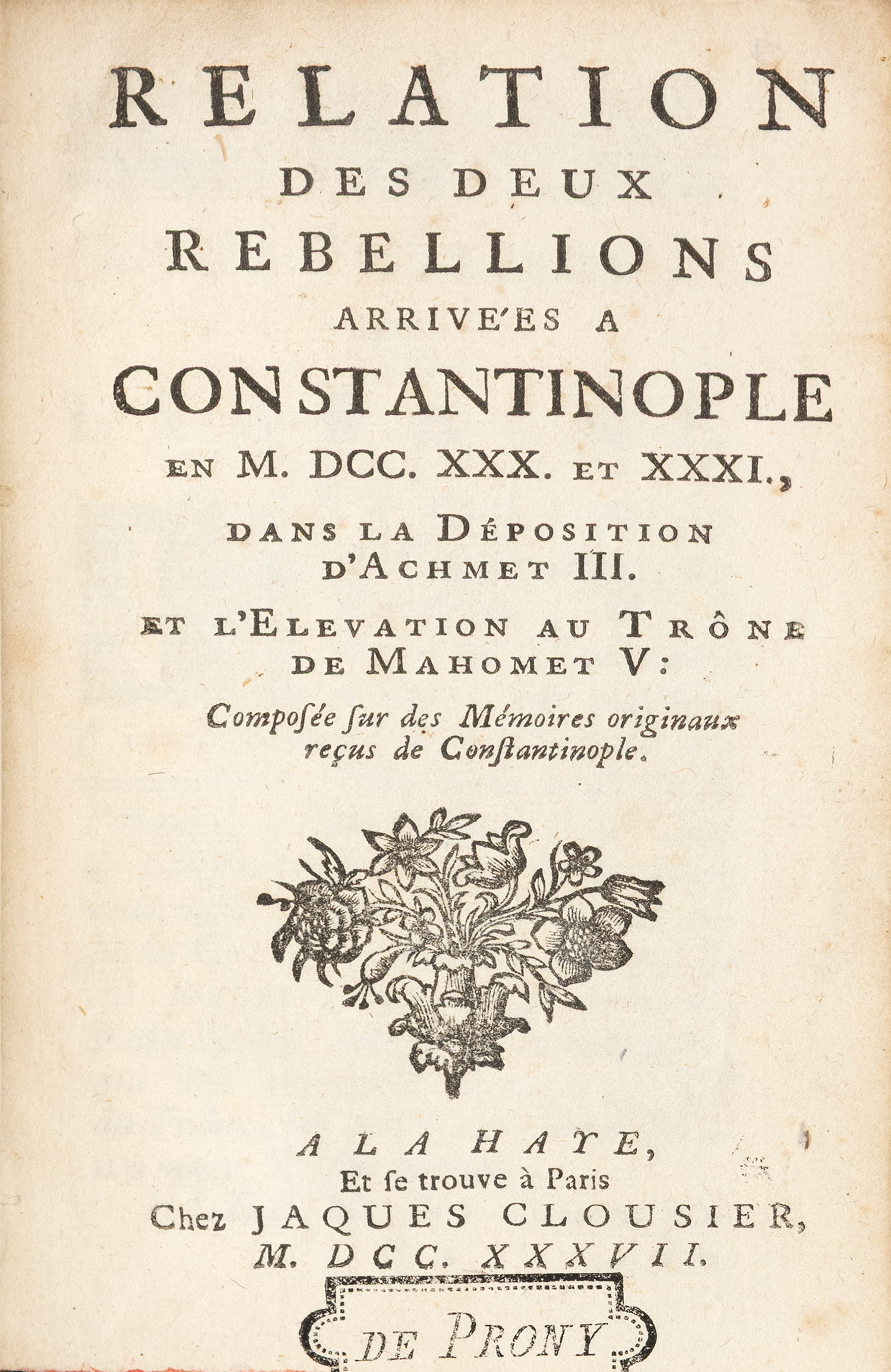 Relation des deux rebellions arrivées a Constantinople en M. DCC. XXX. et XXXI., dans la déposition d'Achmet III. et l'elevation au trône de Mahomet V. Composée sur des Mémoires originaux reçus de Constantinople.