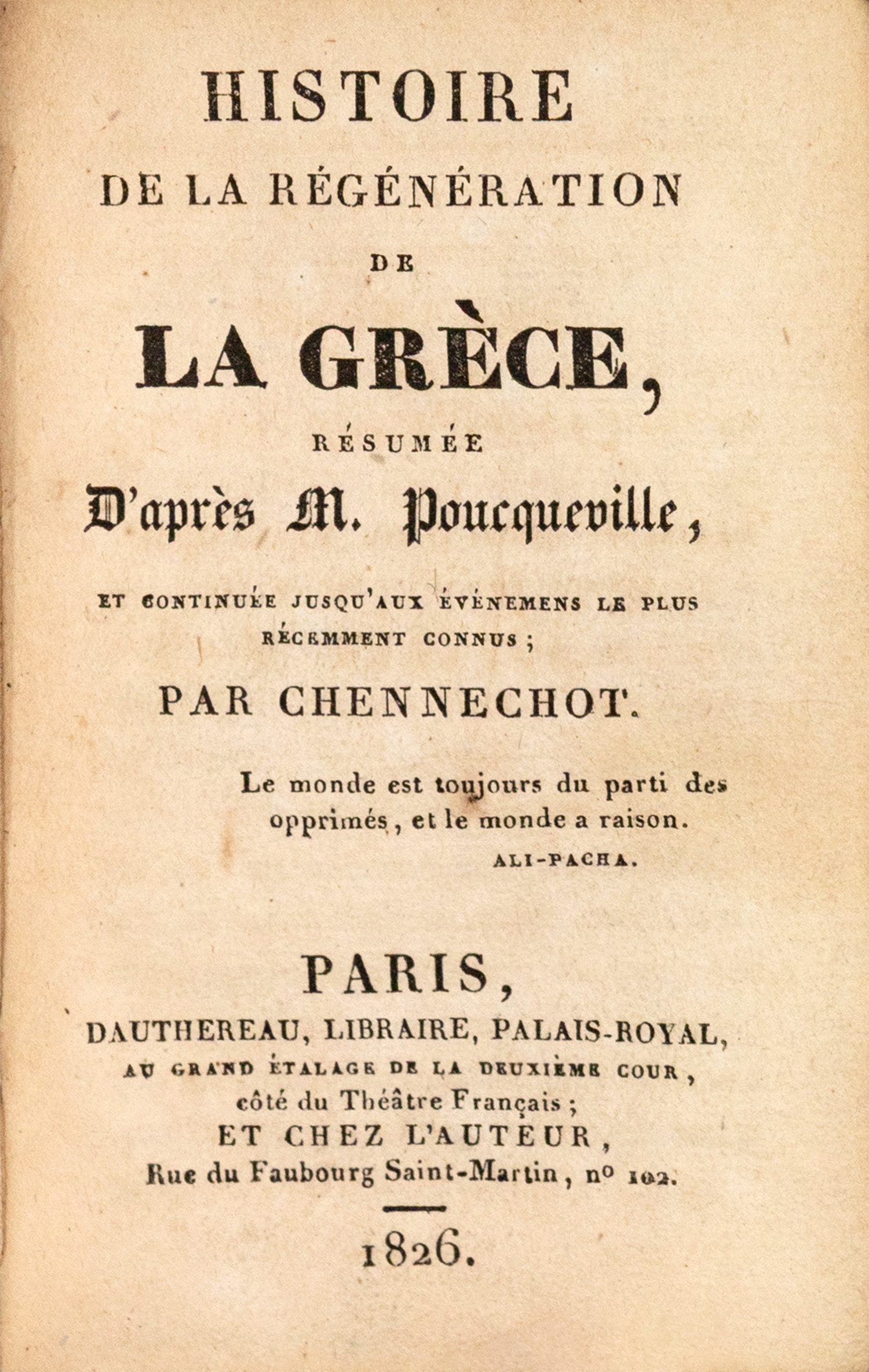 32ο (99 x 64 mm.), 64 σ. (λείπουν δύο μικρά τμήματα από τον τίτλο, ο ψευδότιτλος κολλημένος στο εσωτερικό του πάνω καλύμματος, λυμένο ένα φύλλο: σ. 15-6, ελαφρά οξειδωμένα μερικά φύλλα). Εύκαμπτα χαρτόνια της εποχής της έκδοσης (λείπει τμήμα από τη βάση της ράχης, μικρές φθορές). Droulia 1542. • Η πρώτη έκδοση κυκλοφόρησε επίσης μέσα στο 1826. • ΣΠΑΝΙΟ. [δεμένο μαζί:] CHENNECHOT, L. E. Histoire de la régénération de la Grèce, résumé d’après M. Poucqueville. Παρίσι, Dauthereau et chez l’auteur, 1826. • 32o, iv + 182 σ. (μικρός λεκές από νερό σε λίγα φύλλα στο τέλος). Droulia 1520.