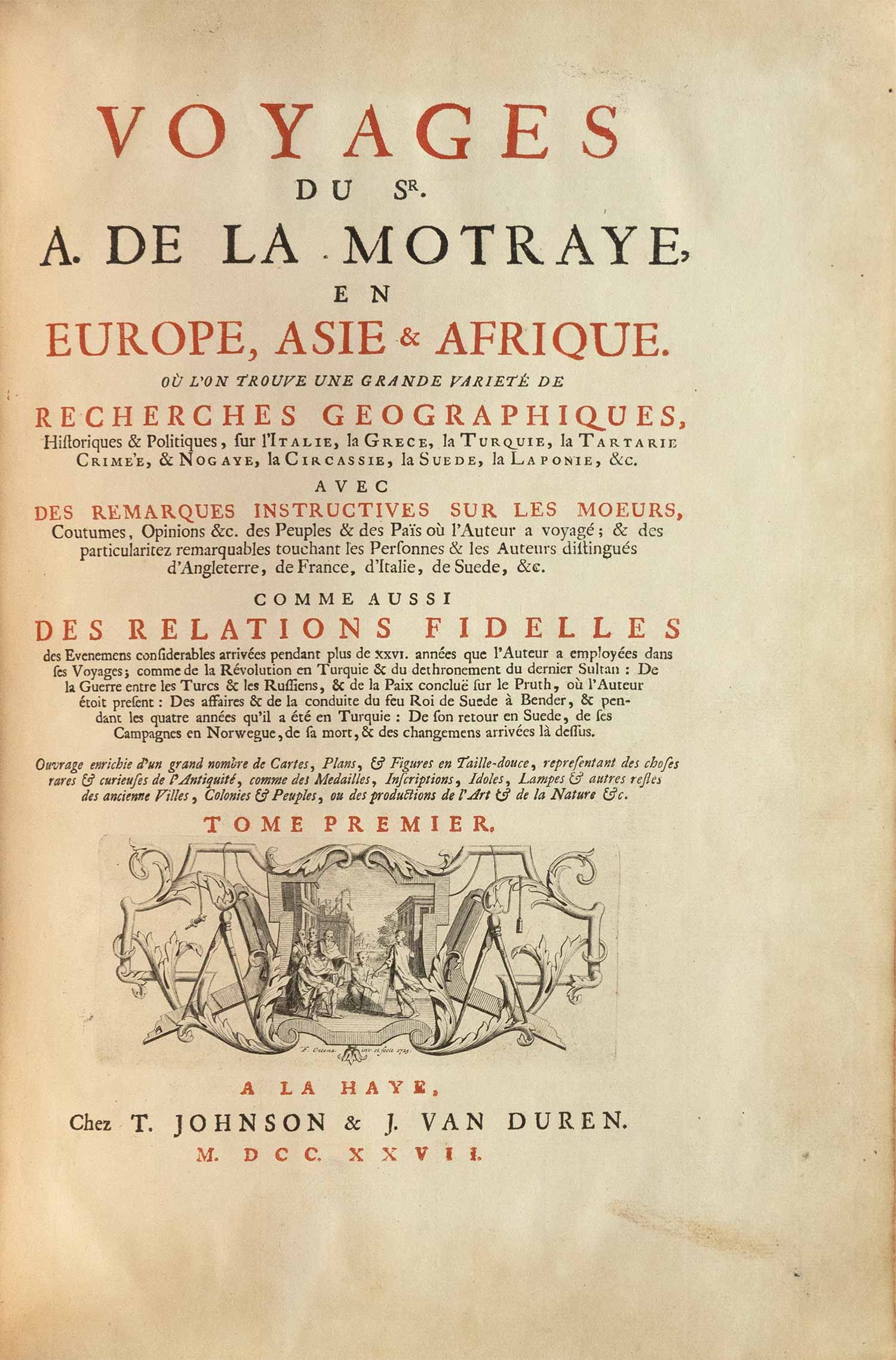 Voyages du Sr. A. de La Motraye, en Europe, Asie & Afrique. Οù l'on trouve une grande varieté de recherches geographiques, historiques & politiques, sur l'Italie, la Grece, la Turquie, la Tartarie Crimée, & Nogaye, la Circassie, la Suede, la Laponte, &c.