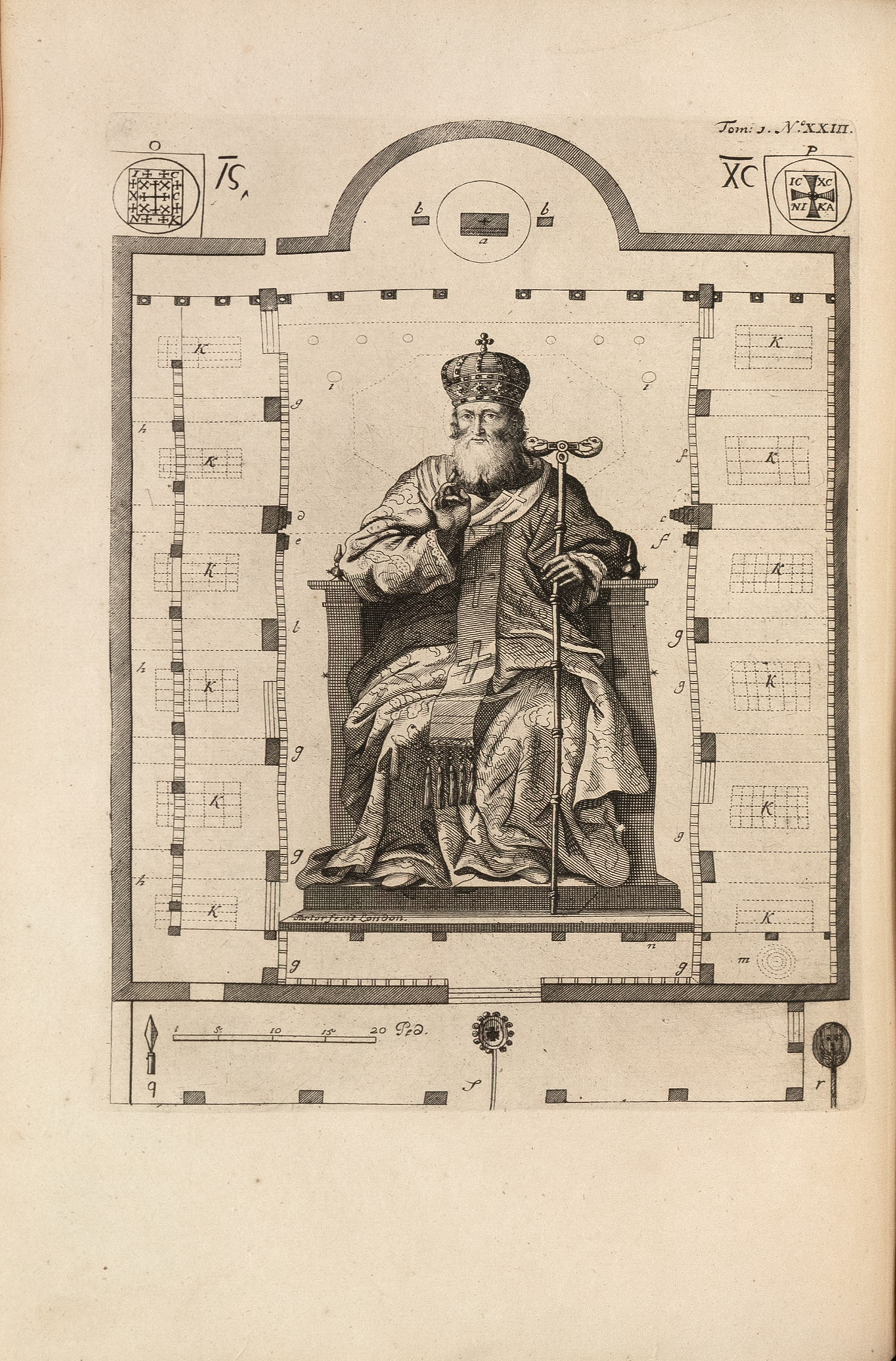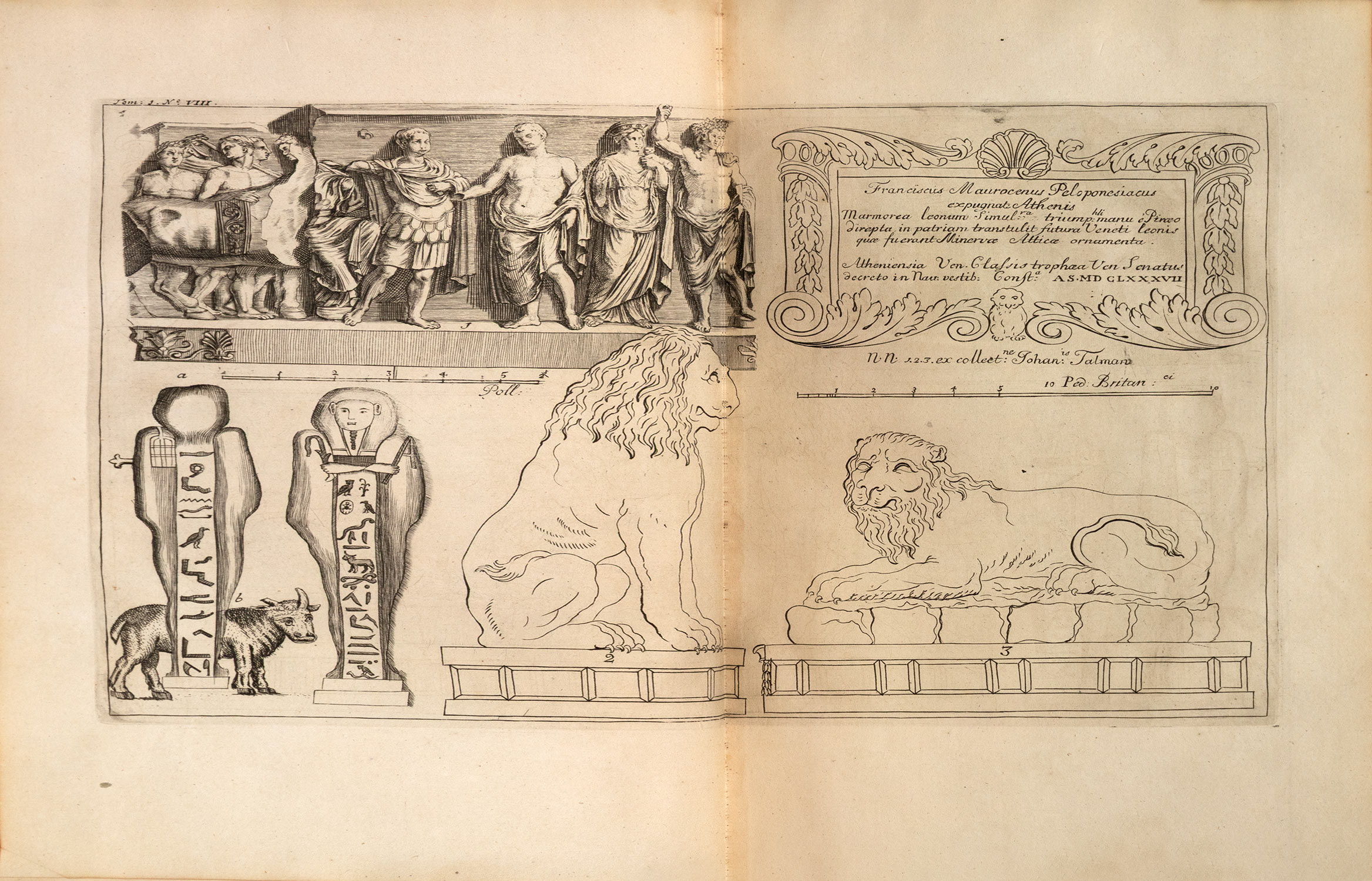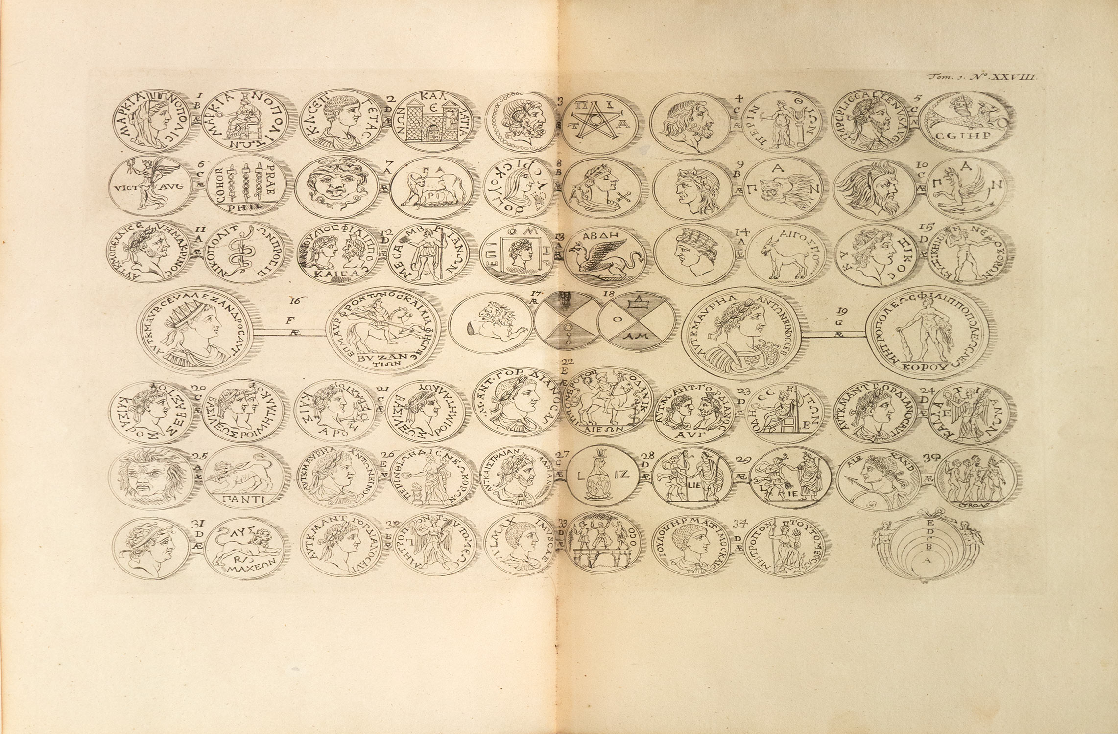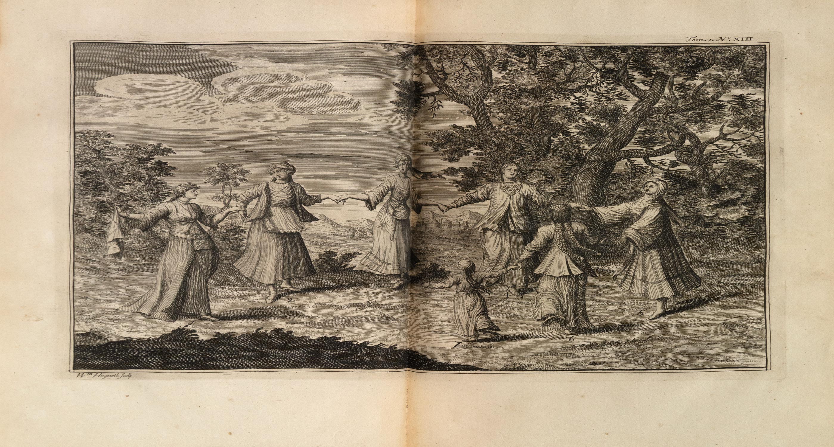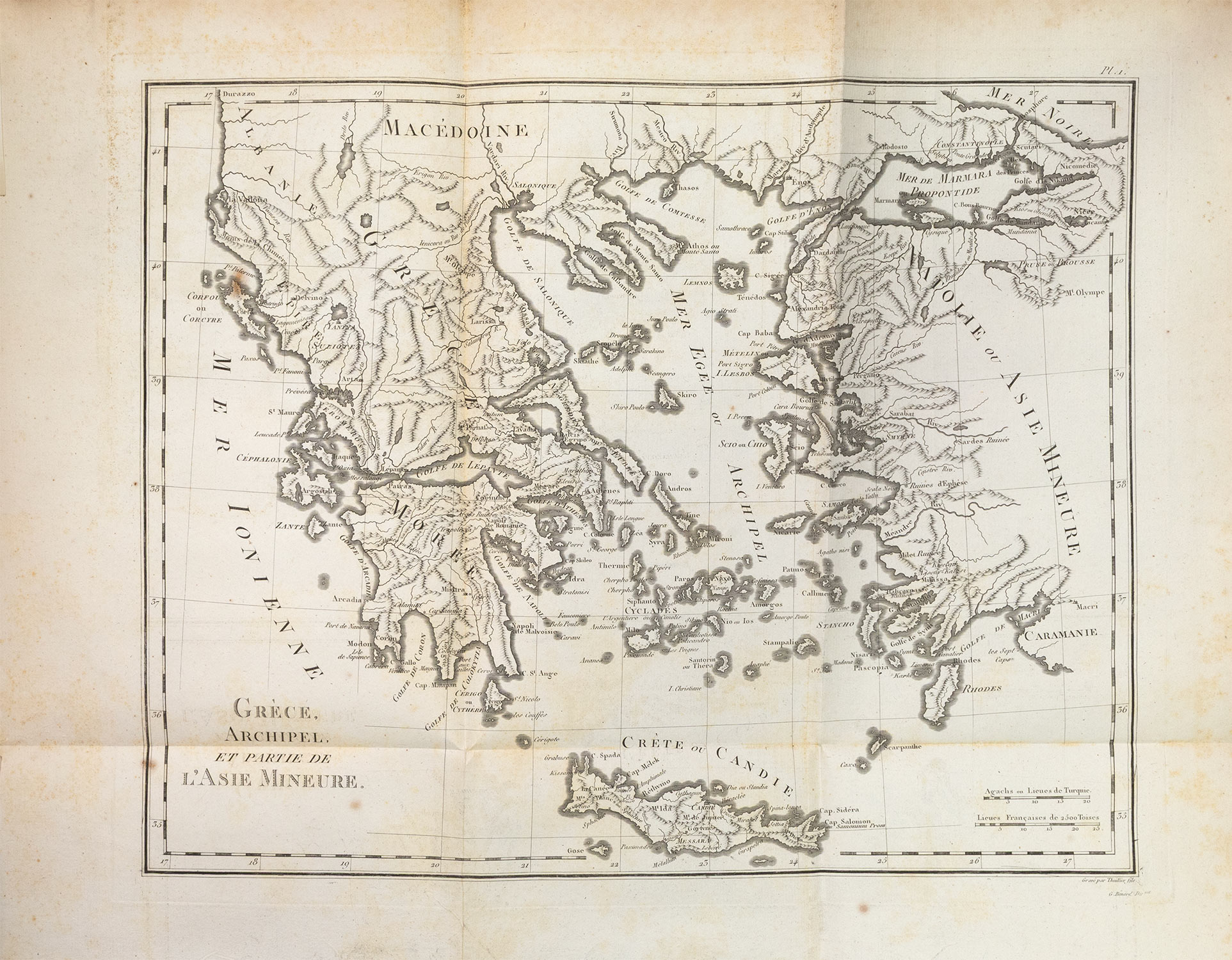 Πρώτη έκδοση στα γαλλικά, πρώτη μορφή, 2 τόμοι, μικρό folio (360 x 240 mm.), 472 + 23 και 496 + 39 σ. (ελαφρά οξειδωμένα μερικά φύλλα, σχίσιμο κυρίως στο πάνω περιθώριο του πίνακα ΙΙ στον Β΄ τόμο, δεμένος ανάποδα ο χάρτης Β στον Α΄ τόμο). Δίχρωμοι και με χαλκόγραφη βινιέτα οι τίτλοι, χαλκόγραφος επιπρόσθετος τίτλος και στους δύο τόμους, με 4 αναδιπλούμενους χαλκόγραφους χάρτες και 47 χαλκόγραφους πίνακες (5 αναδιπλούμενοι και 16 δισέλιδοι), κατάλογος συνδρομητών (ξεχωρίζει η εγγραφή του Isaac Newton). Δέρμα της εποχής της έκδοσης (σχισίματα στις ενώσεις, μικρές φθορές, χρυσή διακόσμηση στη ράχη και τα γυρίσματα, μαρμαρογραφημένα τα ακρόφυλλα, κόκκινες οι ακμές, ex-libris Α. Δ. Χατζηδήμου). Blackmer 946, Atabey 661, Weber, II, 443, Contominas 379. (2)