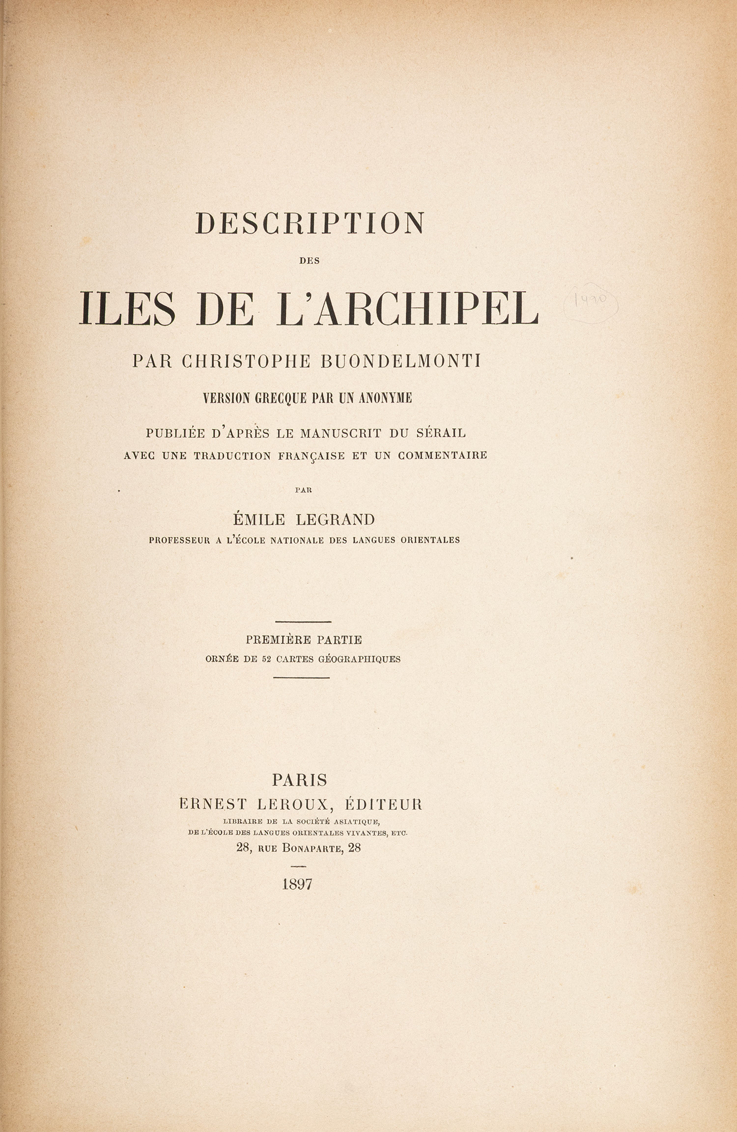 Description des îles de l’Archipel. Version grecque par un anonyme, publiée d’après le manuscrit du Sérail avec une traduction française et un commentaire par Émile Legrand, μέρος Α΄ (δεν εκδόθηκε άλλο).