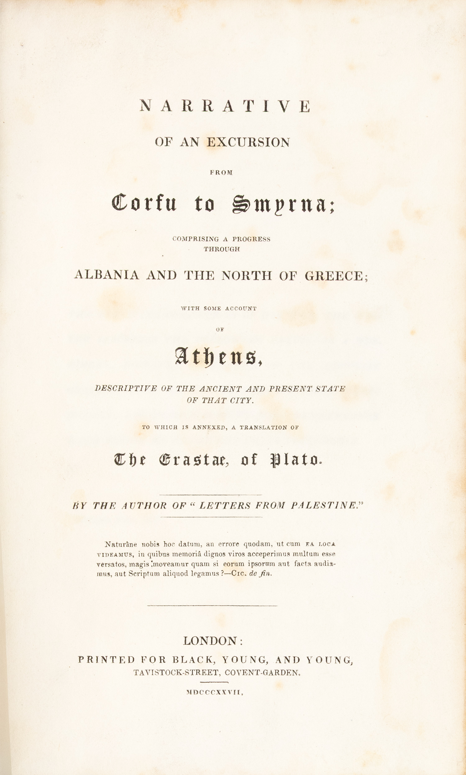 Narrative of an excursion from Corfu to Smyrna; comprising a progress through Albania and the north of Greece; with some account of Athens, descriptive of the ancient and present state of that city. To which is annexed a translation of The Erastae, of Plato.