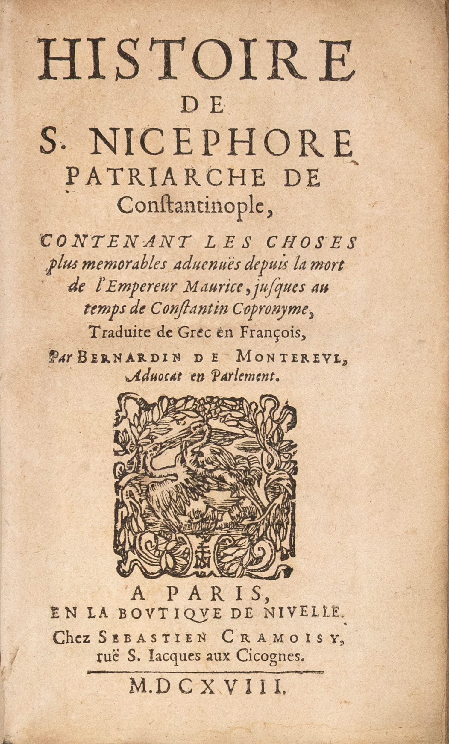 Histoire de S. Nicephore Patriarche de Constantinople, contenant les choses plus memorables advenuës depuis la mort de l’Empereur Maurice, jusques au temps de Constantine Copronyme, traduite de Grec en François, par Bernardin de Montereul.