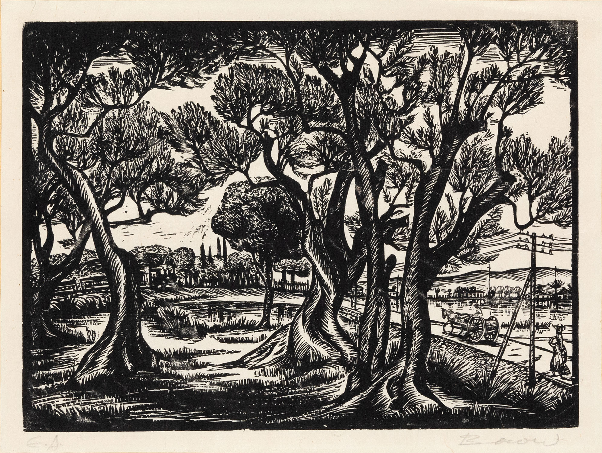 Ξυλογραφία σε πλάγιο ξύλο, 256 x 349 mm. (επικολλημένη σε πασπαρτού κατά μήκος των περιθωρίων). Η ένδειξη «E. A.» και υπογραφή στο κάτω περιθώριο με μολύβι.