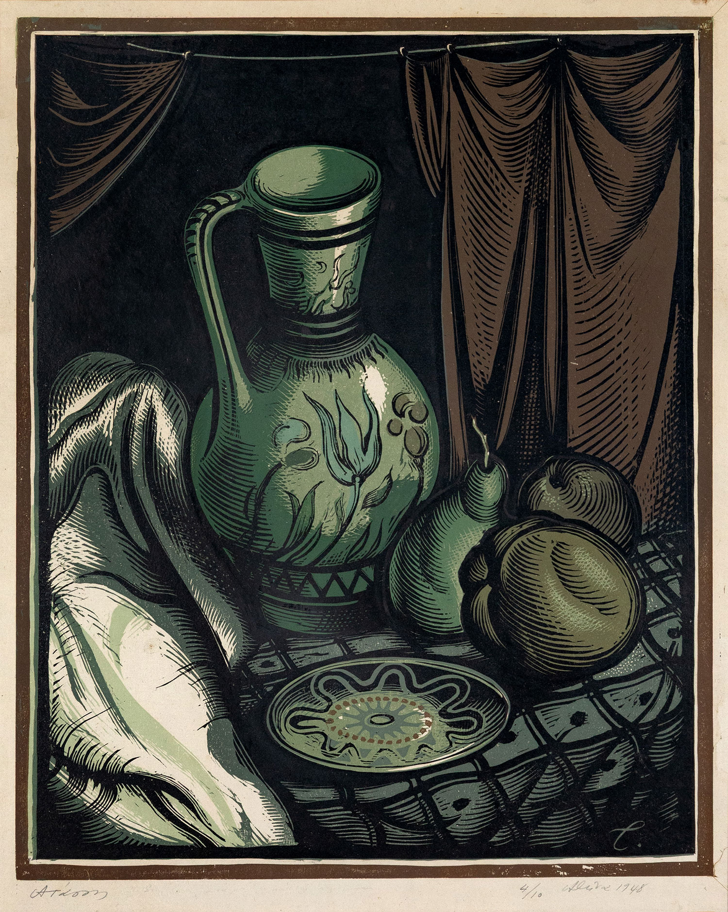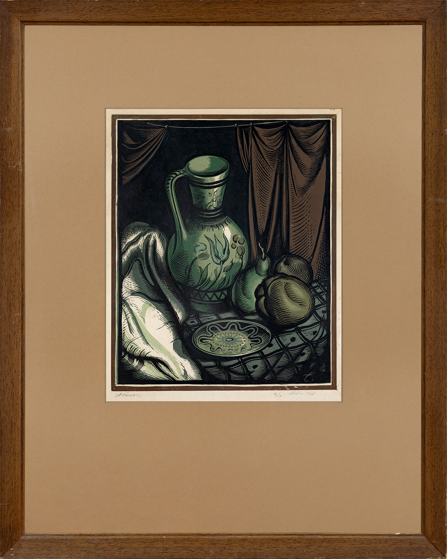 Έγχρωμη ξυλογραφία σε πλάγιο ξύλο, 420 x 340 mm. Έκδοση σε 10 αντίτυπα, υπογραφή, αρίθμηση, τόπος και χρονολογία στο κάτω περιθώριο με μολύβι, υπογραφή με αρχικό στην πλάκα. Σε κορνίζα.