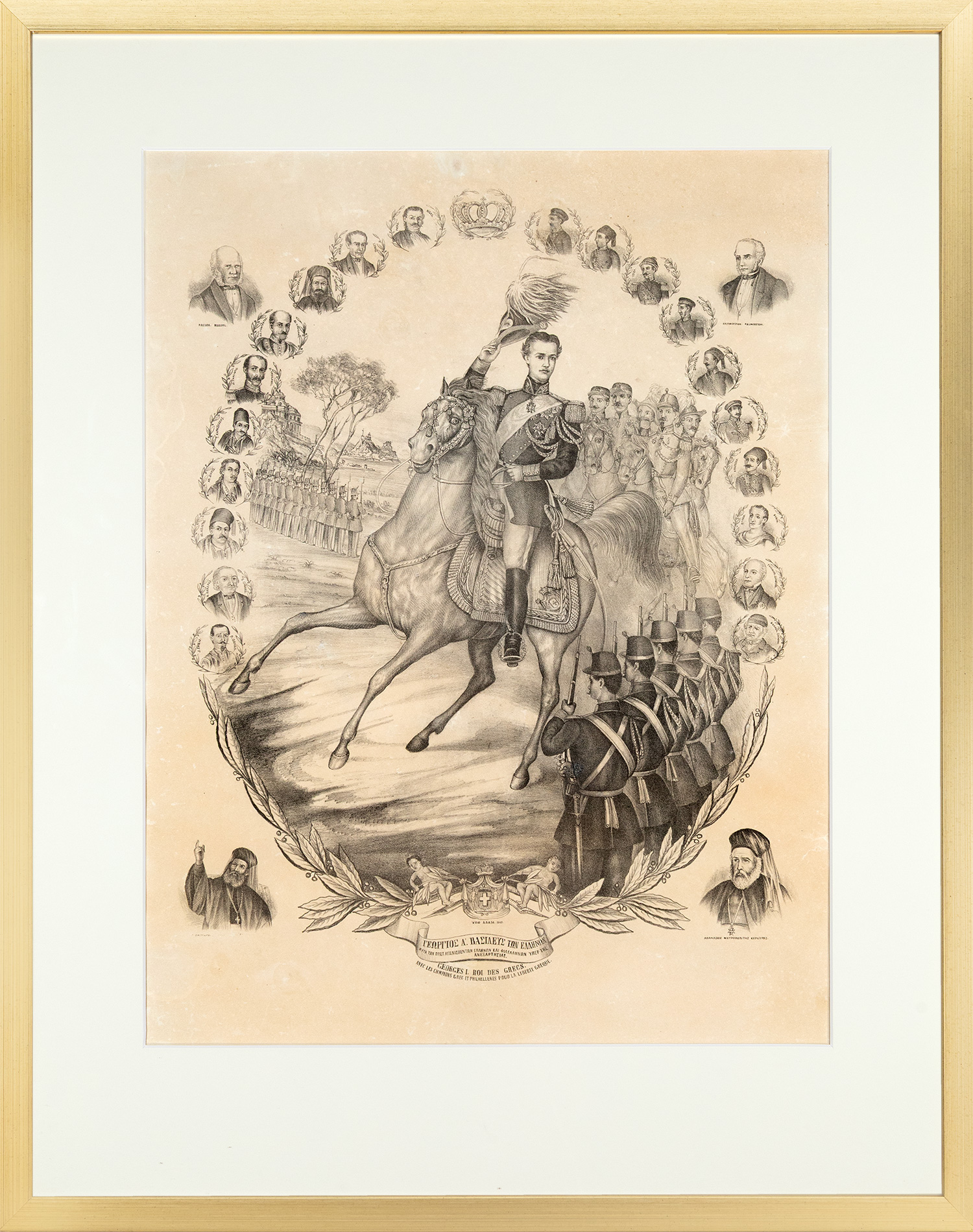 Λιθογραφία, 670 x 505 mm. Τίτλος στα ελληνικά και γαλλικά. Σε κορνίζα. • ΠΟΛΥ ΣΠΑΝΙΑ.