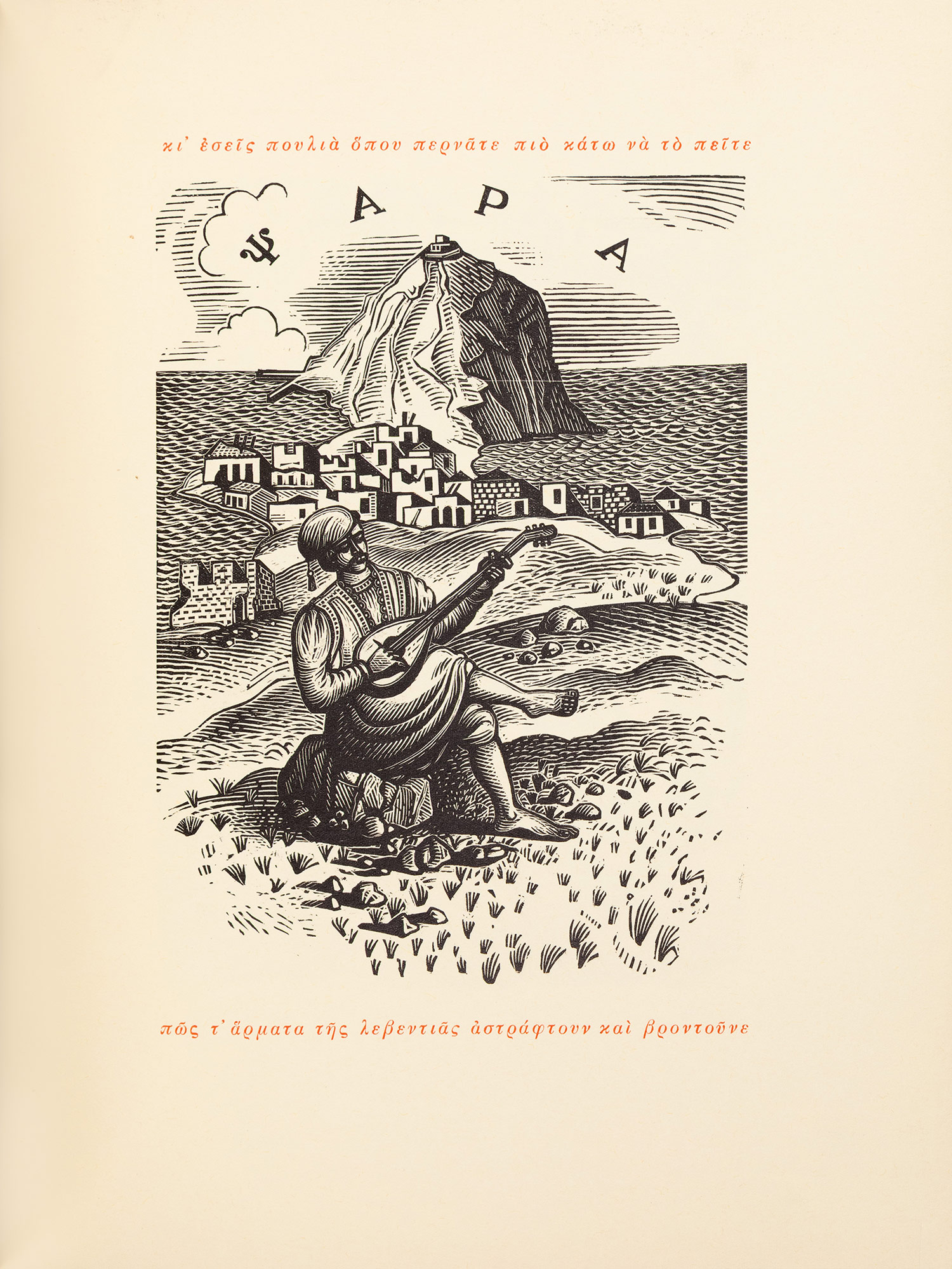4ο (347 x 260 mm.), [30] φ. Έκδοση περιορισμένη σε 500 αριθμημένα αντίτυπα, ξυλόγραφη προμετωπίδα και 15 ολοσέλιδες ξυλογραφίες του Α. ΤΑΣΣΟΥ. Αρχικά εικονογραφημένα εξώφυλλα (μικρές φθορές).