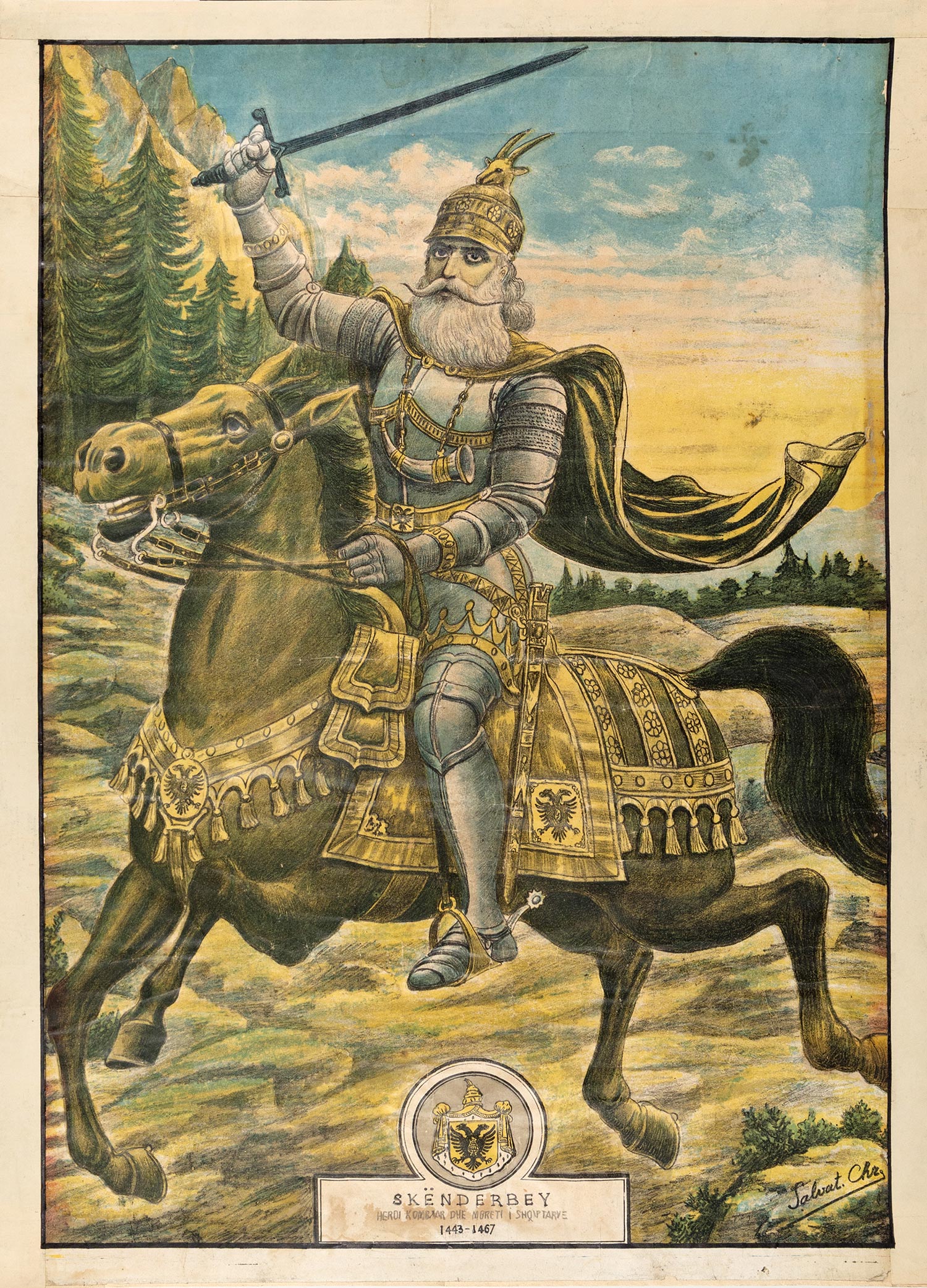 Χρωμολιθογραφία, 637 x 462 mm. (κομμένο μικρό τμήμα από το θέμα κατά μήκος της αριστερής και της δεξιάς πλευράς, κομμένα και συμπληρωμένα τα περιθώρια, τσακίσεις, ο τίτλος συμπληρωμένος με το χέρι). Ο τίτλος στα αλβανικά, υπογραφή με λατινικά στοιχεία στην πλάκα: «Salvat. Chr.».