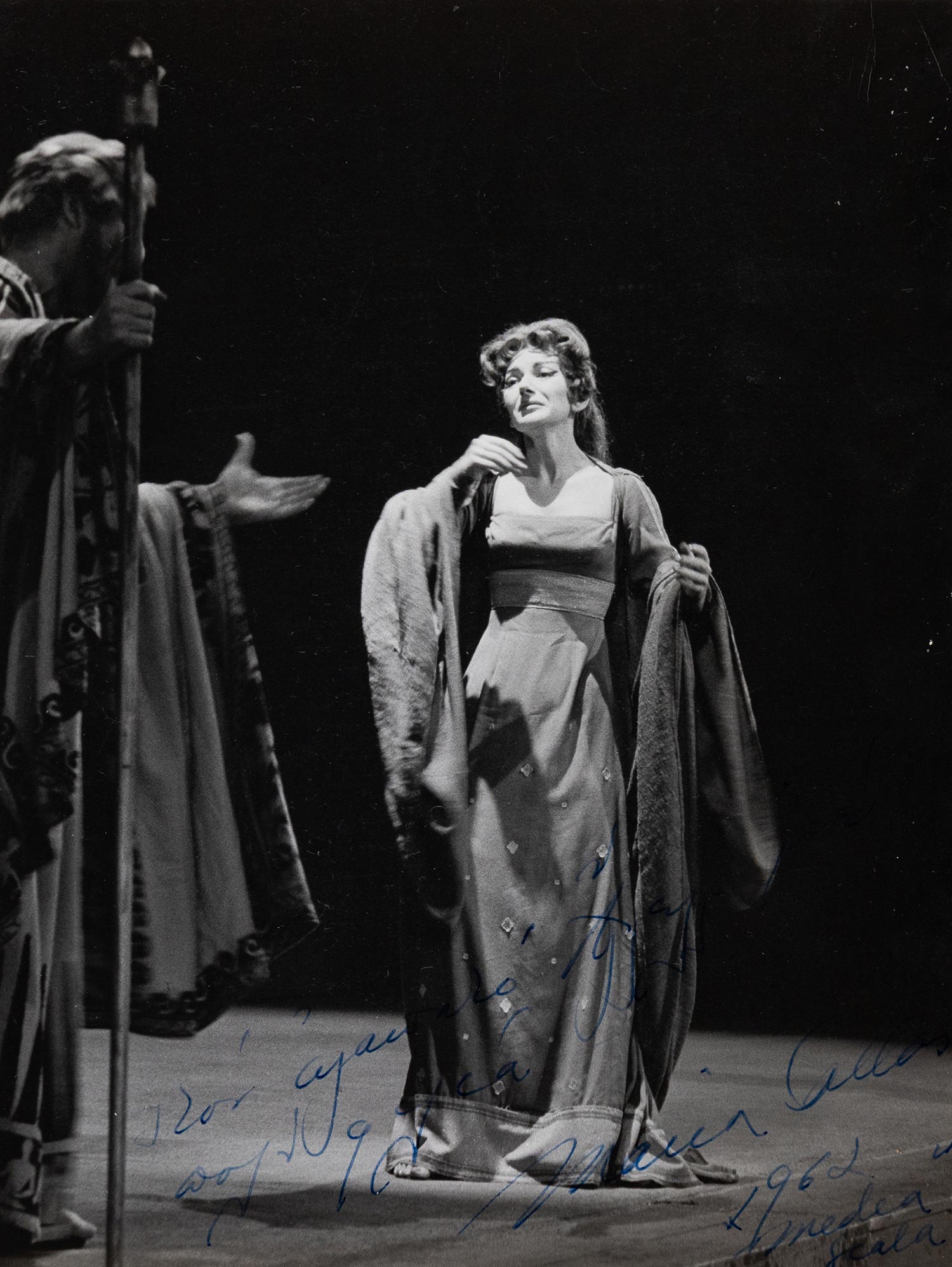 Με ιδιόχειρη αφιέρωση της Κάλλας στην εικόνα («Στόν ἀγαπητό Ἄγγελλο [;] μέ / πολύ φιλία / Maria Callas / 1962 / “Medea” / Scala»), σφραγίδα του φωτογράφου στην πίσω όψη, τύπωμα αργύρου, 235 x 180 mm. (ελάχιστες μικρές φθορές).