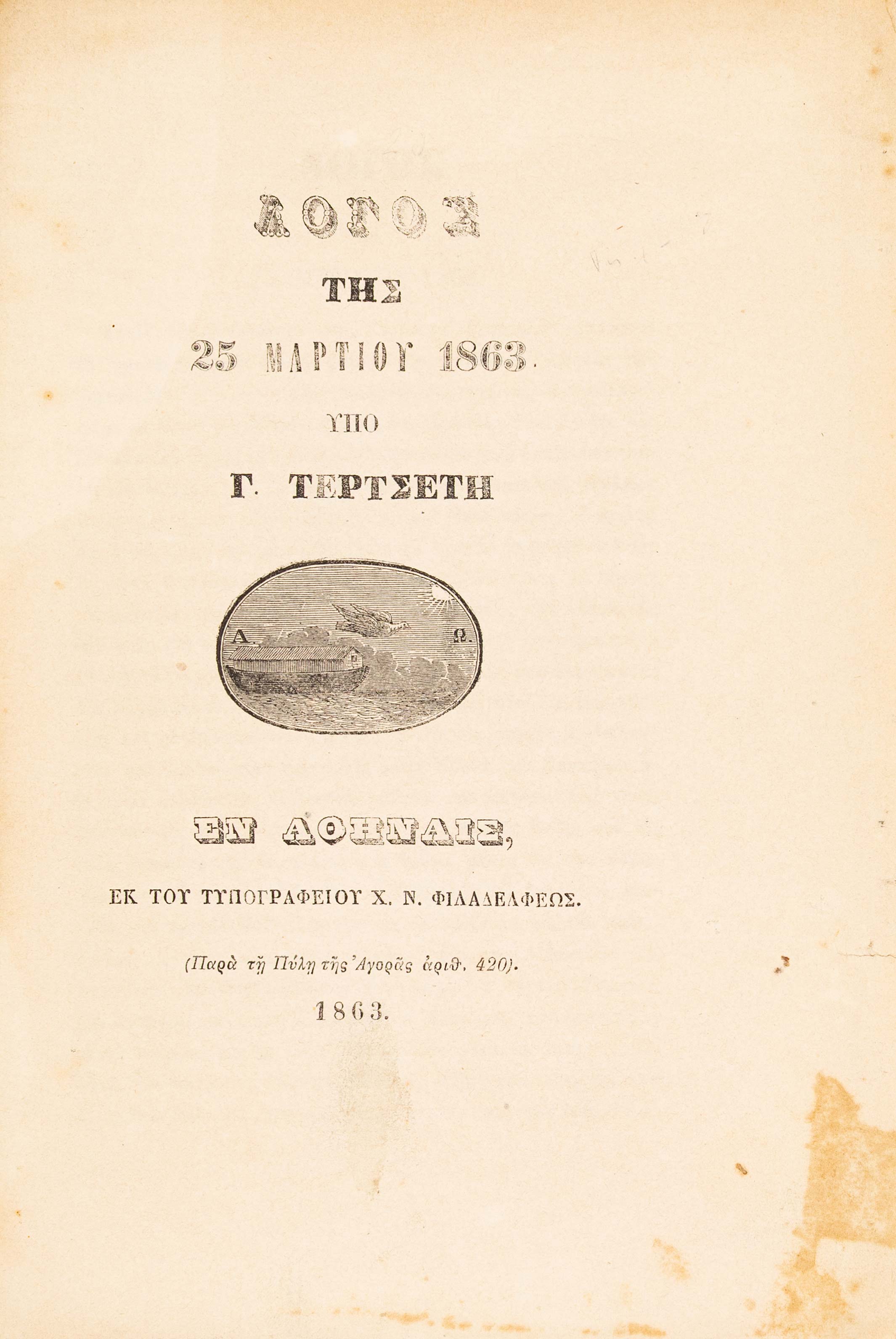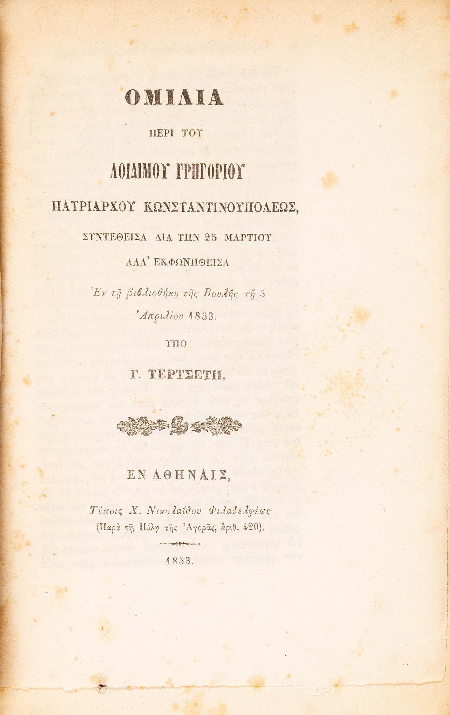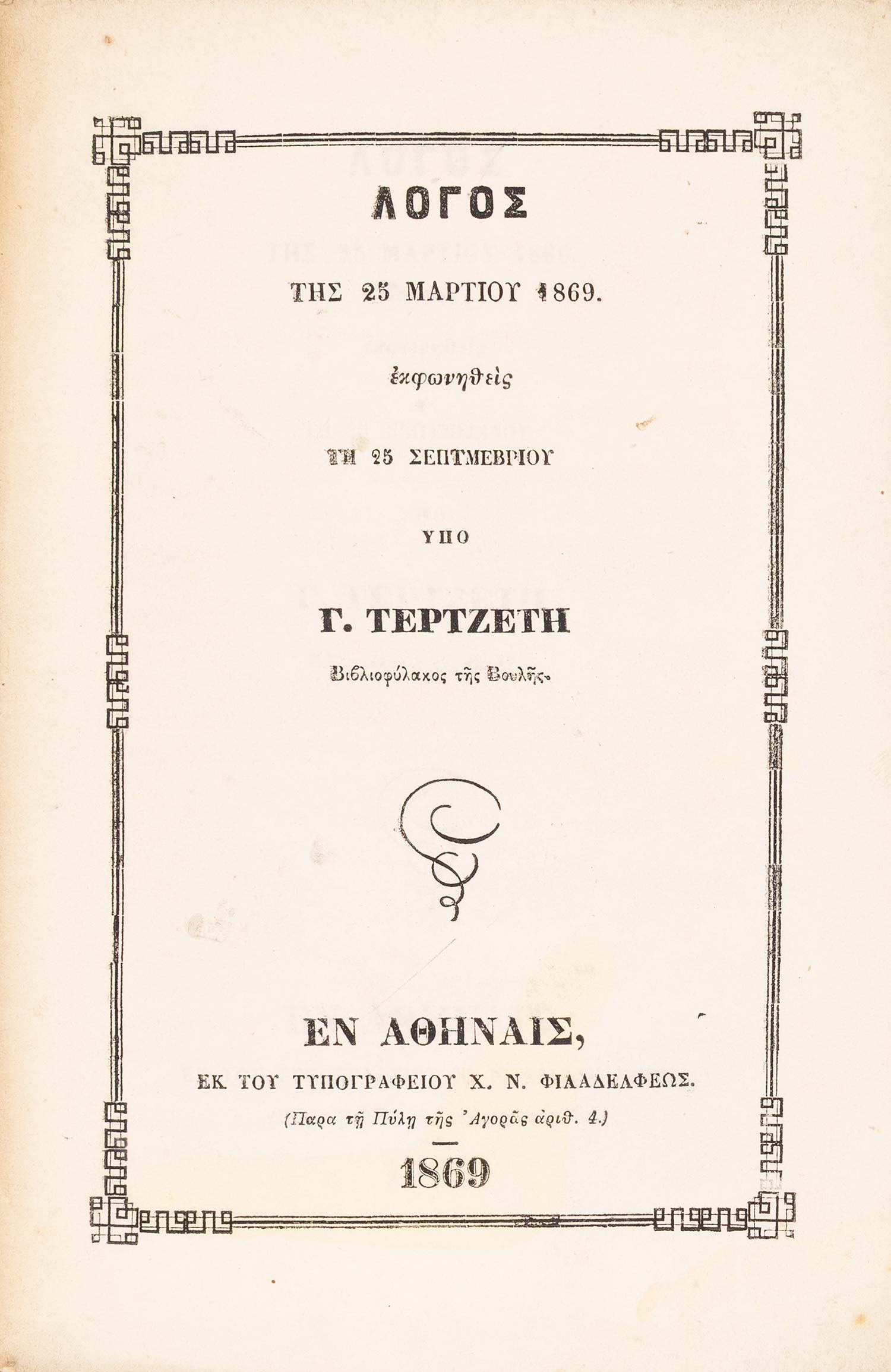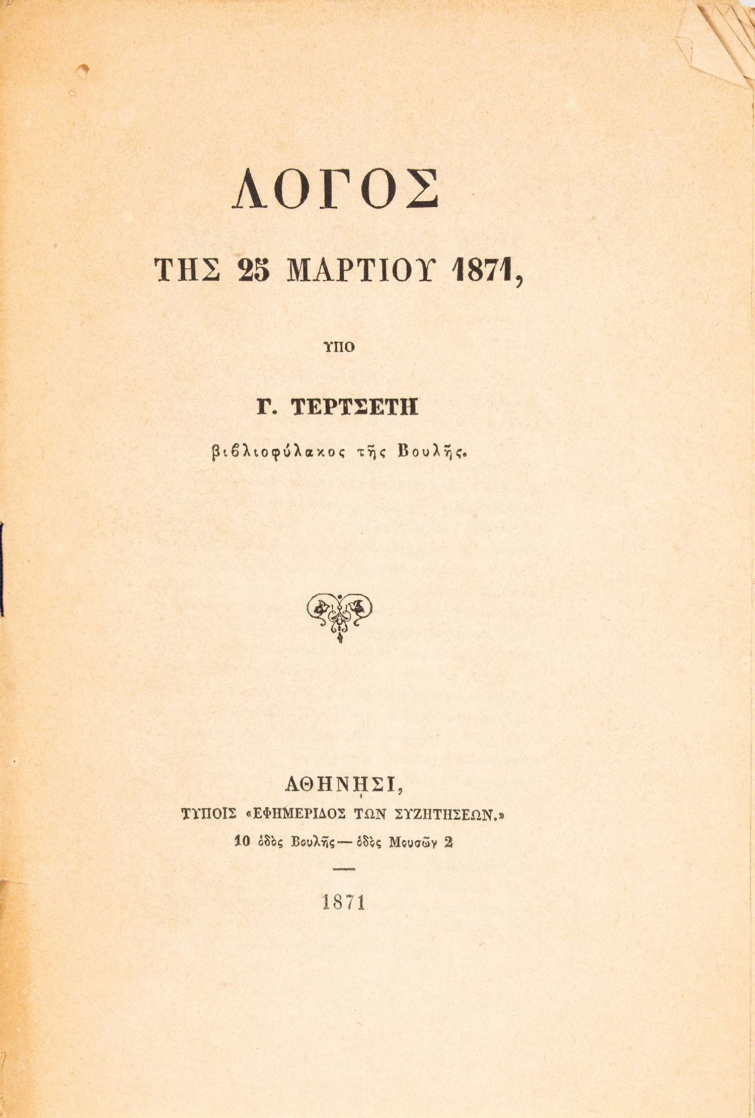 (α) Ὁμιλία περί τοῦ ἀοιδίμου Γρηγορίου Πατριάρχου Κωνσταντινουπόλεως, συντεθεῖσα διά τήν 25 Μαρτίου, ἀλλ’ ἐκφωνηθεῖσα ἐν τῇ βιβλιοθήκῃ τῆς Βουλῆς τῇ 5 Ἀπριλίου 1853. Αθήνα, Χ. Ν. Φιλαδελφεύς, 1853. • 8ο, β΄ + 40 σ. Αρχικά απλά εξώφυλλα (άκοπο και αξάκριστο). ΒΕΦΗ, 1853.248, Legrand & Pernot, 1759, Λαγανάς 1098. (β) Λόγος τῆς 25 Μαρτίου 1855. Οἱ γάμοι τοῦ Μεγάλου Ἀλεξάνδρου. Κορίννα καί Πίνδαρος. Αθήνα, Χ. Ν. Φιλαδελφεύς, 1856. • 8ο, 104 σ. (ελαφρά οξειδωμένο). Αρχικά τυπωμένα εξώφυλλα (αξάκριστο και εν μέρει άκοπο). ΒΕΦΗ, 1856.193. (γ) Λόγος τῆς 25 Μαρτίου ἔτους 1857. Τά ἐπιστρόφια εἰς τόν Θεόν. Αθήνα, Δ. Αθ. Μαυρομμάτης, [1857]. • 8ο, 31 σ. (λεκές στο εσωτερικό περιθώριο λίγων φύλλων). Αρχικά τυπωμένα εξώφυλλα. ΒΕΦΗ, 1857.243. (δ) Τί εἶδα εἰς τήν τετράμηνον περιήγησίν μου. Λόγος τῆς 25 Μαρτίου τοῦ ἔτους 1859. Αθήνα, Χ. Ν. Φιλαδελφεύς, 1859. • 8ο, 52 σ. (λείπει το τελευταίο φύλλο με τα παροράματα στο recto, λευκό το verso). Αρχικά τυπωμένα εξώφυλλα (άκοπο και αξάκριστο). ΒΕΦΗ, 1859.410. (ε) Λόγος τῆς 25 Μαρτίου 1863. Αθήνα, Χ. Ν. Φιλαδελφεύς, 1863. • 8ο, 12 σ. Χωρίς ιδιαίτερα εξώφυλλα (με μορφή εξωφύλλων το πρώτο και το τελευταίο φύλλο, άκοπο και αξάκριστο). ΒΕΦΗ, 1863.344. (στ) Λόγος τῆς 25 Μαρτίου 1869, ἐκφωνηθείς τῇ 25 Σεπτμεβρίου [sic]. Αθήνα, Χ. Ν. Φιλαδελφεύς, 1869. • 8ο, γ΄ + 19 σ. Αρχικά τυπωμένα εξώφυλλα. Ηλιού & Πολέμη, 1869.294. (ζ) Λόγος τῆς 25 Μαρτίου 1871. Αθήνα, τυπογραφείο της «Εφημερίδος των Συζητήσεων», 1871. • 8ο, 16 σ. Χωρίς ιδιαίτερα εξώφυλλα (αξάκριστο). Ηλιού & Πολέμη, 1871.423. (η) Λόγος τῆς 25 Μαρτίου τοῦ ἔτους 1872. Αθήνα, Χ. Ν. Φιλαδελφεύς, [1872]. • 8ο, 16 σ. Χωρίς ιδιαίτερο φύλλο τίτλου, ο τίτλος στην αρχή του κειμένου. Αντίτυπο με ιδιόχειρη αφιέρωση στο κάτω εξώφυλλο («Τῷ Σεβασμιοτάτῳ Ἀρχιεπισ- / κόπῳ Κῳ Θεοκλήτῳ / Γ. Τ.»). Αρχικά απλά εξώφυλλα (αξάκριστο). ΒΕΦΗ, Προσθήκες, 1043 (1872), Λαγανάς 1312. (8)