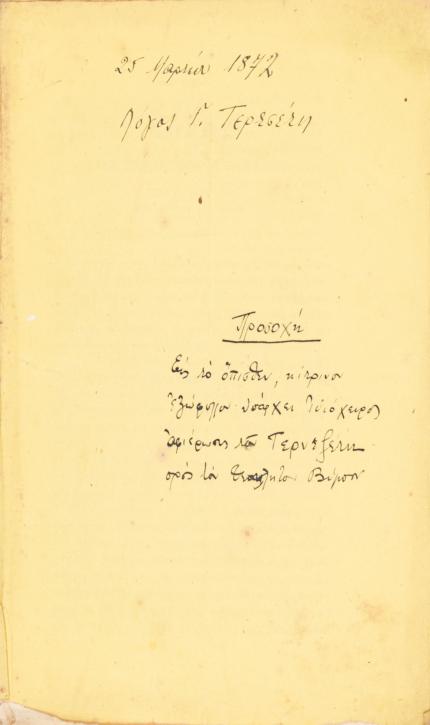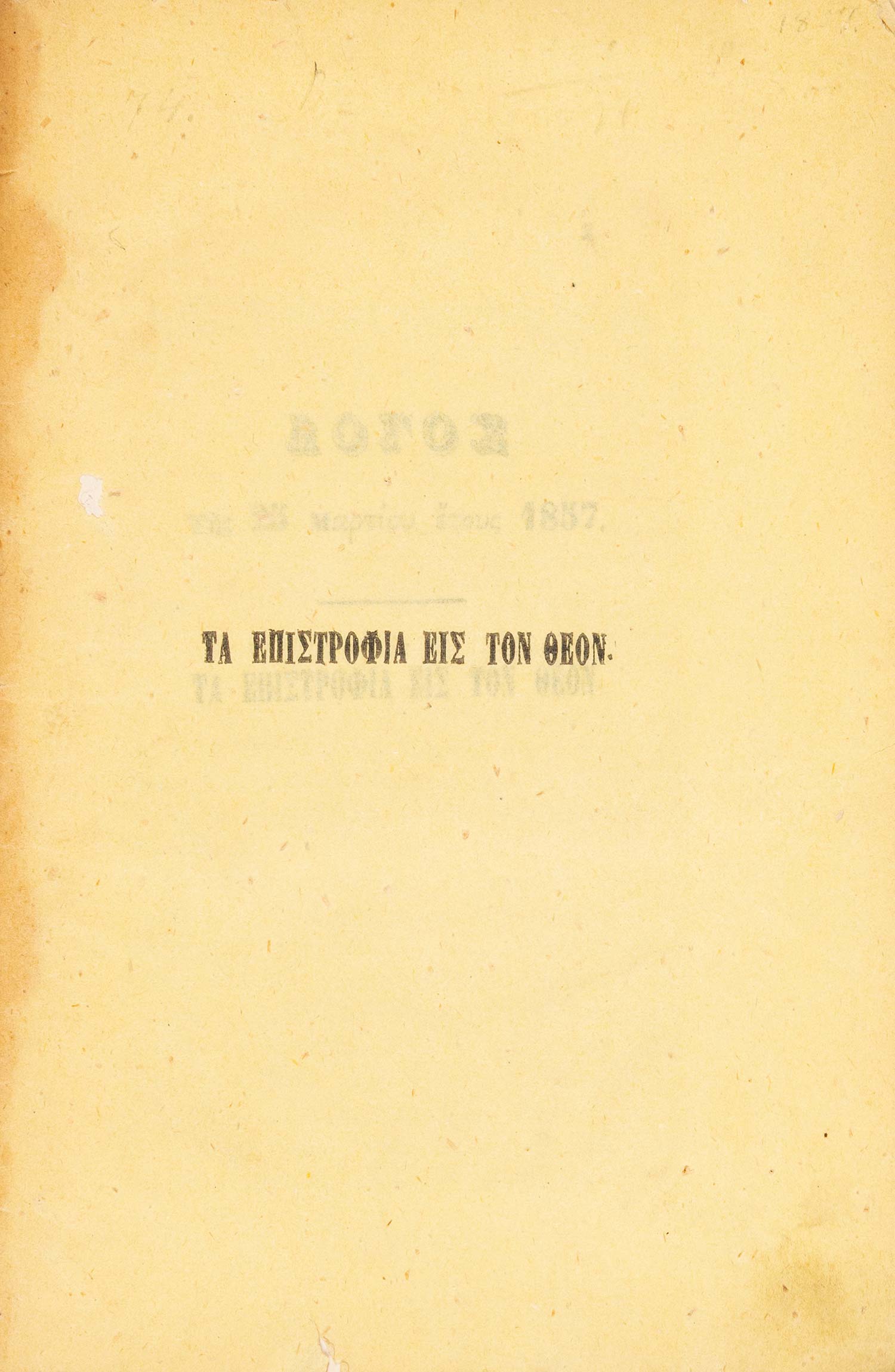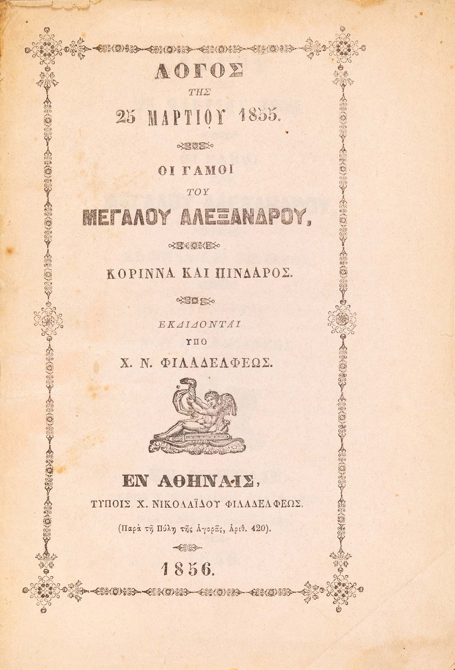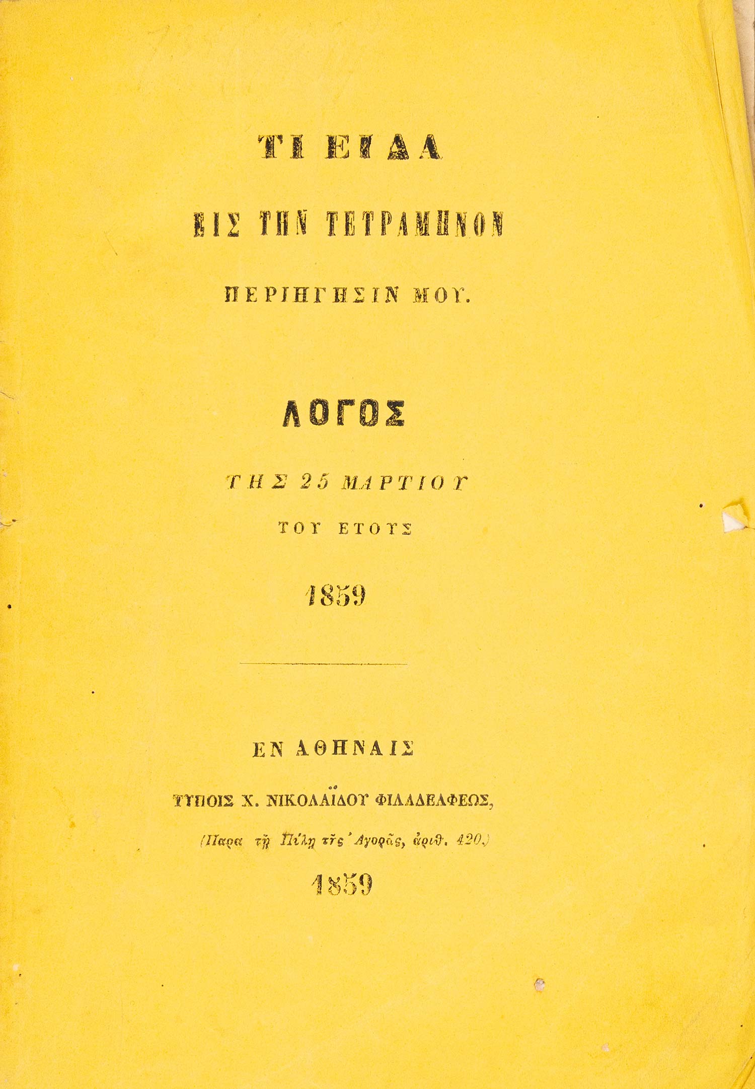 (α) Ὁμιλία περί τοῦ ἀοιδίμου Γρηγορίου Πατριάρχου Κωνσταντινουπόλεως, συντεθεῖσα διά τήν 25 Μαρτίου, ἀλλ’ ἐκφωνηθεῖσα ἐν τῇ βιβλιοθήκῃ τῆς Βουλῆς τῇ 5 Ἀπριλίου 1853. Αθήνα, Χ. Ν. Φιλαδελφεύς, 1853. • 8ο, β΄ + 40 σ. Αρχικά απλά εξώφυλλα (άκοπο και αξάκριστο). ΒΕΦΗ, 1853.248, Legrand & Pernot, 1759, Λαγανάς 1098. (β) Λόγος τῆς 25 Μαρτίου 1855. Οἱ γάμοι τοῦ Μεγάλου Ἀλεξάνδρου. Κορίννα καί Πίνδαρος. Αθήνα, Χ. Ν. Φιλαδελφεύς, 1856. • 8ο, 104 σ. (ελαφρά οξειδωμένο). Αρχικά τυπωμένα εξώφυλλα (αξάκριστο και εν μέρει άκοπο). ΒΕΦΗ, 1856.193. (γ) Λόγος τῆς 25 Μαρτίου ἔτους 1857. Τά ἐπιστρόφια εἰς τόν Θεόν. Αθήνα, Δ. Αθ. Μαυρομμάτης, [1857]. • 8ο, 31 σ. (λεκές στο εσωτερικό περιθώριο λίγων φύλλων). Αρχικά τυπωμένα εξώφυλλα. ΒΕΦΗ, 1857.243. (δ) Τί εἶδα εἰς τήν τετράμηνον περιήγησίν μου. Λόγος τῆς 25 Μαρτίου τοῦ ἔτους 1859. Αθήνα, Χ. Ν. Φιλαδελφεύς, 1859. • 8ο, 52 σ. (λείπει το τελευταίο φύλλο με τα παροράματα στο recto, λευκό το verso). Αρχικά τυπωμένα εξώφυλλα (άκοπο και αξάκριστο). ΒΕΦΗ, 1859.410. (ε) Λόγος τῆς 25 Μαρτίου 1863. Αθήνα, Χ. Ν. Φιλαδελφεύς, 1863. • 8ο, 12 σ. Χωρίς ιδιαίτερα εξώφυλλα (με μορφή εξωφύλλων το πρώτο και το τελευταίο φύλλο, άκοπο και αξάκριστο). ΒΕΦΗ, 1863.344. (στ) Λόγος τῆς 25 Μαρτίου 1869, ἐκφωνηθείς τῇ 25 Σεπτμεβρίου [sic]. Αθήνα, Χ. Ν. Φιλαδελφεύς, 1869. • 8ο, γ΄ + 19 σ. Αρχικά τυπωμένα εξώφυλλα. Ηλιού & Πολέμη, 1869.294. (ζ) Λόγος τῆς 25 Μαρτίου 1871. Αθήνα, τυπογραφείο της «Εφημερίδος των Συζητήσεων», 1871. • 8ο, 16 σ. Χωρίς ιδιαίτερα εξώφυλλα (αξάκριστο). Ηλιού & Πολέμη, 1871.423. (η) Λόγος τῆς 25 Μαρτίου τοῦ ἔτους 1872. Αθήνα, Χ. Ν. Φιλαδελφεύς, [1872]. • 8ο, 16 σ. Χωρίς ιδιαίτερο φύλλο τίτλου, ο τίτλος στην αρχή του κειμένου. Αντίτυπο με ιδιόχειρη αφιέρωση στο κάτω εξώφυλλο («Τῷ Σεβασμιοτάτῳ Ἀρχιεπισ- / κόπῳ Κῳ Θεοκλήτῳ / Γ. Τ.»). Αρχικά απλά εξώφυλλα (αξάκριστο). ΒΕΦΗ, Προσθήκες, 1043 (1872), Λαγανάς 1312. (8)