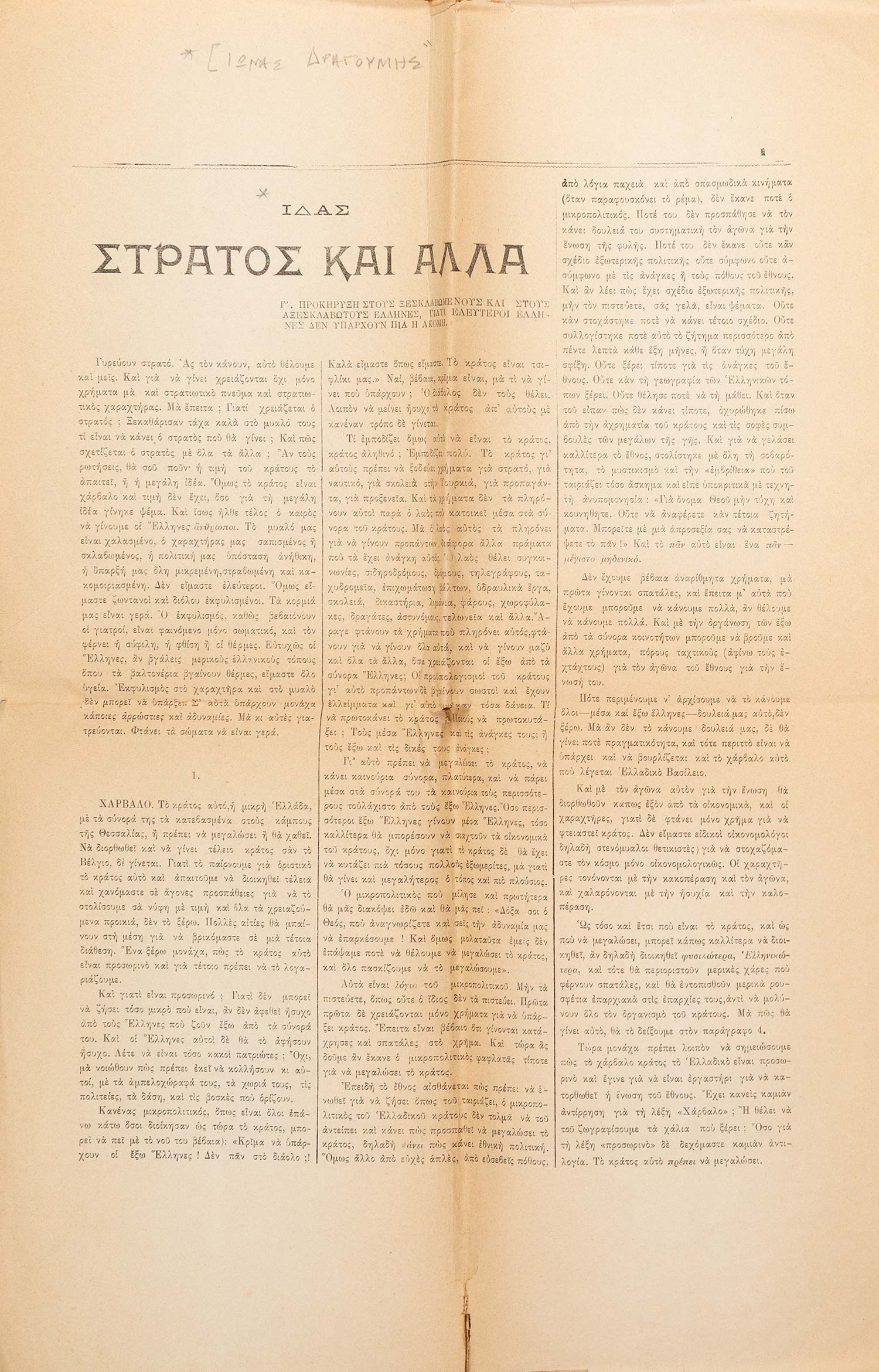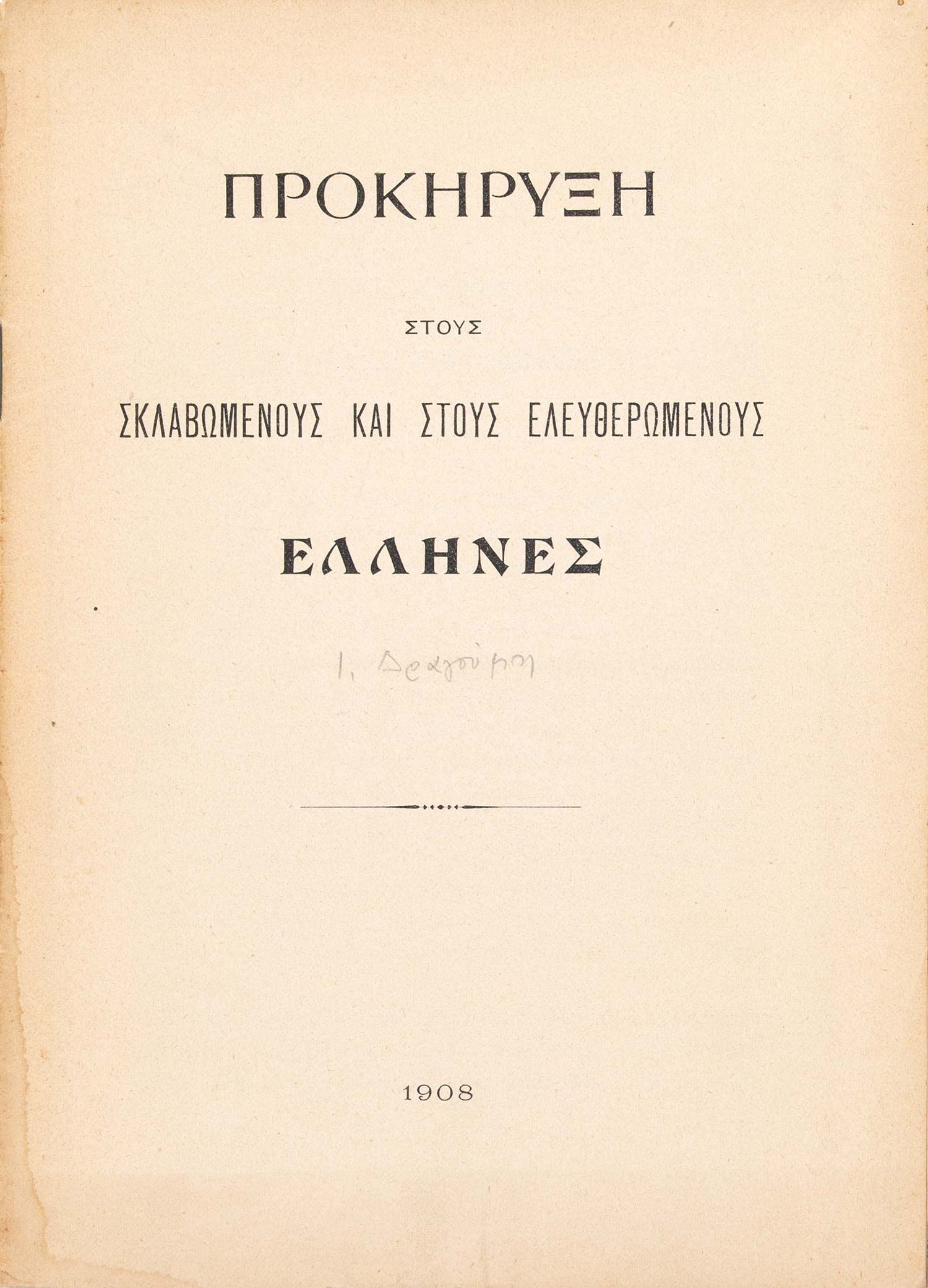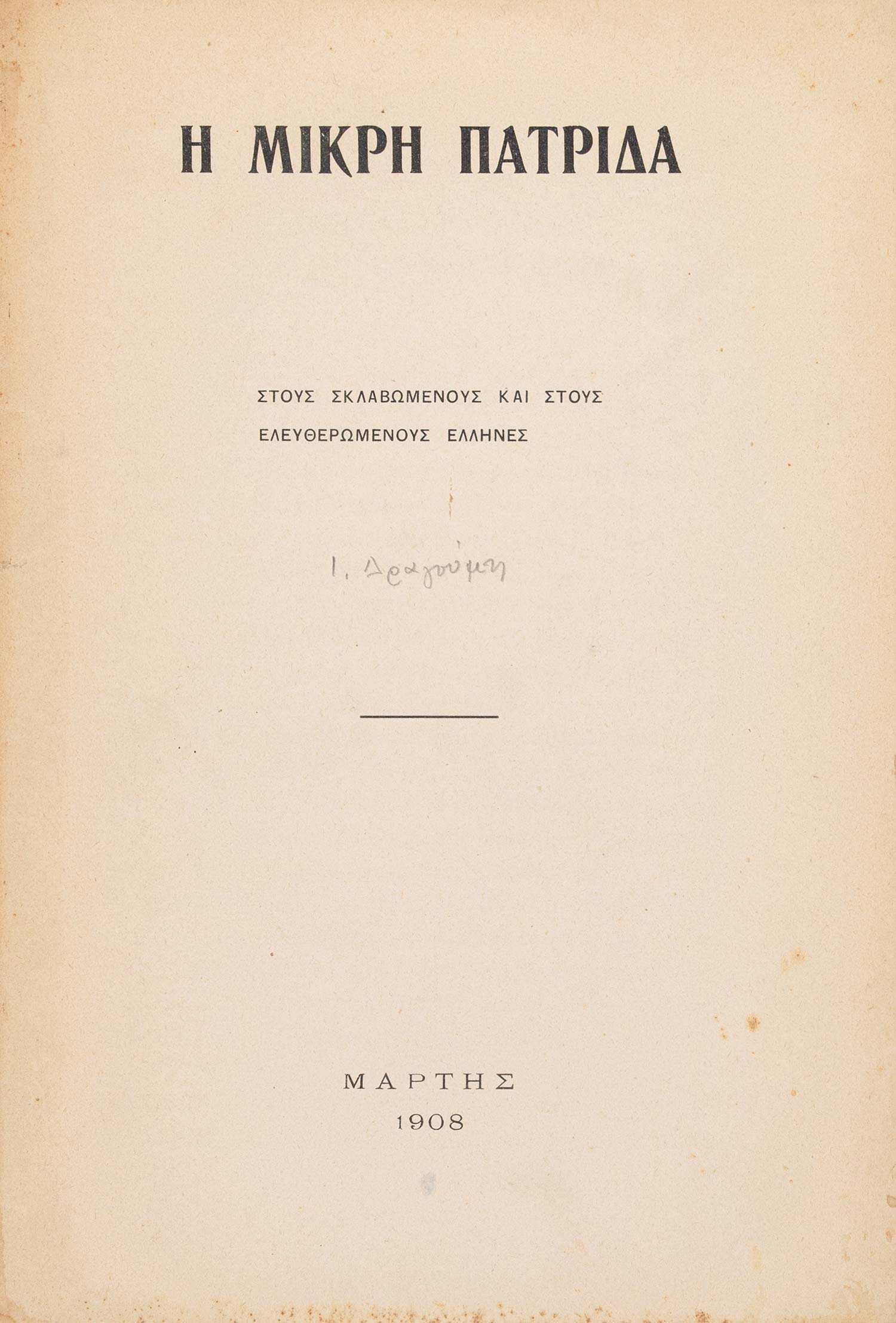 13 σ. Με έναν αναδιπλούμενο χρωμολιθόγραφο χάρτη. Χωρίς ιδιαίτερα εξώφυλλα. [μαζί, του ιδίου:] Ἡ μικρή πατρίδα. Στούς σκλαβωμένους καί στούς ἐλευθερωμένους Ἕλληνες. [Β΄ προκήρυξη]. χ.τ., Μάρτης 1908. • 15 σ. Χωρίς ιδιαίτερα εξώφυλλα. [μαζί, του ιδίου:] «ΙΔΑΣ». Στρατός καί ἄλλα. Γ´ προκήρυξη στούς ξεσκλαβωμένους καί στούς ἀξεσκλάβωτους Ἕλληνες, γιατί ἐλεύτεροι Ἕλληνες δέν ὑπάρχουν πιά ἤ ἀκόμη. Ρώμη, 7 Σεπτεμβρίου 1909. • 4ο (460 x 320 mm.), 7 σ. (μικρές φθορές από δίπλωμα του εντύπου στα τέσσερα, μικρές τρύπες στο τελευταίο φύλλο, σε μία με απώλεια μίας λέξης). Χωρίς ιδιαίτερα εξώφυλλα. • ΣΠΑΝΙΟ. [μαζί, του ιδίου:] Ἡ μεγάλη ἰδέα. χ.τ., 1908. • 10 σ. Χωρίς ιδιαίτερα εξώφυλλα. (4)