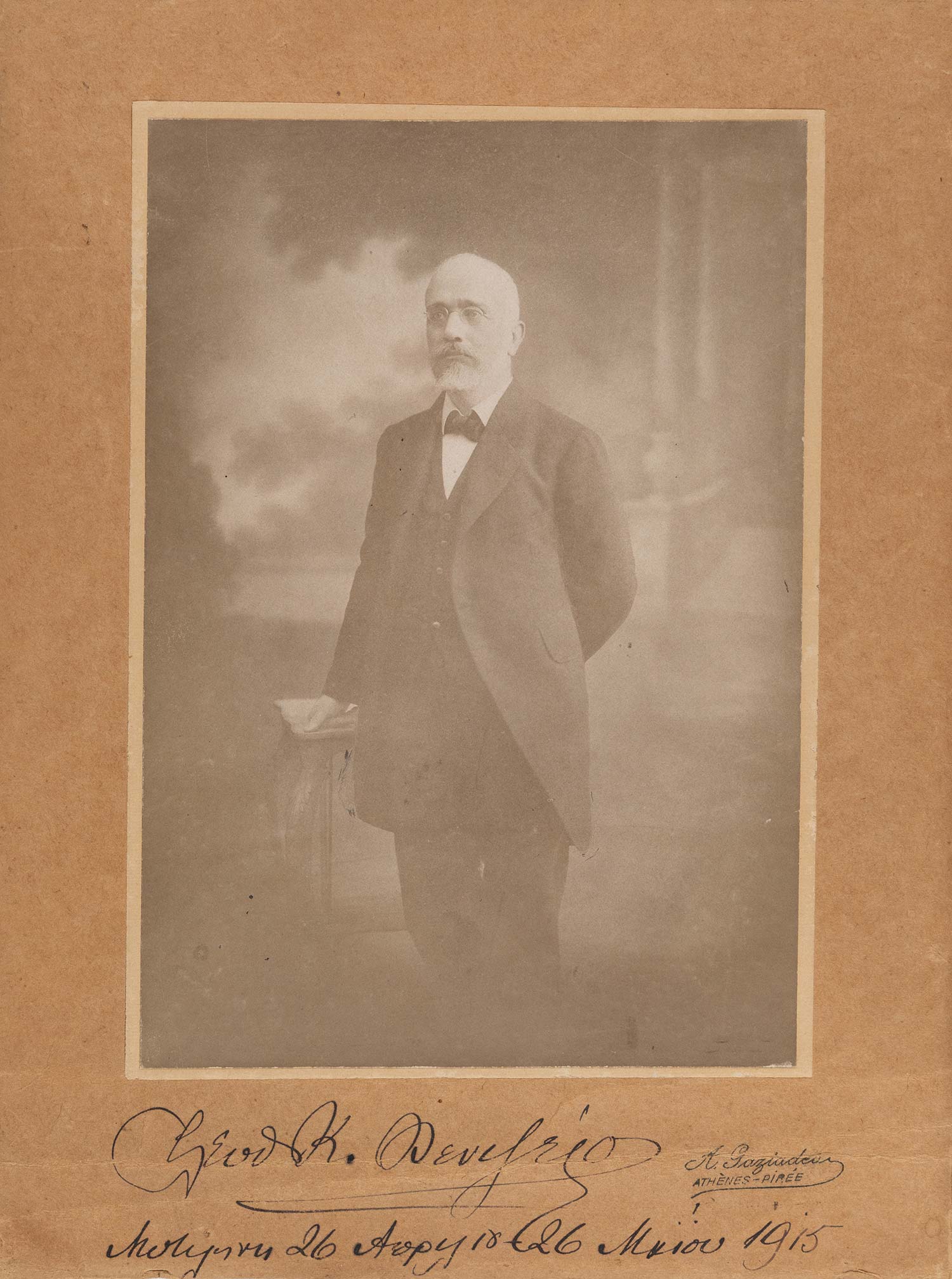 Υπογεγραμμένο στο πασπαρτού από τον Βενιζέλο («Ἐλευθ. Κ. Βενιζέλος / Μυτιλήνη 26 Απριλίου-26 Μαΐου 1915»), έντυπη υπογραφή του φωτογράφου στο πασπαρτού, τύπωμα αργύρου, 230 x 160 mm. (λίγο ξεθωριασμένο).
