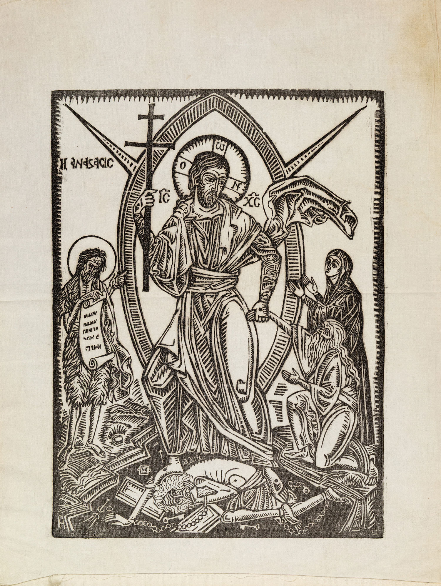 Ξυλογραφία σε πλάγιο ξύλο τυπωμένη σε ύφασμα, 400 x 295 mm. Υπογραφή με μονόγραμμα στην πλάκα. • Από όσο είναι γνωστό, η παρούσα ξυλογραφία τυπωμένη σε χαρτί κυκλοφόρησε σε 5 αντίτυπα.