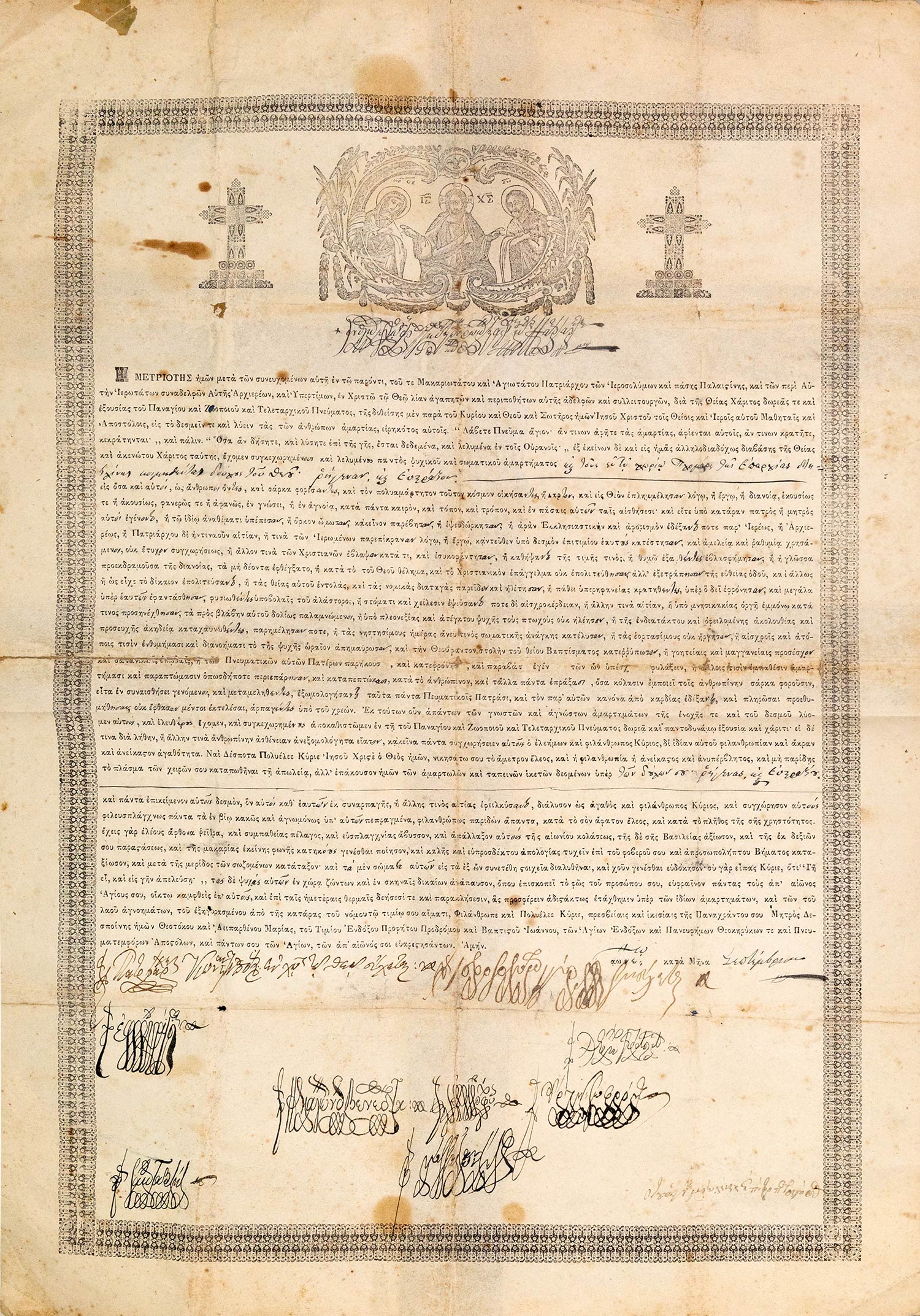 Μονόφυλλο, 640 x 450 mm. • Ὁ Πατριάρχης Ἄνθιμος ἐκδίδει τὸ παρὸν συγχωρητικὸ ἔγγραφο ὑπὲρ τῆς ψυχῆς τῶν κεκοιμημένων Ρήγενας καὶ Εὐστρατίου ἀπὸ τὸ Πλωμάρι τῆς ἐπαρχίας Μυτιλήνης. Στὸ ἐκτενέστατο αὐτὸ ἔγγραφο διατυπώνεται ἡ ἐντολὴ τοῦ Ἰησοῦ Χριστοῦ πρὸς τοὺς ἀποστόλους γιὰ τὴ δυνατότητα τῆς ἀπονομῆς ἄφεσης ἁμαρτιῶν τῶν πιστῶν καὶ κατ’ ἀκολουθίαν στοὺς διαδόχους τους καθὼς καὶ ἡ συγχωρητικὴ εὐχὴ, ἀφοῦ ἀναφερθεῖ πλῆθος ἐνδεχομένων ἁμαρτημάτων. Τὸ ἔγγραφο ὑπογράφεται ἀπὸ τὸν Πατριάρχη Κωνσταντινουπόλεως Ἄνθιμο κατὰ τὴν τρίτη καὶ τελευταία πατριαρχία του (24 Σεπτ. 1853-21 Σεπτ. 1855) καὶ συνυπογράφεται καὶ ἀπὸ τὸν Σάμιο Πατριάρχη Ἱεροσολύμων Κύριλλο Β΄ (1845-1872). Οἱ ὑπογραφὲς τῶν πατριαρχῶν: +Ὁ πατριάρχης Κωνσταντινουπόλεως ἐν Χριστῷ τῷ Θεῷ εὔχεται.- +Ὁ Ἱεροσολύμων συνεύχεται. Ἀκολουθοῦν μὲ μονοκονδυλιὰ οἱ ὑπογραφὲς τῶν συνοδικῶν ἀρχιερέων. Ἐφέσου Παΐσιος, Δέρκων Γεράσιμος, Πελαγωνίας Βενέδικτος , Ἰκονίου Νεόφυτος, Ἄρτης Σωφρόνιος, Σάμου Γαβριήλ, Νύσσης Ἰωαννίκιος, Ὁ τοῦ Ἁγίου Μυτιλήνης ἐπίτροπος Γρηγόριος. Στὴν κεφαλὴ τοῦ ἐγγράφου χαλκογραφημένη παράσταση τοῦ Χριστοῦ ἐν μέσω τῆς Θεοτόκου καὶ τοῦ μαθητοῦ Ἰωάννου. Ἔνθεν καὶ ἔνθεν δύο διακοσμημένοι σταυροί.