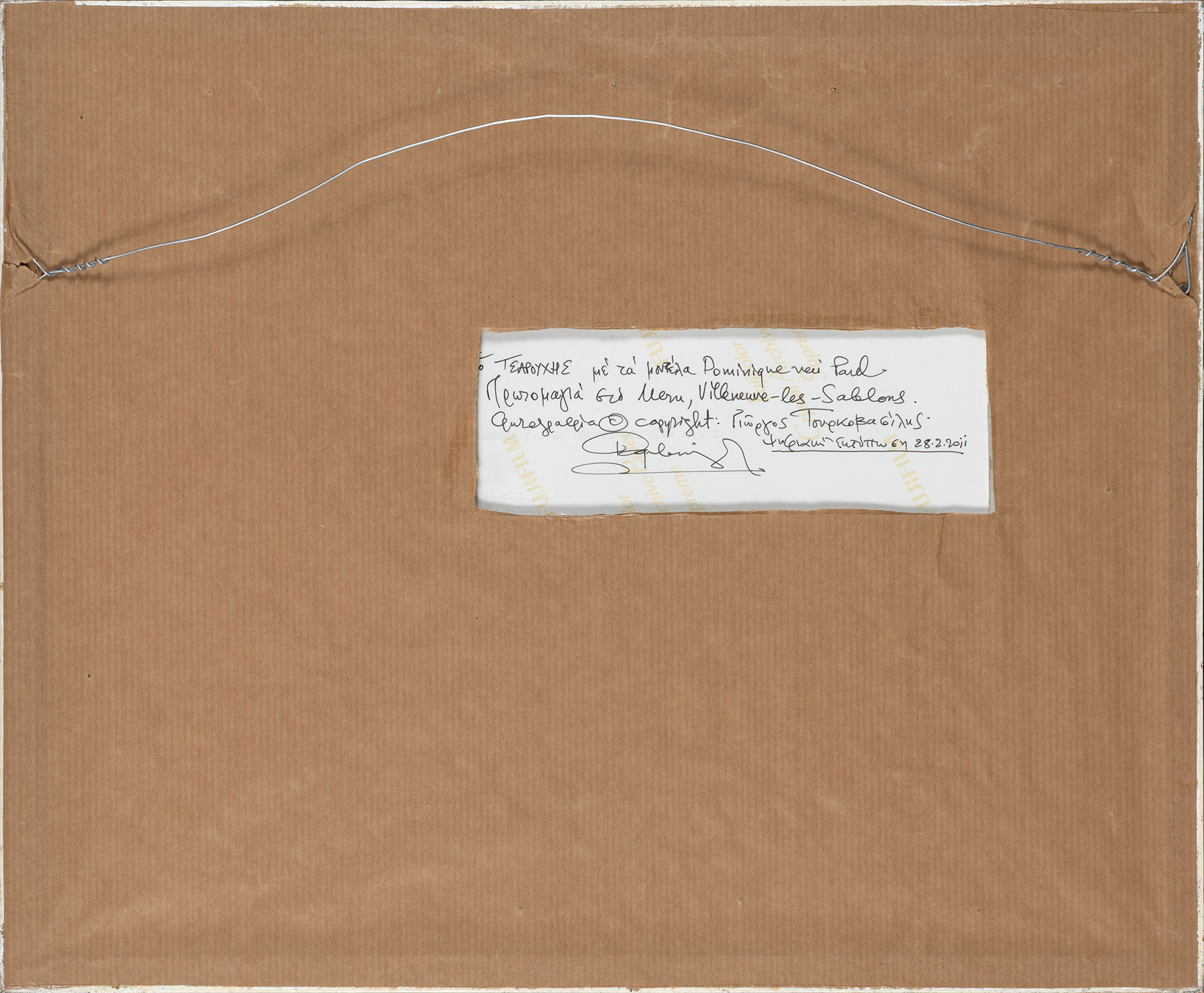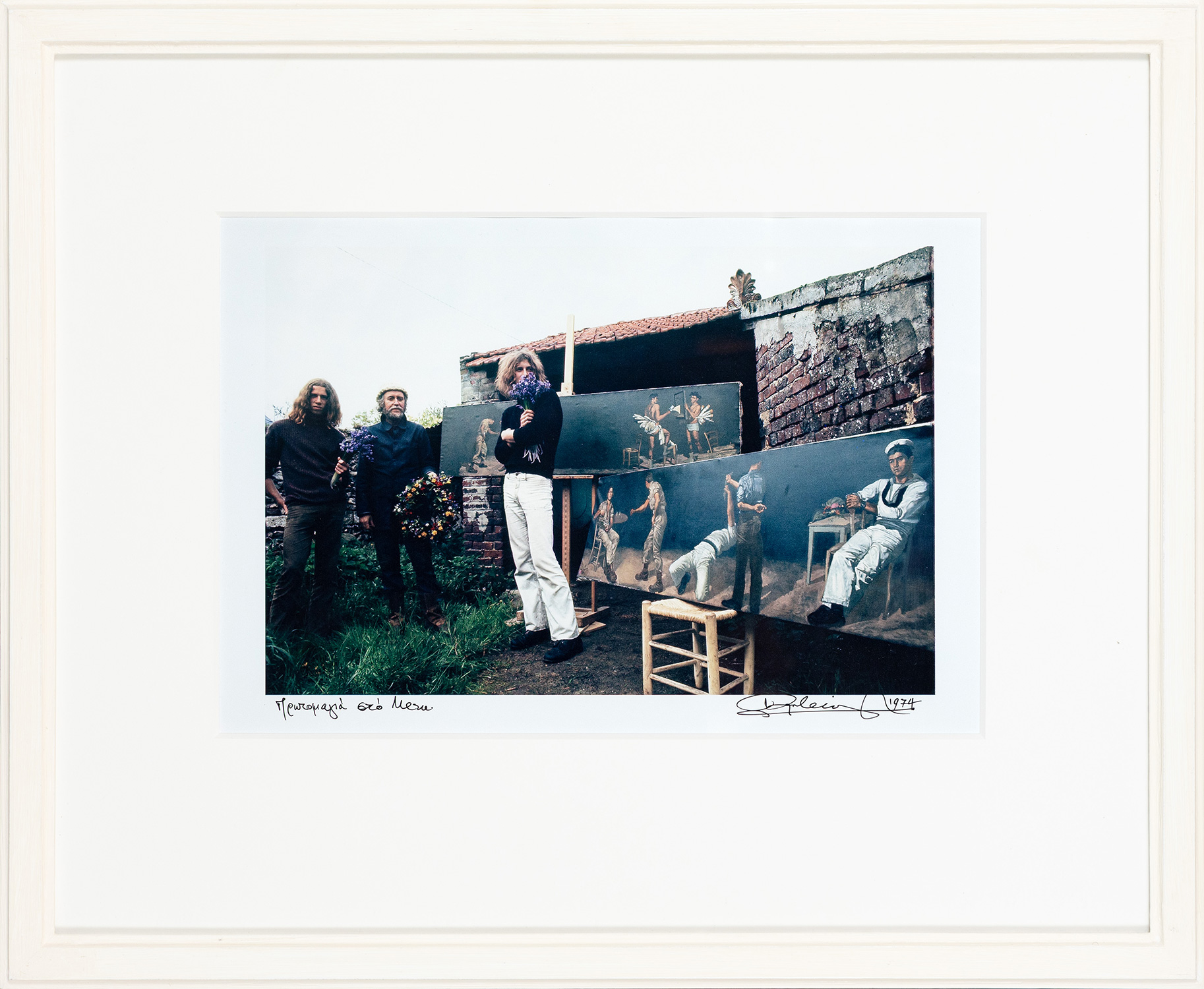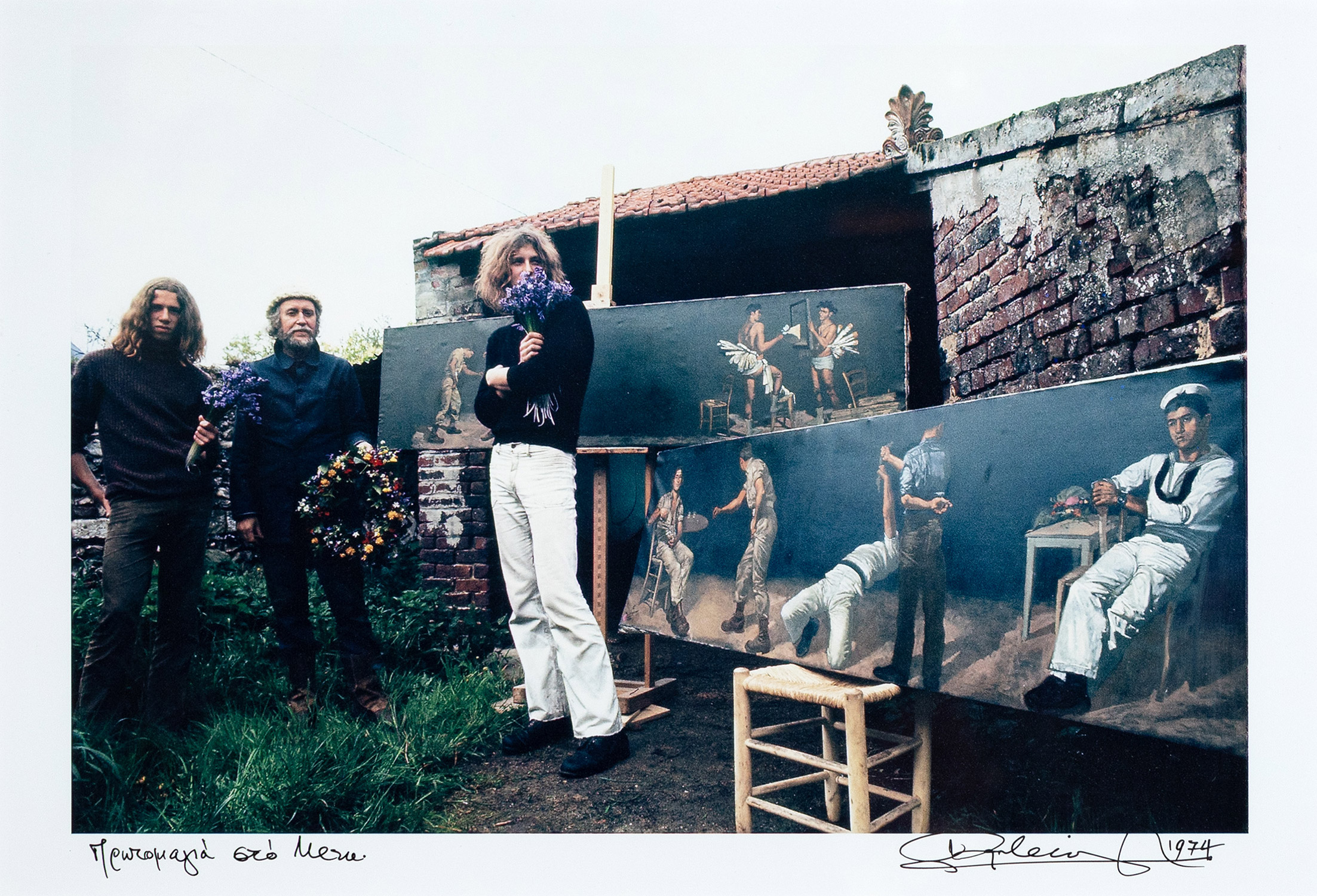 Τίτλος, υπογραφή και χρονολογία στο κάτω περιθώριο, υπογραφή και σημείωση του φωτογράφου στην πίσω όψη («Ὁ Τσαρούχης μέ τά μοντέλα Dominique καί Paul. Πρωτομαγιά στό Meru, Villeneuve-les-Sablons.»), λήψη του 1974, ψηφιακή εκτύπωση του 2011, 165 x 245 mm. Σε κορνίζα.