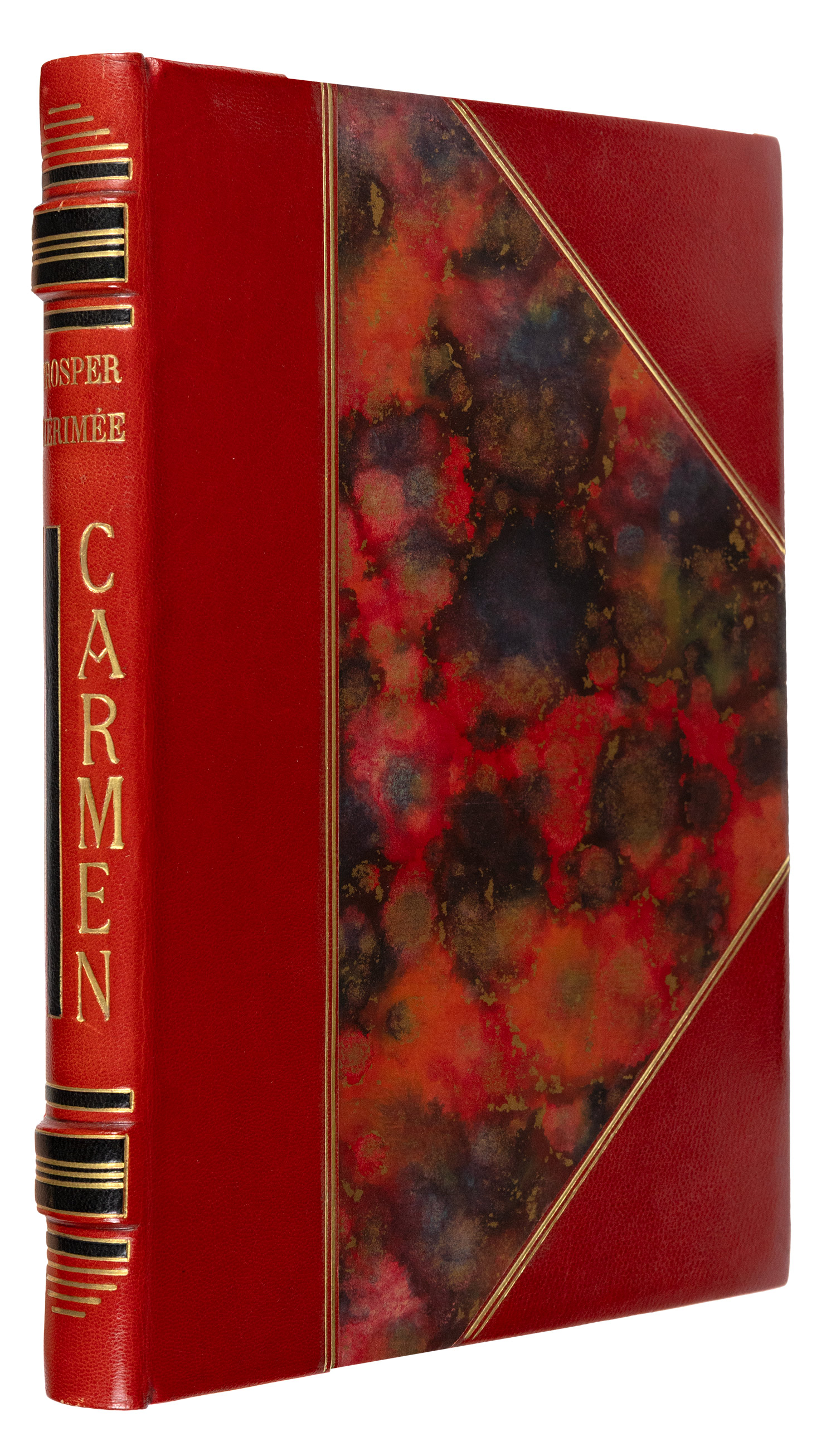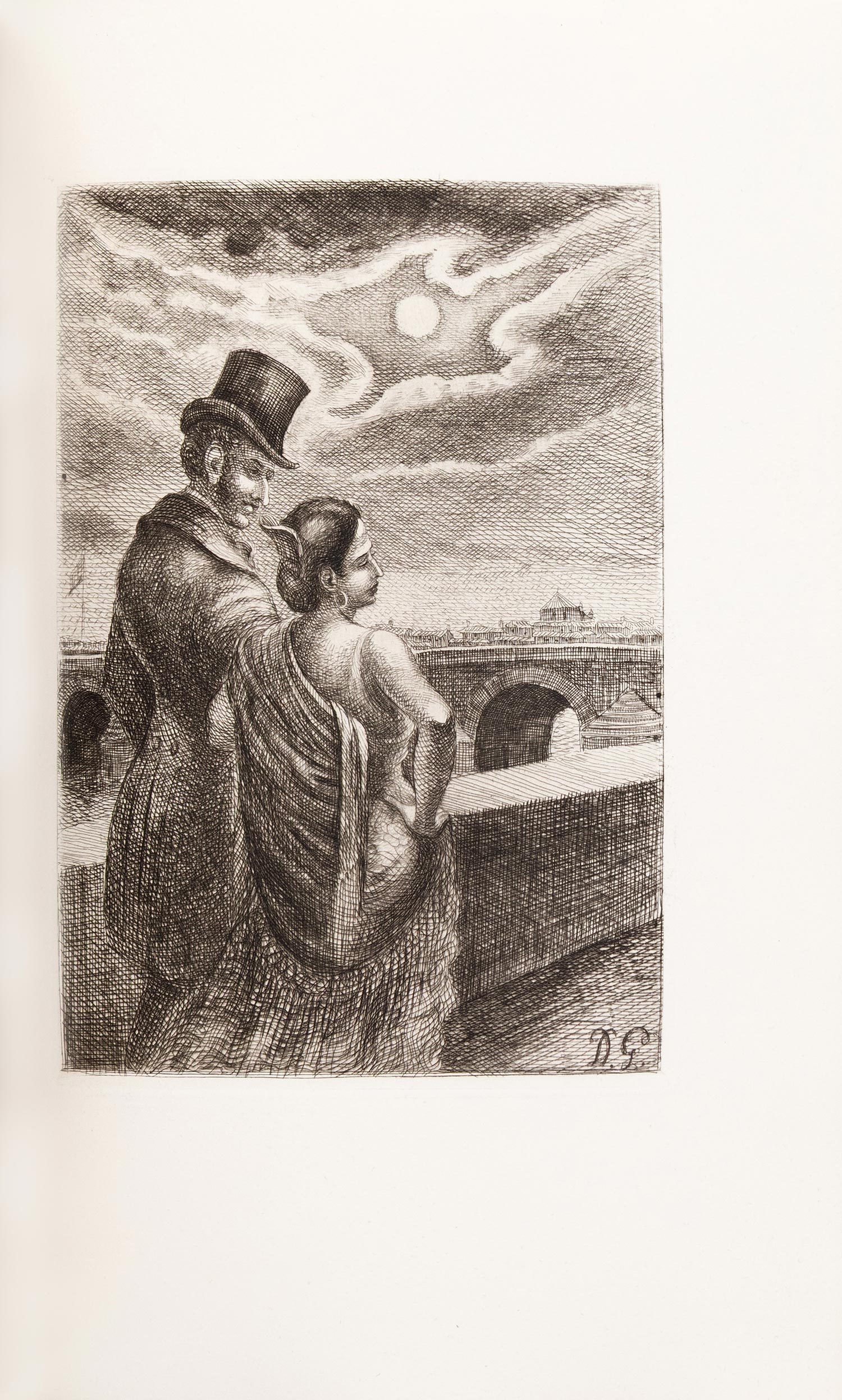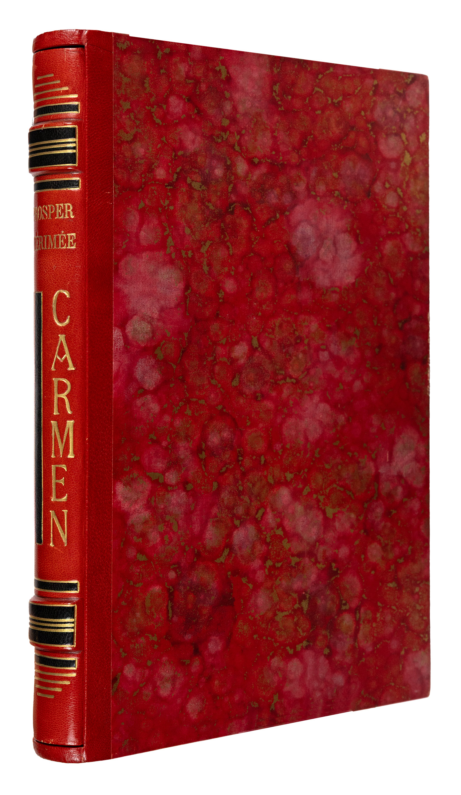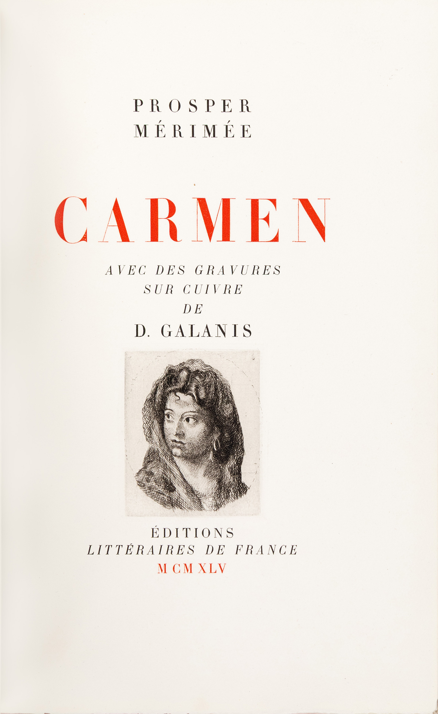 161 σ. Έκδοση περιορισμένη σε 336 αριθμημένα αντίτυπα, το συγκεκριμένο σε χαρτί vélin de Rives, με 20 χαλκογραφίες εντός κειμένου του Δημητρίου ΓΑΛΑΝΗ (οι 12 ολοσέλιδες). Κόκκινο μαροκινό στη ράχη και τις γωνίες (διακόσμηση με χρυσό και μικρές λωρίδες μαύρου δέρματος στη ράχη, διπλή χρυσή γραμμή στα καλύμματα, τα καλύμματα και τα ακρόφυλλα επενδυμένα με μαρμαρόκολλα, έχει διατηρηθεί το πάνω αρχικό εξώφυλλο, χρυσωμένη η πάνω ακμή, αξάκριστες οι υπόλοιπες), θήκη επενδυμένη με μαρμαρόκολλα, επένδυση με δέρμα στο άνοιγμα. Γαλάνης (Εικονογραφημένα) 1946/1. • ΩΡΑΙΑ ΒΙΒΛΙΟΔΕΣΙΑ.
