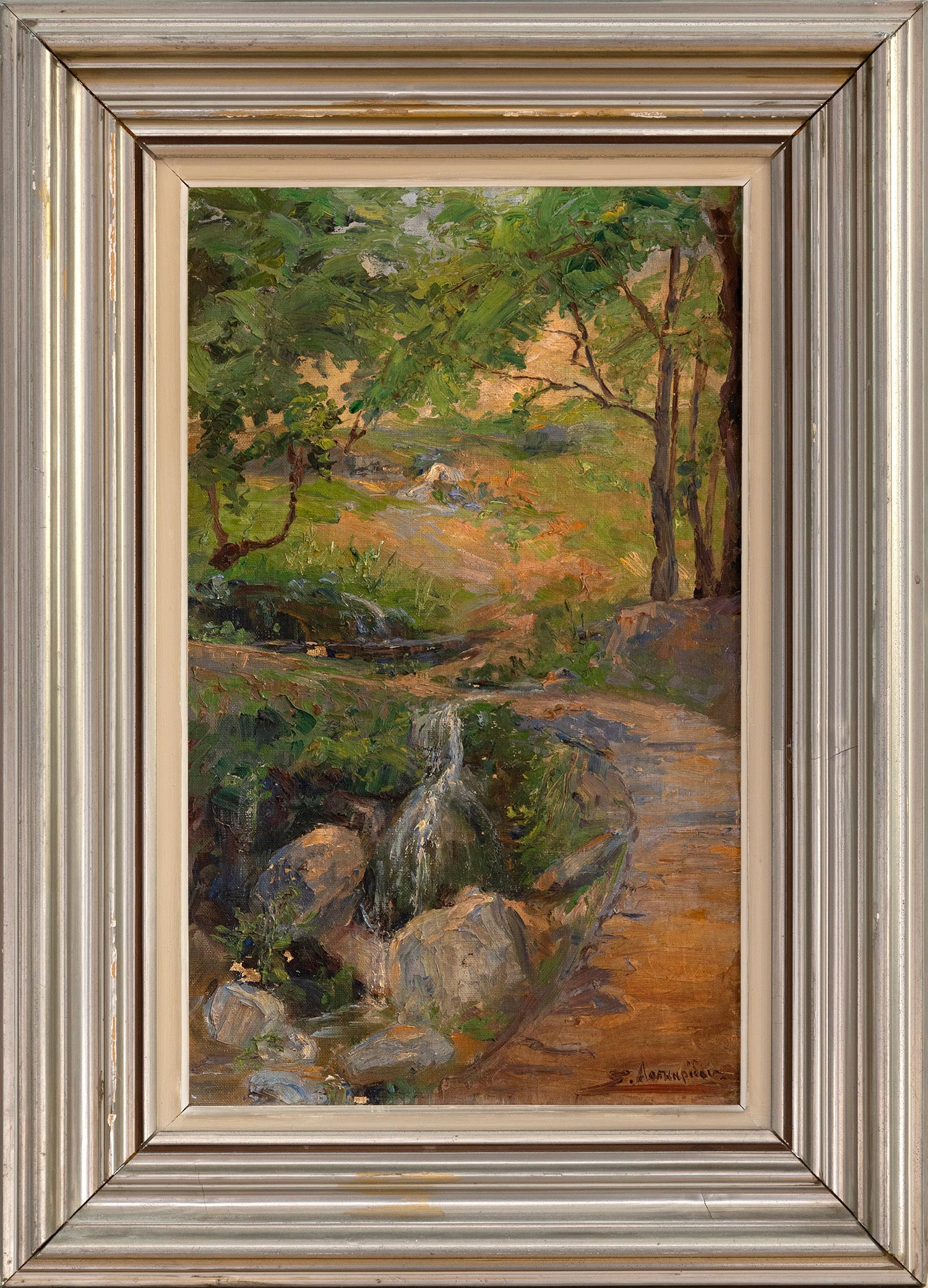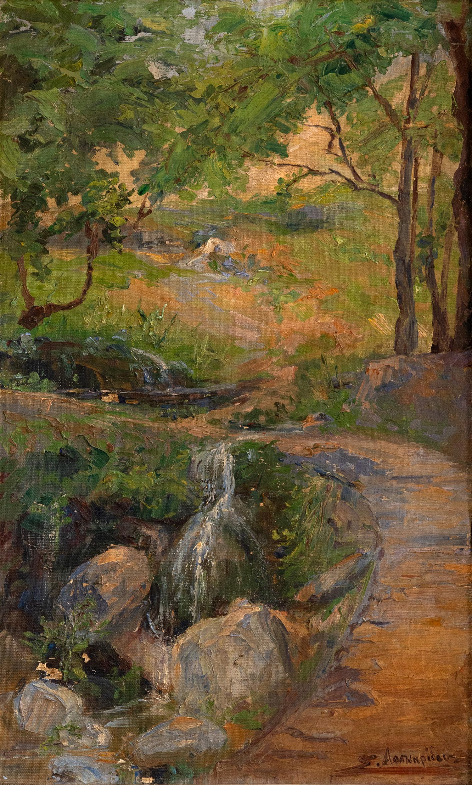 Λάδι σε hardboard, 438 x 268 mm. (μικρές φθορές). Υπογεγραμμένο κάτω δεξιά: «Σ. Λασκαρίδου». Σε κορνίζα.