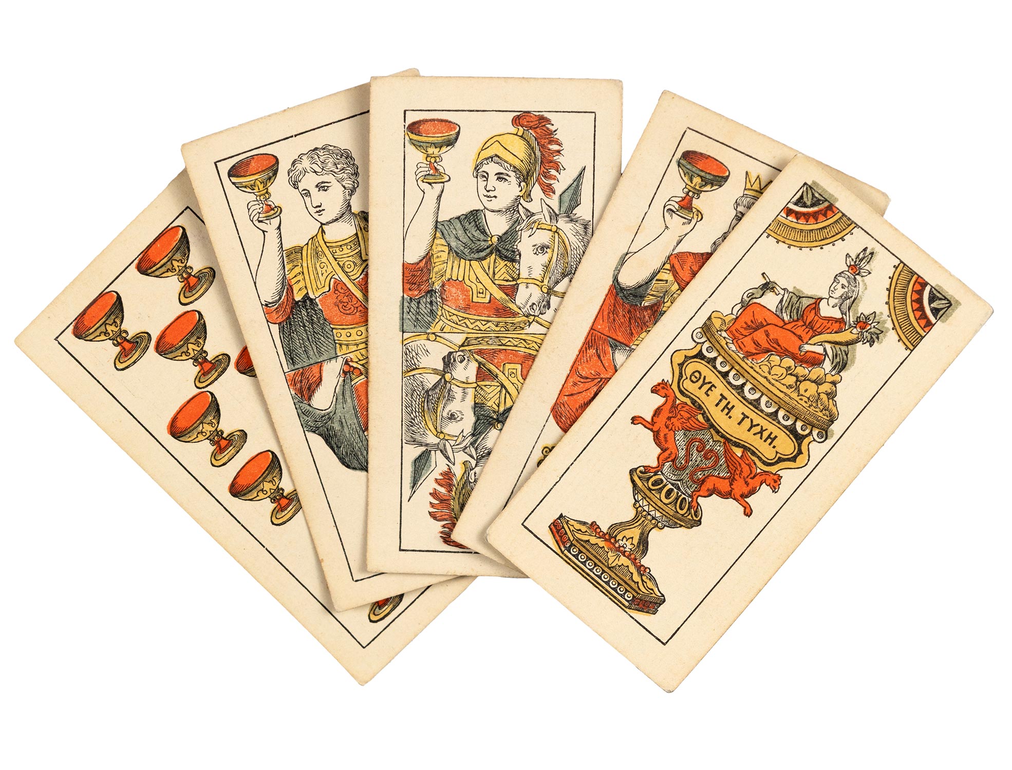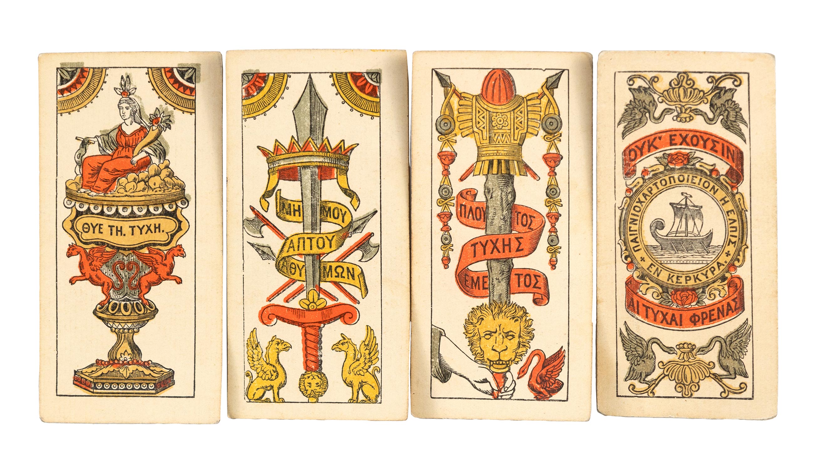 Πλήρης τράπουλα 52 τεμαχίων, λιθογραφία σε φύλλα από λεπτό χαρτόνι, επιχρωματισμένη με το χέρι, 95 x 47 mm. (52) • Το εργοστάσιο γραφικών τεχνών Ἐλπίς, προπομπός της εταιρείας Ασπιώτη-ΕΛΚΑ, υπήρξε το πρώτο εργαστήριο μαζικής παραγωγής παιγνιοχάρτων στην Ελλάδα.
