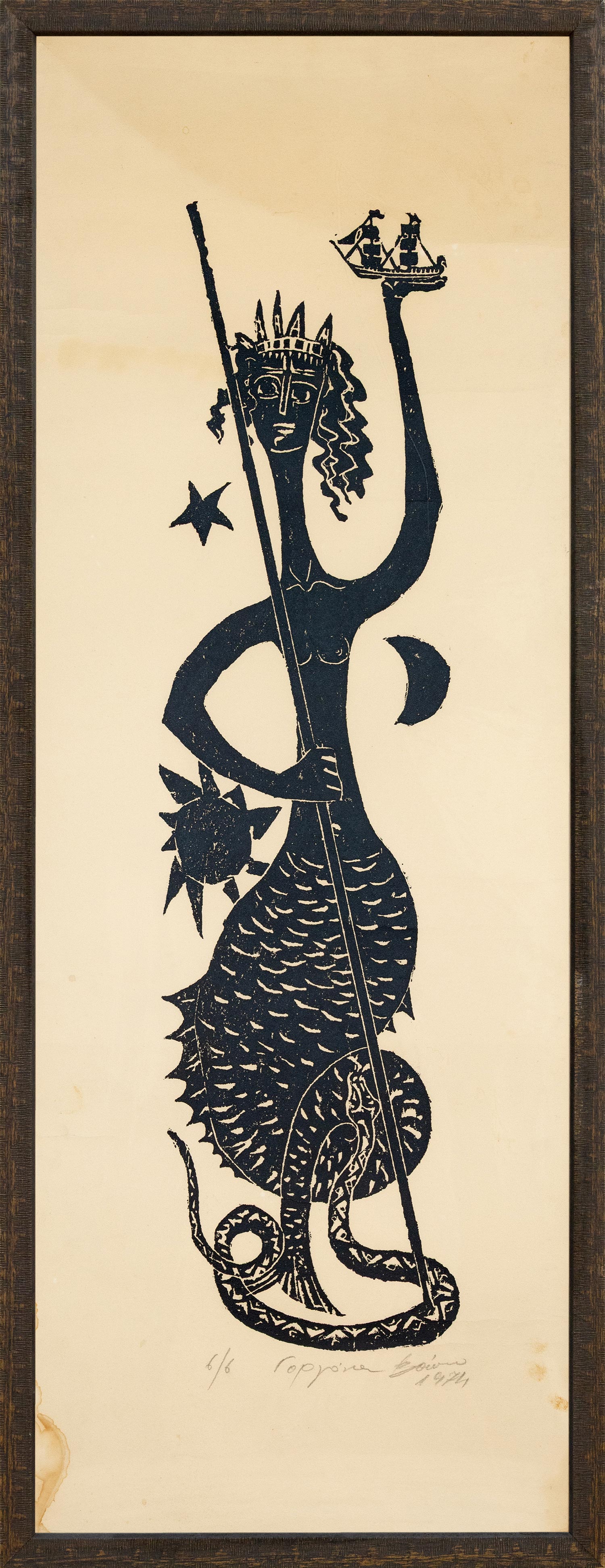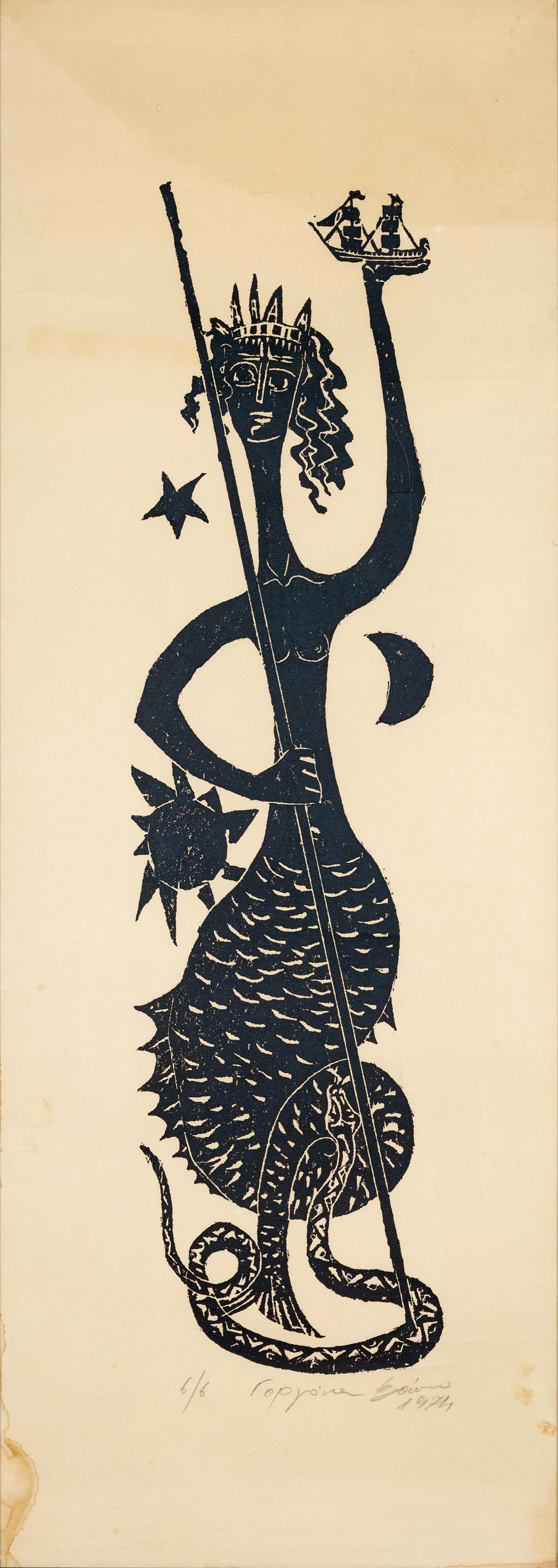 Χάραγμα σε πέτρα, 790 x 210 mm. (λεκές από νερό στο αριστερό περιθώριο). Έκδοση σε 6 αντίτυπα, αρίθμηση, τίτλος, υπογραφή και χρονολογία στο κάτω περιθώριο με μολύβι. Σε κορνίζα.