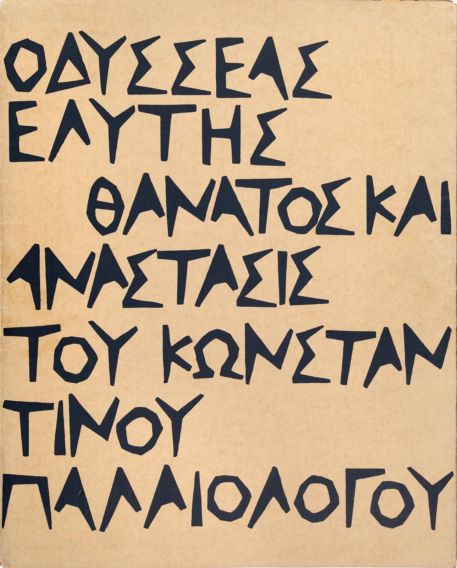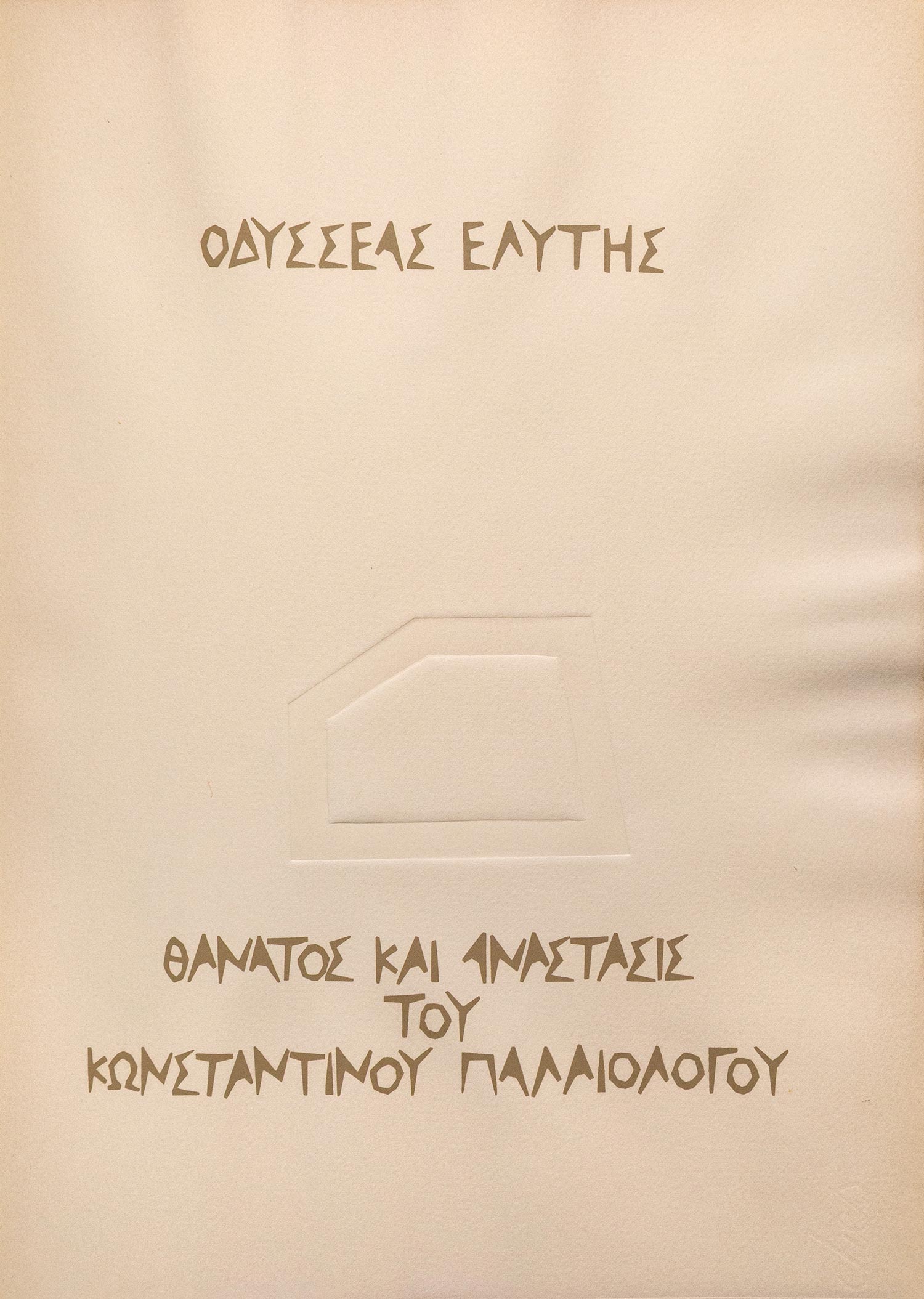 4ο (382 x 282 mm.), [32] σ. Έκδοση περιορισμένη σε 111 αριθμημένα αντίτυπα σε χαρτί vélin d’arches, με 3 ανάγλυφα χαρακτικά (με πίεση στο χαρτί) εντός κειμένου του Κώστα ΚΟΥΛΕΝΤΙΑΝΟΥ (το ένα ολοσέλιδο), το κείμενο με γράμματα χαραγμένα από τον καλλιτέχνη και τυπωμένο με τη μέθοδο της μεταξοτυπίας, όλα τα αντίτυπα υπογεγραμμένα από τον ποιητή και τον γλύπτη, σε άρραφα δίφυλλα (όπως κυκλοφόρησε). Αρχικά εξώφυλλα (μικρές φθορές στη ράχη), χωρίς τη χάρτινη θήκη.