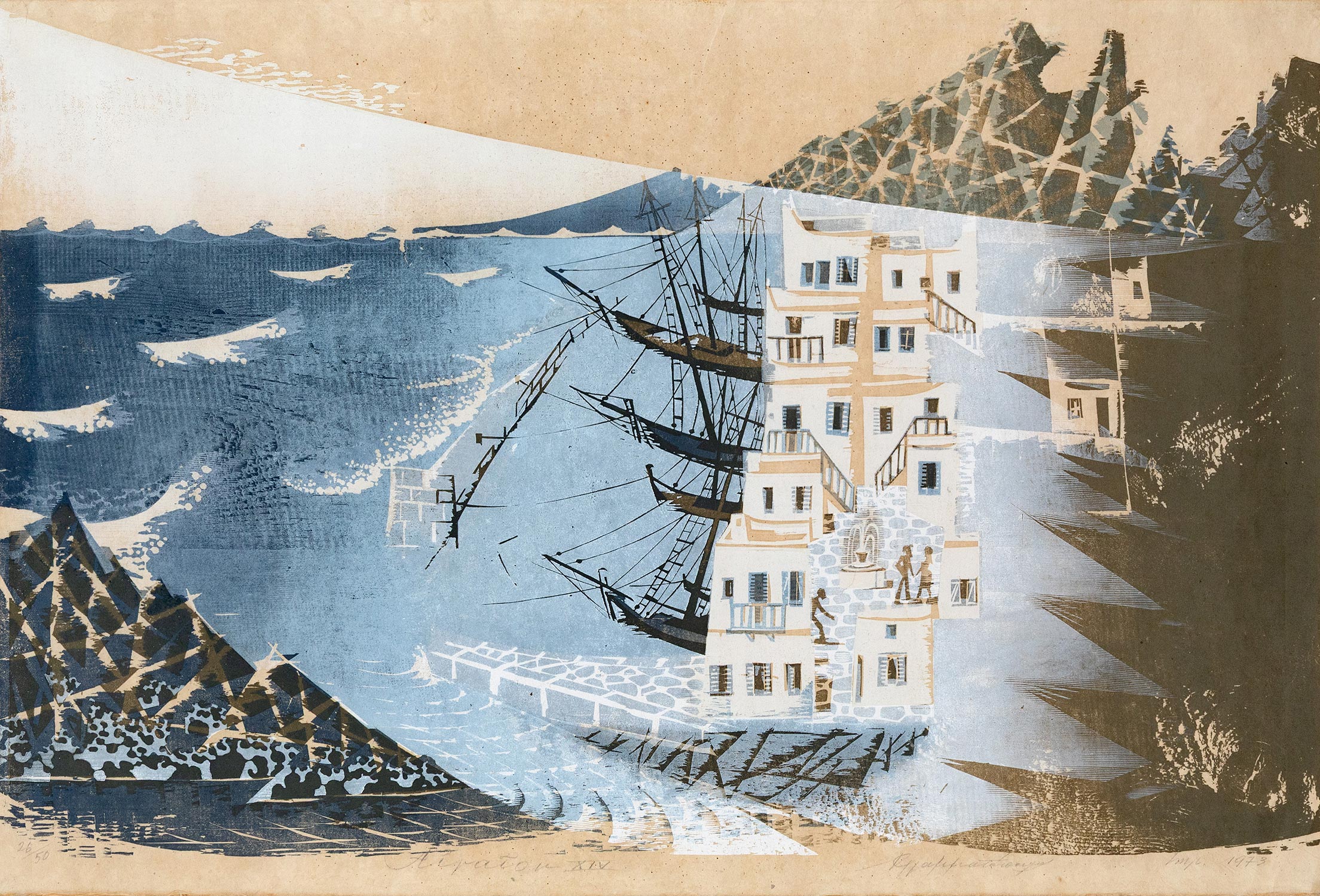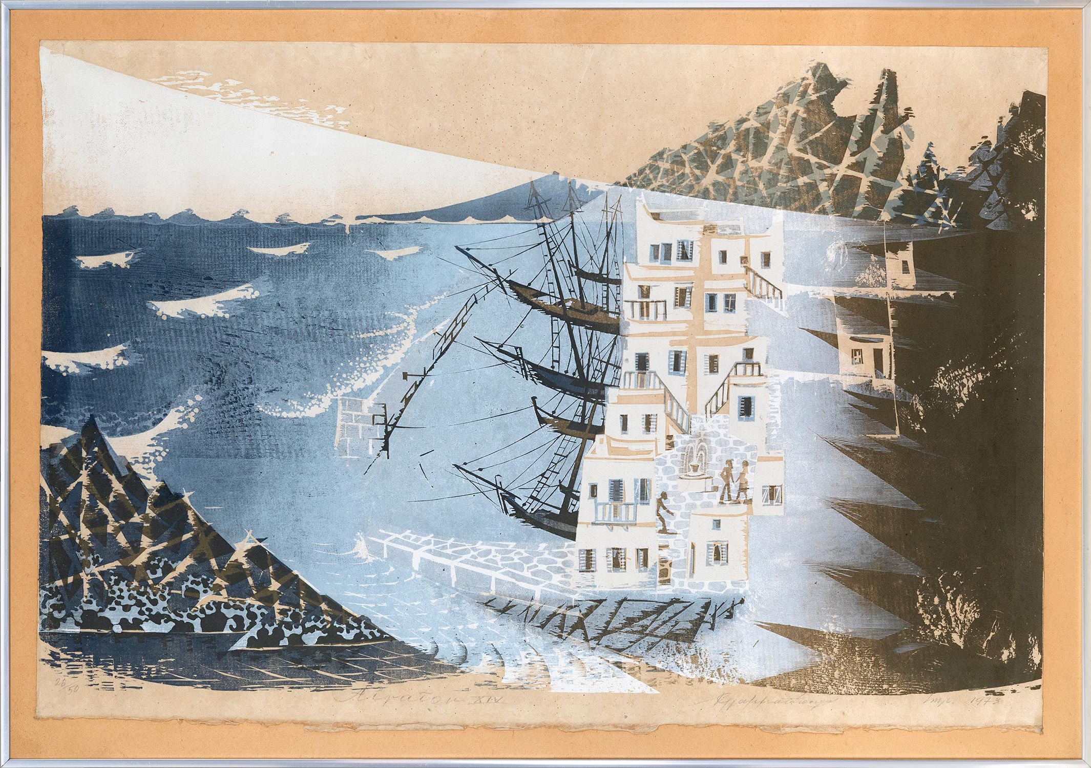 Έγχρωμη ξυλογραφία σε πλάγιο ξύλο, 585 x 905 mm. Έκδοση σε 50 αντίτυπα, αρίθμηση, τίτλος, υπογραφή και χρονολογία στο κάτω περιθώριο με μολύβι. Σε κορνίζα.