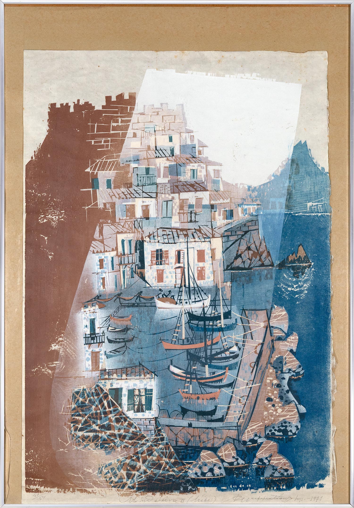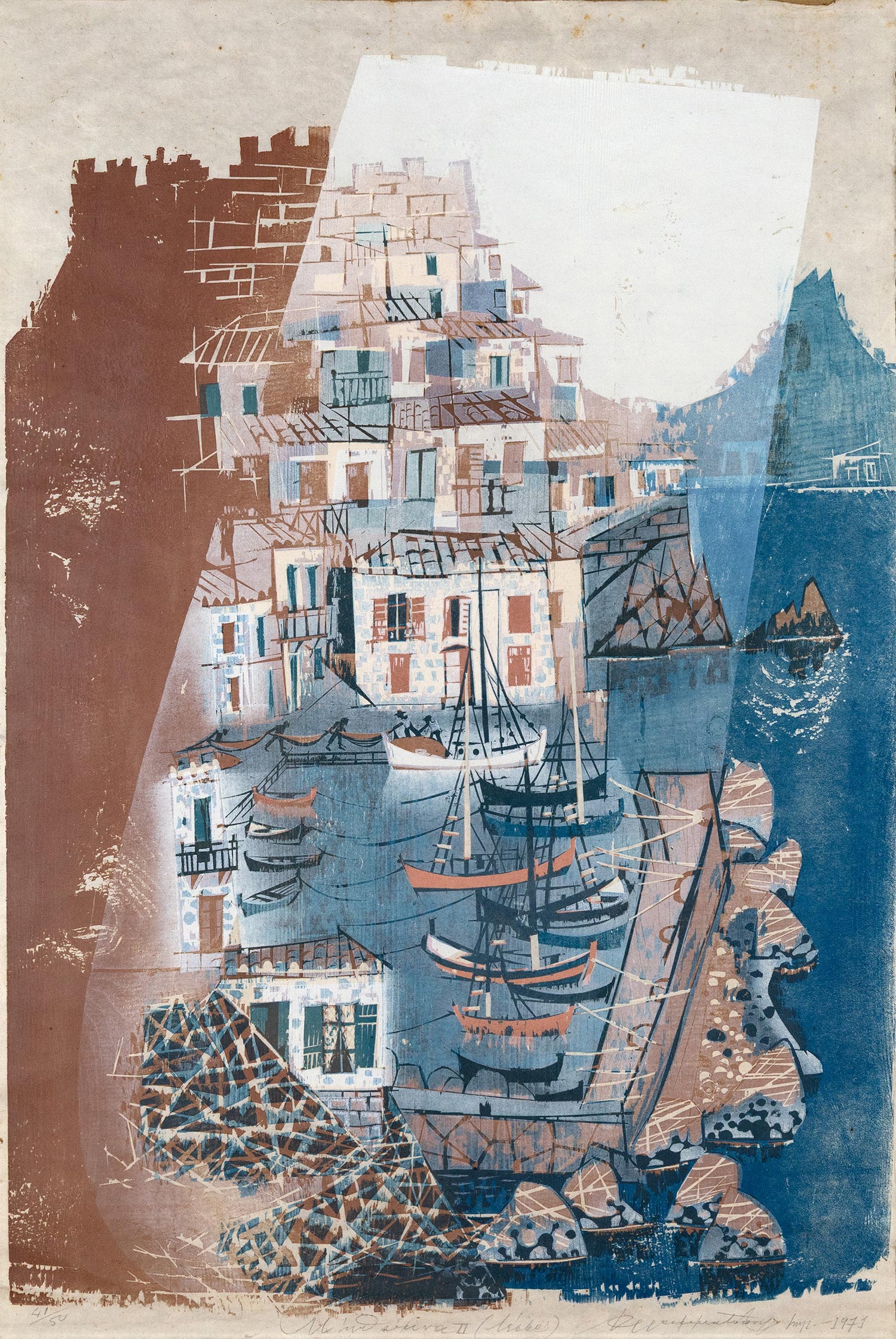 Έγχρωμη ξυλογραφία σε πλάγιο ξύλο, 850 x 605 mm. Έκδοση σε 50 αντίτυπα, αρίθμηση, τίτλος, υπογραφή και χρονολογία στο κάτω περιθώριο με μολύβι. Σε κορνίζα (σπασμένο το τζάμι στην κάτω αριστερή γωνία).