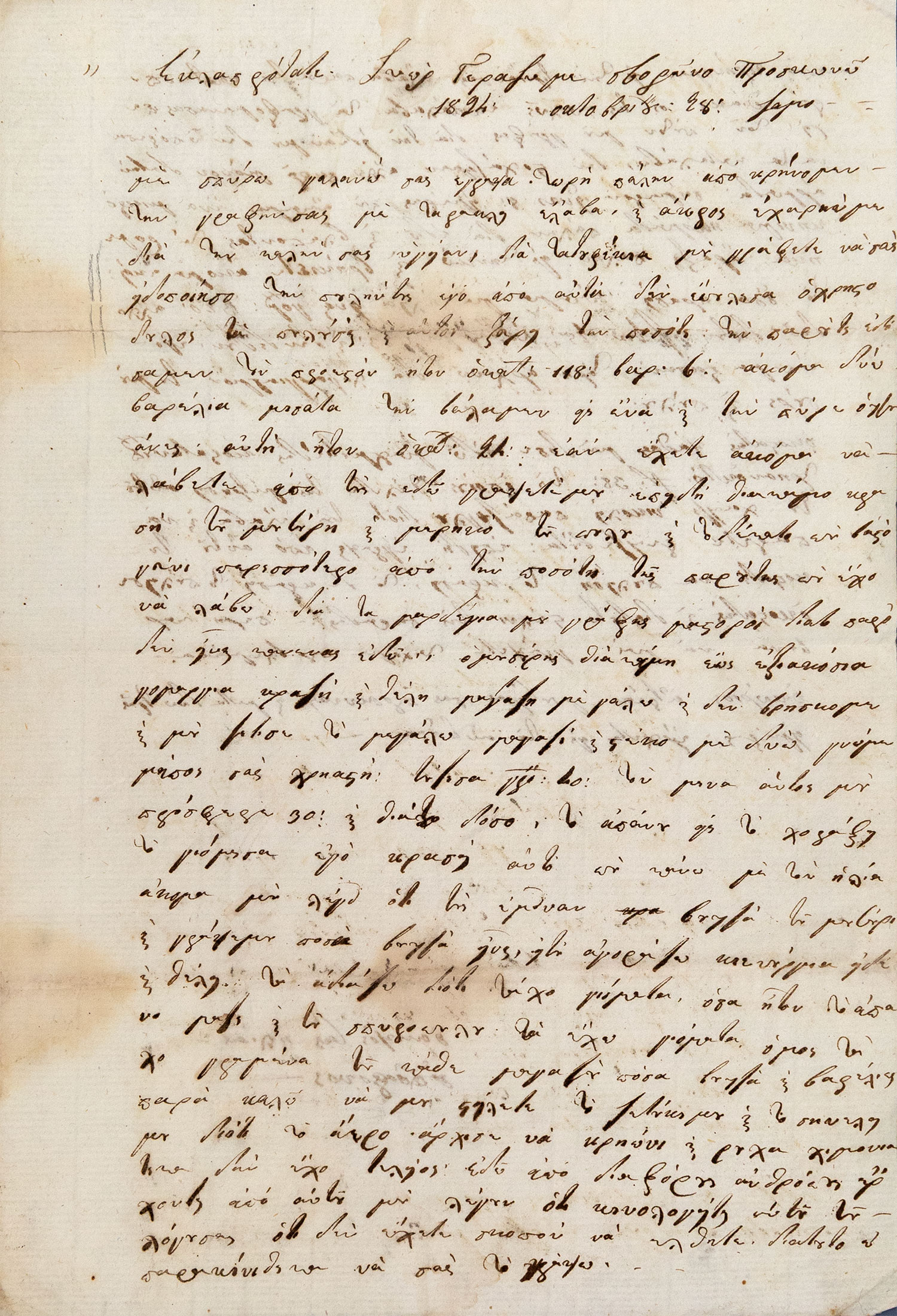 Δίφυλλο, 315 x 215 mm. (ὑδατόσημο μὲ τὰ γράμματα ΑG καί τρία καπελάκια μὲ φτερό). Ὁ ἐπιστολογράφος ἀναφέρεται σὲ ἐμπορικὴ δοσοληψία μὲ τὸν θεῖο του, ὁ ὁποῖος ὑπῆρξε τὸ πρῶτο μέλος τῆς Φιλικῆς Ἑταιρείας στὴ Σάμο. Γίνεται λόγος γιὰ πώληση τουφεκιῶν, πυρίτιδας καὶ κρασιοῦ. «Διὰ τὰ τουφέκια μοῦ γράφετε νὰ σᾶς εἰδοποιήσω τὴν πουλήν τους. Ἐγὼ ἀπὸ αὐτὰ δὲν ἐπούλησα. Ὁ Χριστόδουλος τὰ πούλησε καὶ αὐτὸς ξεύρει».