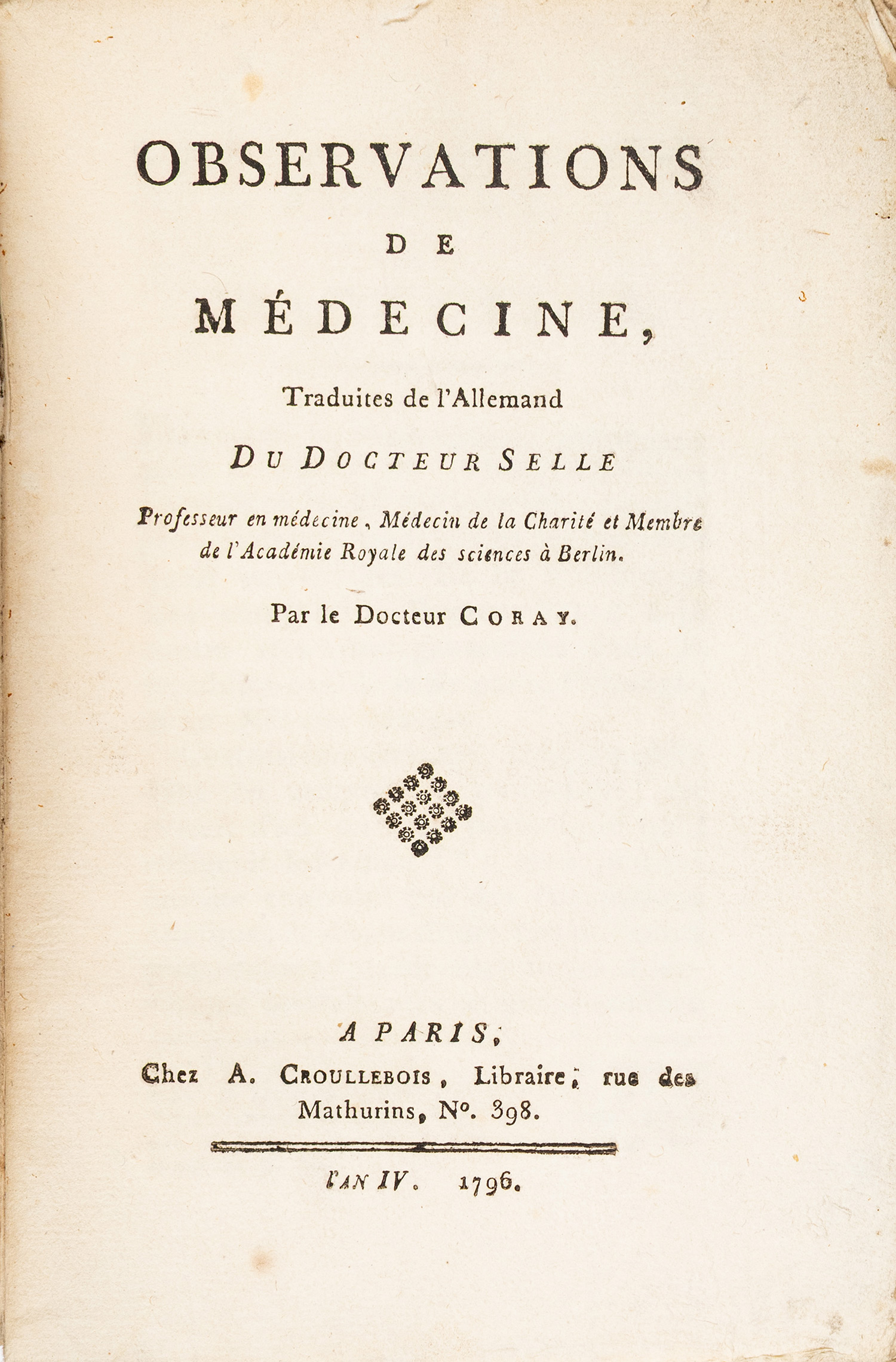 Observations de médecine, traduites de l’allemand par le docteur Coray.