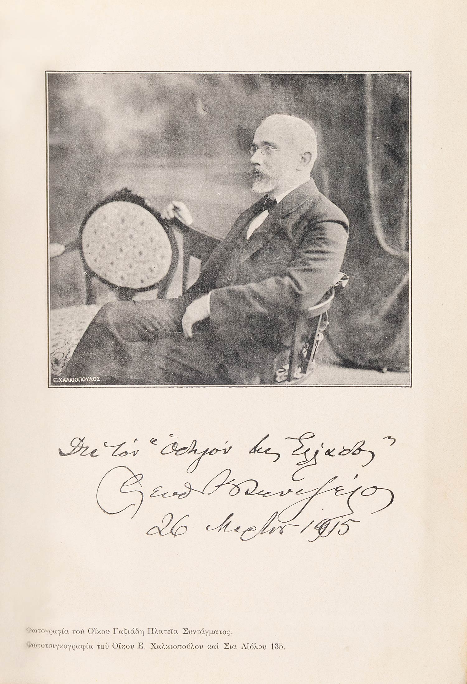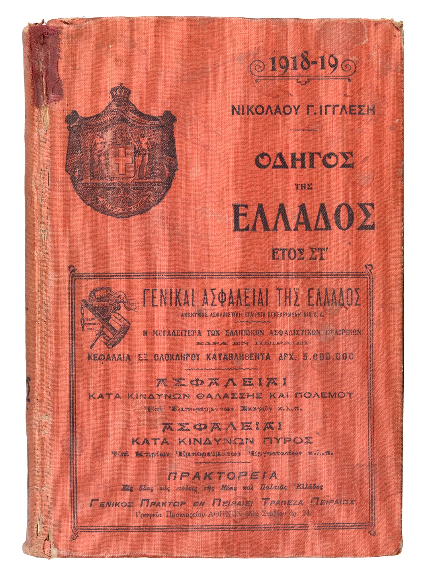 4ο, [18] + (26)-59 + [2] + (638)-672 + (101)-112 + (132)-161 + (256)-269 + (258)-334 + (338)-452 + (456)-580 + (188)-204 + (599)-604 + (215)-244 + (636) + (549)-578 + (668)-674 + [2] + (587)-594 + (686)-«694-610»-631 + [30] + (16)-32 + (58)-96 + (33)-56 + (97)-156 + (852)-867 + (891-893) + (904)-912 + [18] + (923)-960 + (1051)-1182 + [4] + (326)-384 + (390)-439 + (443)-856 + (873)-974 + [26] + (8)-23 +(33)-56 + [4] + (38)-«56-88»-200 + (193) -266 +[4] σ. (χάσματα στη σελιδαρίθμηση, μικρό σχίσιμο στον χάρτη, μικρά σχισίματα σε λίγα φύλλα). Με έναν αναδιπλούμενο λιθόγραφο χάρτη της Ελλάδας, 3 εικόνες εκτός κειμένου, πολυάριθμες διαφημίσεις εντός κειμένου και στα ακρόφυλλα. Αρχικό πανί του εκδότη (μικρές φθορές κυρίως στη ράχη, λερωμένο).