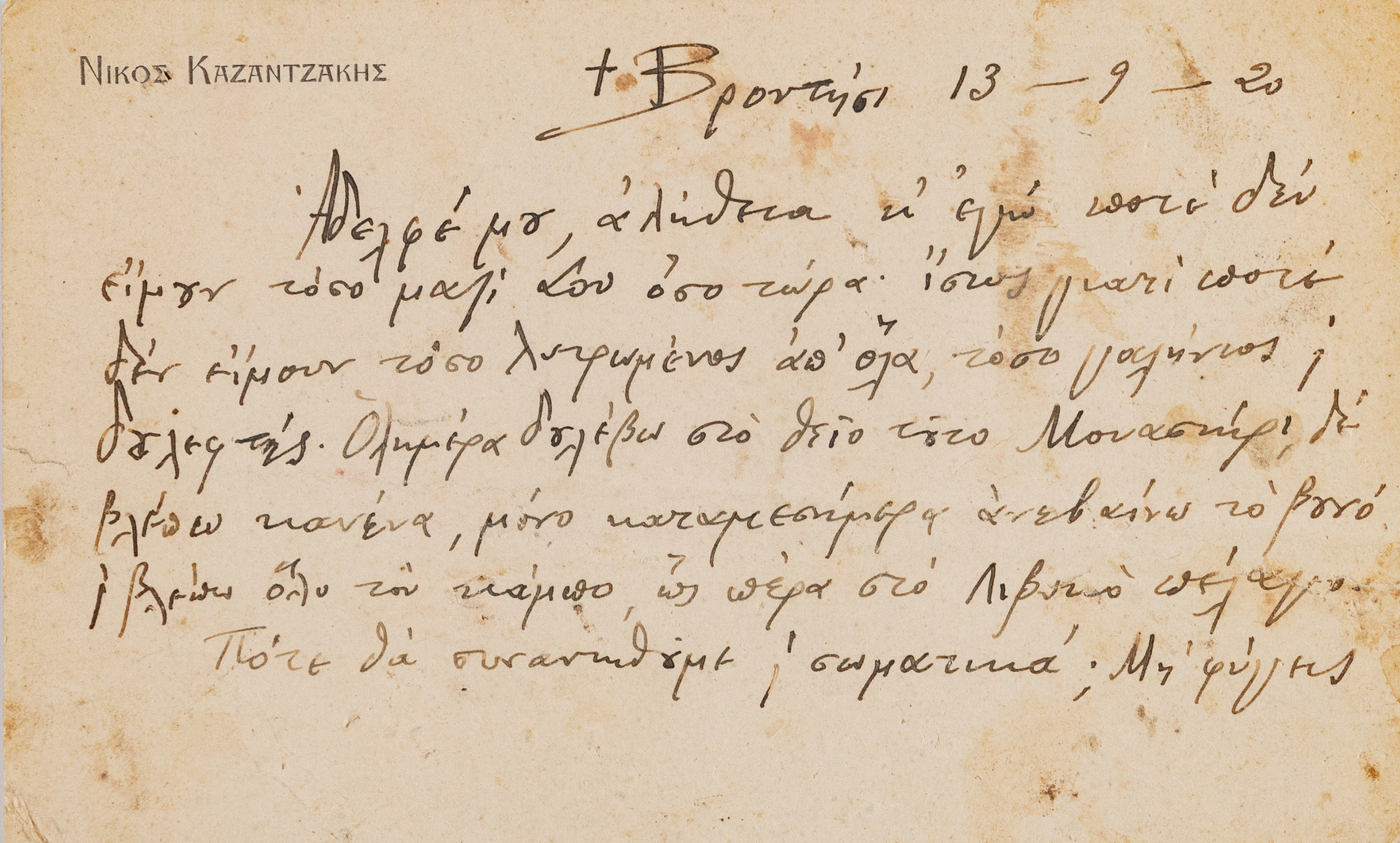 Γραμμένη στις δύο όψεις κάρτας, 80 x 132 mm. (λίγο λερωμένη). Έντυπη επικεφαλίδα («ΝΙΚΟΣ ΚΑΖΑΝΤΖΑΚΗΣ»). • «... Πότε θά συναντηθούμε κ΄σωματικά; Μή φύγεις ἀπό τήν Ἑλλάδα πρί νά μοῦ τό μηνήσεις. Προχτές εἴδα ὄνειρο πώς ὅλη ἡ γῆς εἴτανε σάν ἕνας ἀνθός λεμονιᾶς μέ δυό στήμονες κ΄μέσα στόν ὕπνο μου βαθύτατα ἀνανοήθηκα τούς δυό μας ν’ ἀγωνίζουνται, παραστάτες στή μυστική Μήτρα τοῦ Χάους. Θεέ μου πόσο εἶμαι ἥσυχος, χαρούμενος, μαζί Σου!...».