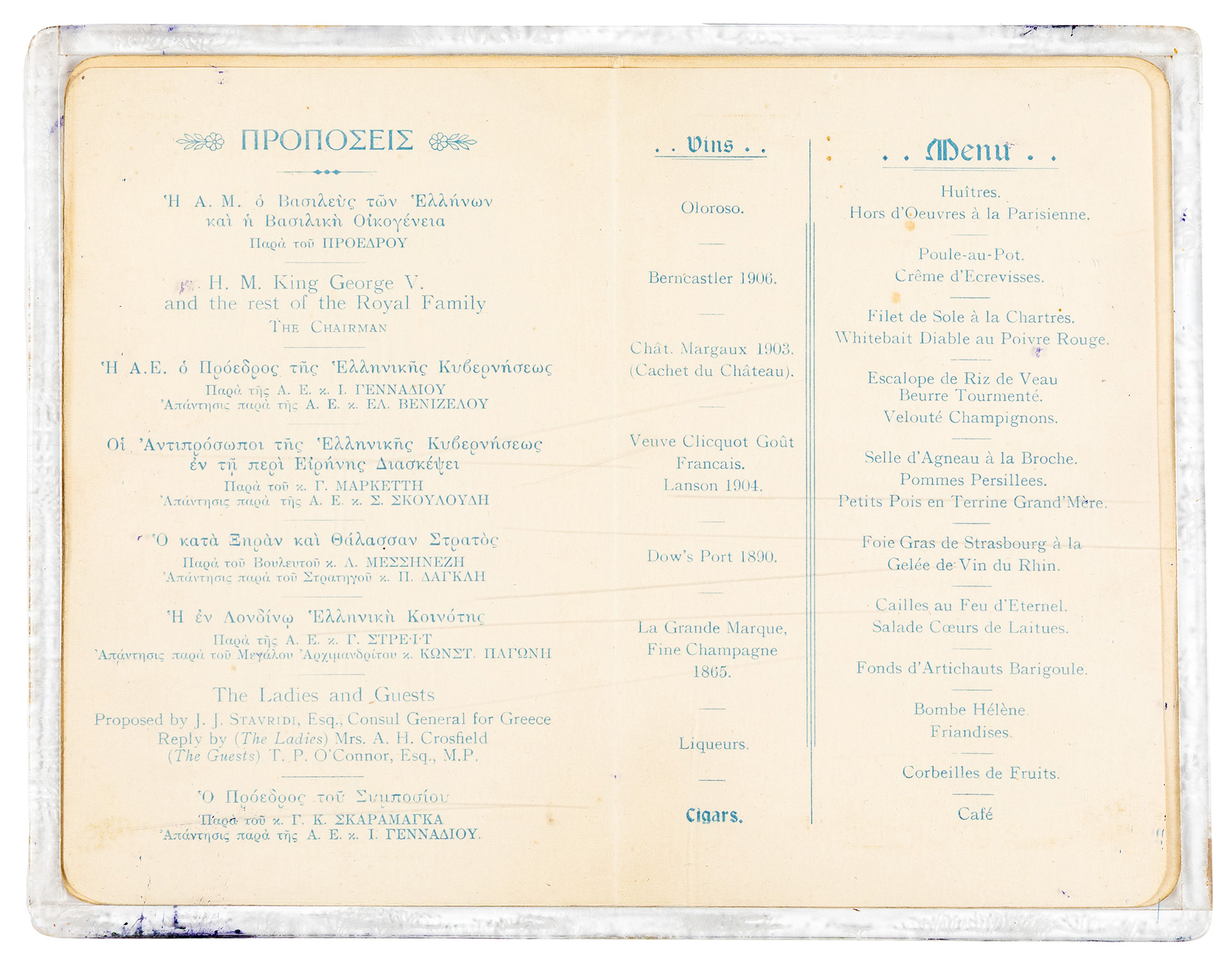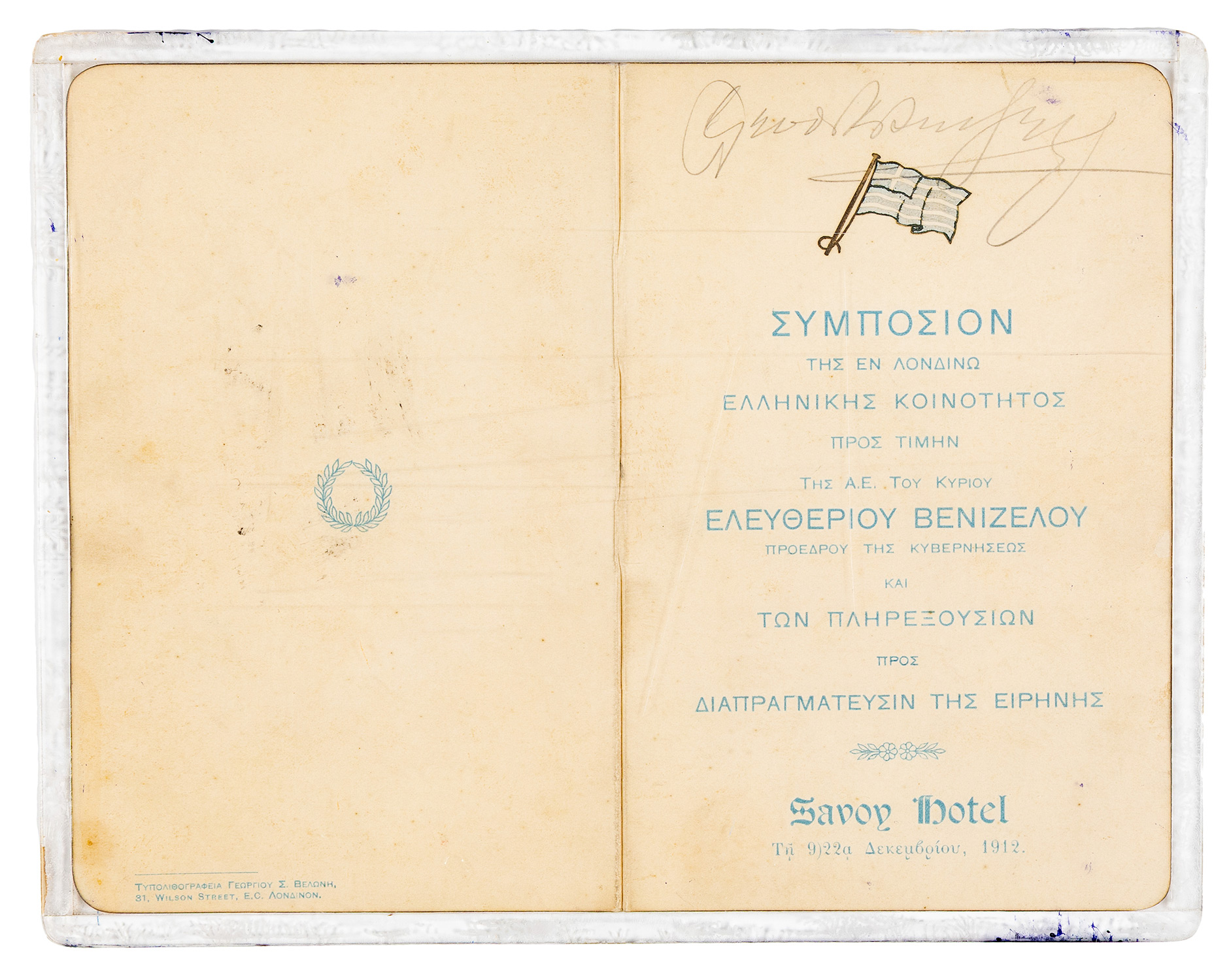 Δίπτυχο, 175 x 113 mm., τίτλος και υπογραφή του Ελ. Βενιζέλου με μολύβι στη σ. [1]: «Συμπόσιον τῆς ἐν Λονδίνῳ Ἑλληνικῆς Κοινότητος πρός τιμήν τῆς Α.Ε. τοῦ κυρίου Ἐλευθερίου Βενιζέλου καί τῶν πληρεξουσίων πρός διαπραγμάτευσιν τῆς εἰρήνης. Savoy Hotel. Τῇ 9)22ᾳ Δεκεμβρίου, 1912.». Τοποθετημένο μέσα σε αυτό το δίπτυχο, ένα μικρότερων διαστάσεων με τις «Προπόσεις» και το «Menu». Σε plexi-glass.