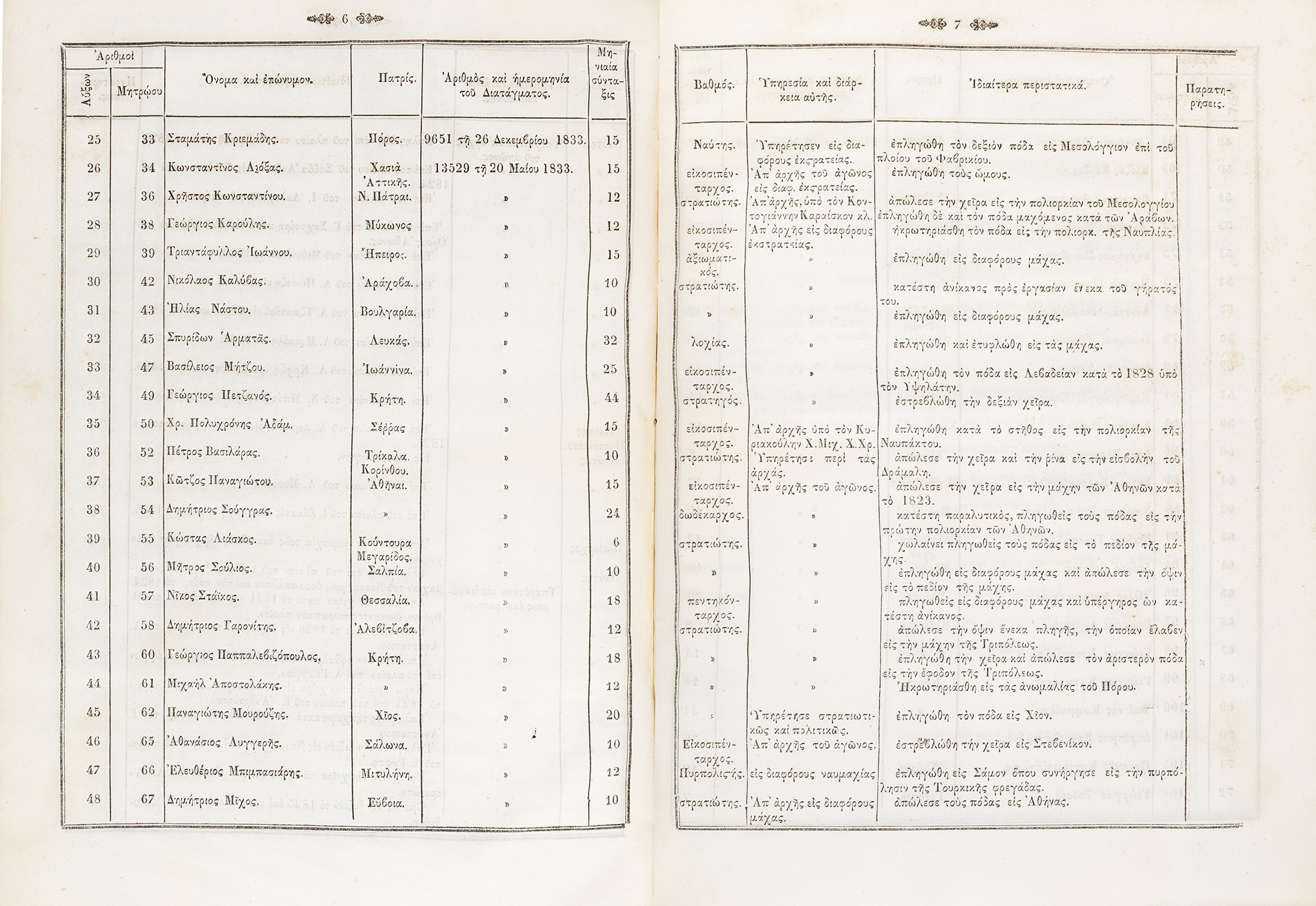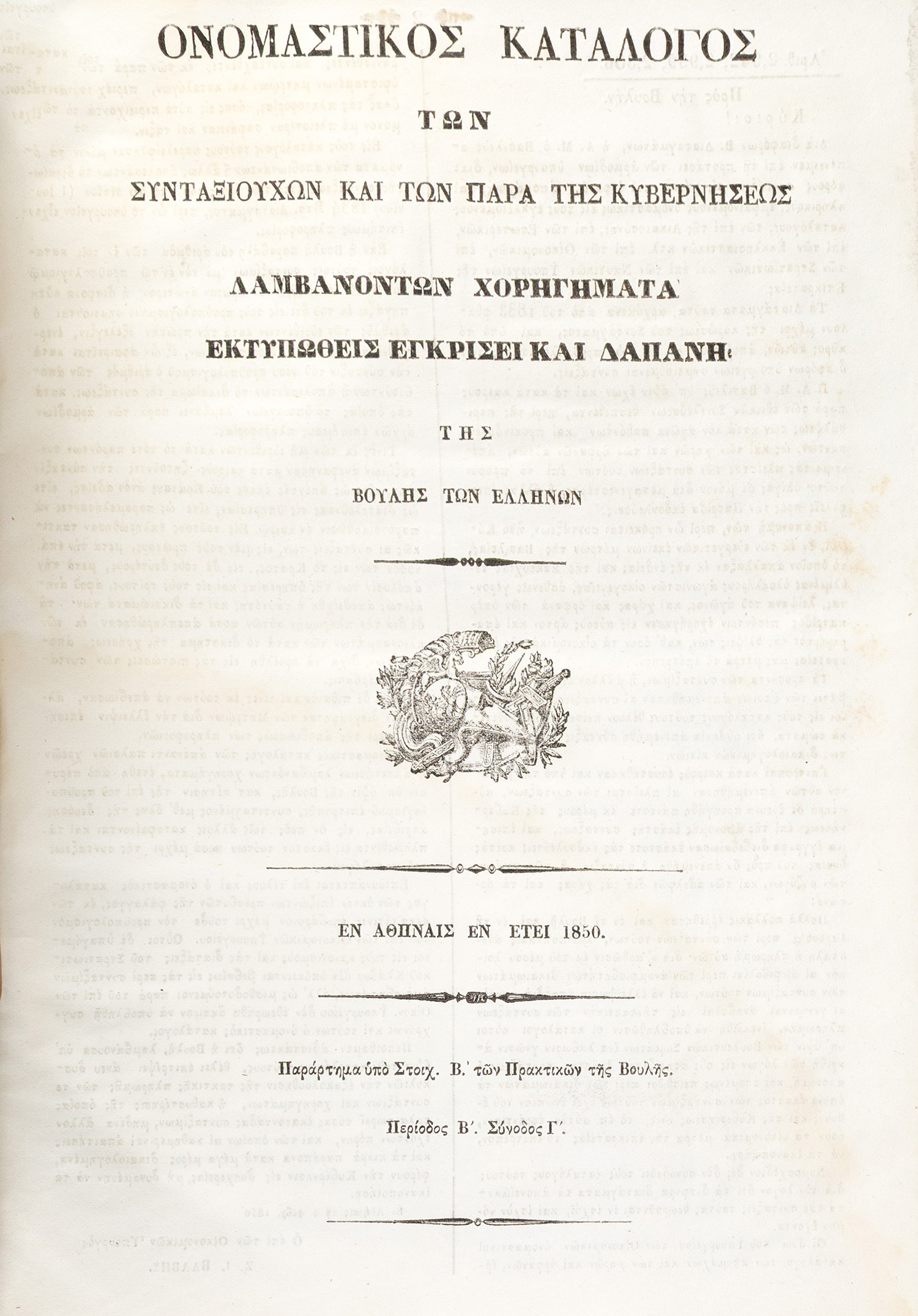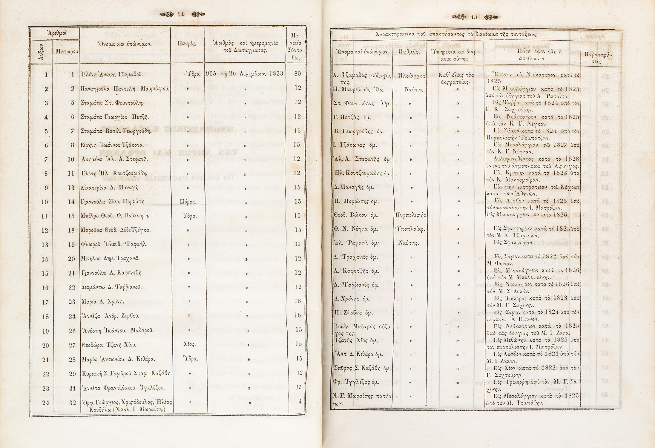 4ο, 214 σ. (λεκέδες από υγρασία στα τελευταία επτά φύλλα). Αρχικά χαρτόνια (λερωμένα, λείπει η ράχη). ΒΕΦΗ, 1850.231, Λαγανάς 1071. [δεμένο στην αρχή:] Κατάλογος τῶν συνταξιοδοτουμένων ἐκ τοῦ Ὑπουργείου τῶν Ἐσωτερικῶν, [στη σ. 3:] Κατάλογος τῶν συνταξιοδοτουμένων χηρῶν καί ὀρφανῶν ἐκ τοῦ Ὑπουργείου τῶν Ἐσωτερικῶν, [στη σ. 7:] Κατάλογος τῶν συνταξιοδοτουμένων ἐκ τοῦ Ὑπουργείου τῶν Ἐκκλησιαστικῶν, [στη σ. 17:] Κατάλογος τῶν παρά τοῦ Ὑπουργείου τῆς Δικαιοσύνης διδομένων συντάξεων, [στη σ. 18:] Ὀνομαστικός κατάλογος τῶν χηρῶν καί ὀρφανῶν αἵτινες λαμβάνουν συντάξεις ἀπό τόν στρατιωτικόν κλάδον, [στη σ. 31:] Κατάλογος τοῦ προσωπικοῦ τῶν ὑπό σύνταξιν χηρῶν καί ὀρφανῶν τοῦ Ὑπουργείου τῶν Ναυτικῶν, [στη σ. 32:] Κατάλογος τῶν πρεσβυτῶν τῆς Φάλαγγος τῶν πληρονομένων παρά τοῦ Ὑπουργείου τῶν Οἰκονομικῶν, [στη σ. 33:] Κατάστασις τοῦ προσωπικοῦ τῶν ὑπό σύνταξιν ἀπομάχων τοῦ Ὑπουργείου τῶν Ναυτικῶν, [στη σ. 35:] Πίναξ τῶν πληρωθέντων εἰς τούς λαμβάνοντας χορηγήματα ἀπέναντι παλαιῶν χρεῶν. [Αθήνα 1850]. • 4ο, 47 σ. Λαγανάς 1071. • Αυτοί οι κατάλογοι με πάνω από 2.500 καταχωρήσεις ονομάτων συνταξιοδοτούμενων αγωνιστών καθώς και χηρών, ορφανών και αδελφών πεσόντων αγωνιστών υποβλήθηκαν στη Βουλή των Ελλήνων και αντίτυπά τους μοιράστηκαν στους βουλευτές, έτσι ώστε να υπάρξει απόλυτη διαφάνεια στη χορήγηση των συντάξεων. Καταχωρούνται αναλυτικά τα ποσά, η καταγωγή, ο βαθμός και η υπηρεσία, οι τραυματισμοί κατά τη μάχη και αντίστοιχα τα ονόματα των συγγενών των αγωνιστών που δικαιούνται σύνταξη (πού και πώς σκοτώθηκαν οι πεσόντες σε μάχες ή πού και πότε απεβίωσαν οι αγωνιστές). • ΠΟΛΥ ΣΠΑΝΙΟ.