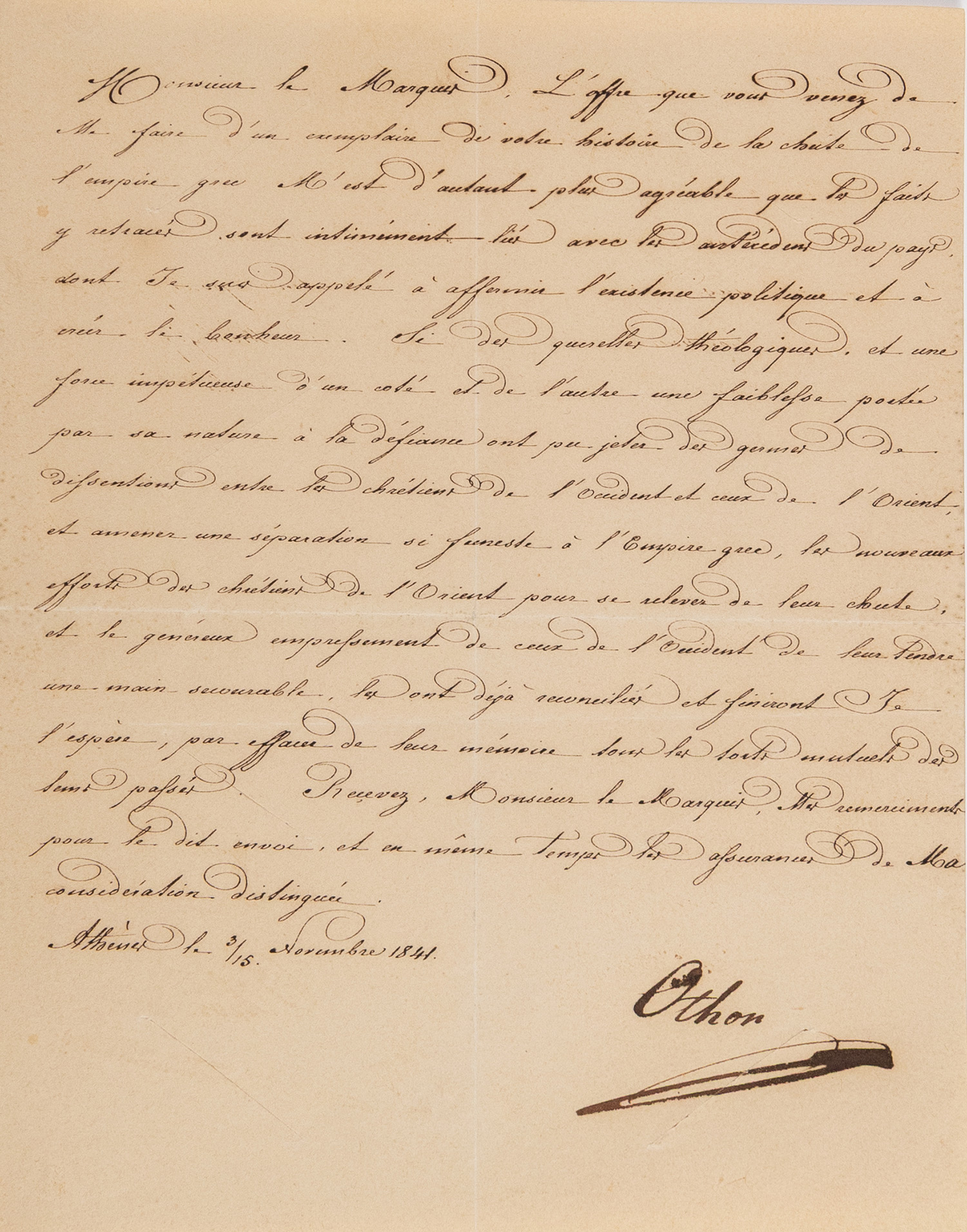 1 σελίδα, 216 x 170 mm. • «Monsieur le Marquis, L’offre que vous venez de Me faire d’un exemplaire de votre histoire de la chute de l’empire grec M’est d’autant plus agréable que les faits y retracés sont intinément liés avec les antécédens du pays dont Je suis appelé à affermir l’existence politique et à créer le bonheur…» («Κύριε Μαρκήσιε, η προσφορά ενός αντιτύπου της ιστορίας σας σχετικά με την πτώση της ελληνικής αυτοκρατορίας που μόλις μου κάνατε, με ευχαριστεί ακόμη περισσότερο, καθώς τα γεγονότα που περιγράφονται σε αυτήν είναι άρρηκτα συνδεδεμένα με το παρελθόν της χώρας, της οποίας την πολιτική ύπαρξη καλούμαι να ενισχύσω, καθώς και να δημιουργήσω την ευτυχία της…»).