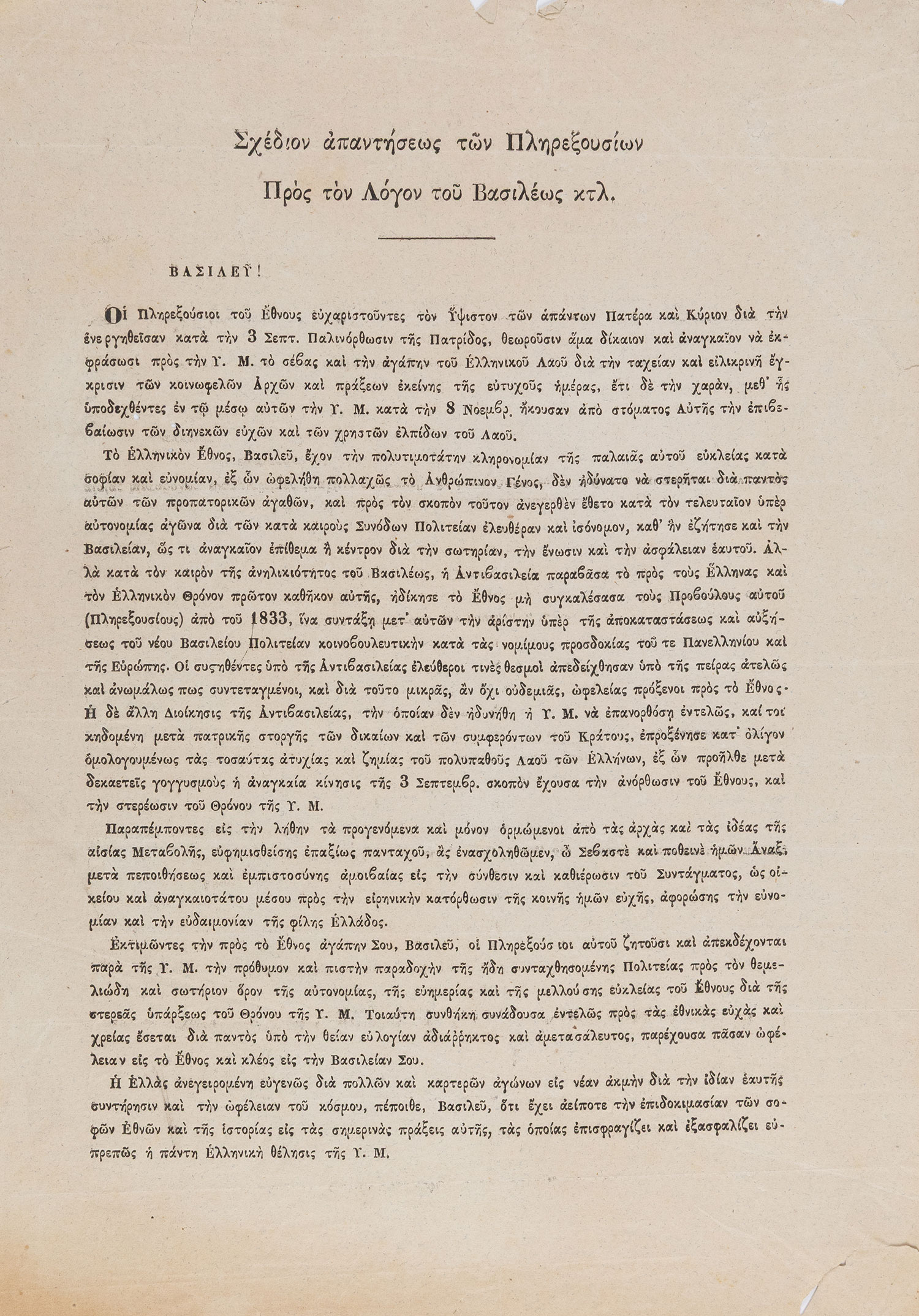 ΣΥΓΚΛΗΣΗ Α΄ ΕΘΝΙΚΗΣ ΣΥΝΕΛΕΥΣΗΣ ΜΕΤΑ ΤΗΝ ΕΠΑΝΑΣΤΑΣΗ ΤΗΣ 3ΗΣ ΣΕΠΤΕΜΒΡΙΟΥ (8 Νοεμβρίου 1843) — Σχέδιον ἀπαντήσεως τῶν Πληρεξουσίων πρός τόν λόγον τοῦ Βασιλέως κτλ. ΒΑΣΙΛΕΥ! Οἱ Πληρεξούσιοι τοῦ Ἔθνους εὐχαριστοῦντες τόν Ὕψιστον τῶν ἁπάντων Πατέρα καί Κύριον διά τήν ἐνεργηθεῖσαν κατά τήν 3 Σεπτ. Παλινόρθωσιν τῆς Πατρίδος, θεωροῦσιν ἅμα δίκαιον καί ἀναγκαῖον νά ἐκφράσωσι πρός τήν Υ. Μ. τό σέβας καί τήν ἀγάπην τοῦ Ἑλληνικοῦ Λαοῦ διά τήν ταχείαν καί είλικρινῆ ἔγκρισιν τῶν κοινωφελῶν Ἀρχῶν καί πράξεων ἐκείνης τῆς εὐτυχούς ἡμερας… [τελειώνει:] ... πέποιθε, Βασιλεῦ, ὅτι ἔχει [ἡ Ἑλλάς] ἀείποτε τήν ἐπιδοκιμασίαν τῶν σοφῶν Ἐθνῶν καί τῆς ἱστορίας εἰς τάς σημερινάς πράξεις αὐτῆς, τάς ὁποίας ἐπισφραγίζει καί ἐξασφαλίζει εὐπρεπῶς ἡ πάντη Ἑλληνική θέλησις τῆς Υ. Μ.