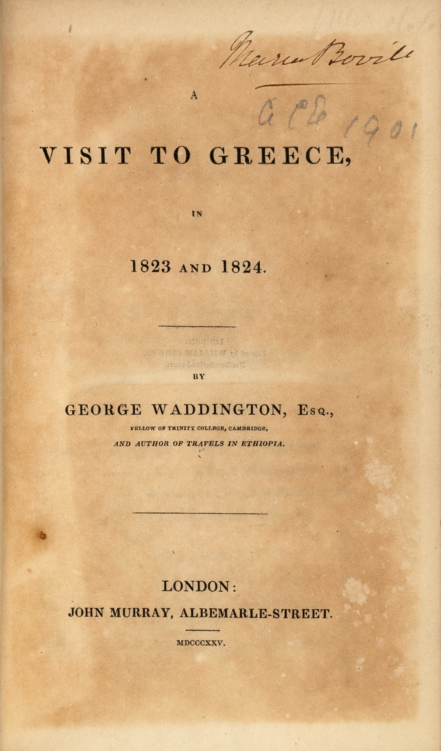 ΠΡΩΤΗ ΕΚΔΟΣΗ. μικρό 8ο (178 x 112 mm.), lix + 248 σ. (ελαφρά οξειδωμένος ο τίτλος και λίγα φύλλα, επιδιορθωμένο σχίσιμο στον χάρτη). Με έναν αναδιπλούμενο χαλκόγραφο χάρτη της Ελλάδας και ένα αναδιπλούμενο τοπογραφικό της Ακρόπολης. Νεότερο πανί (μικρές φθορές, κόκκινες οι ακμές, ex-libris Α. Δ. Χατζηδήμου). Weber, I, 136, Droulia 1276, πρβ. Blackmer 1755, Λαγανάς 759.