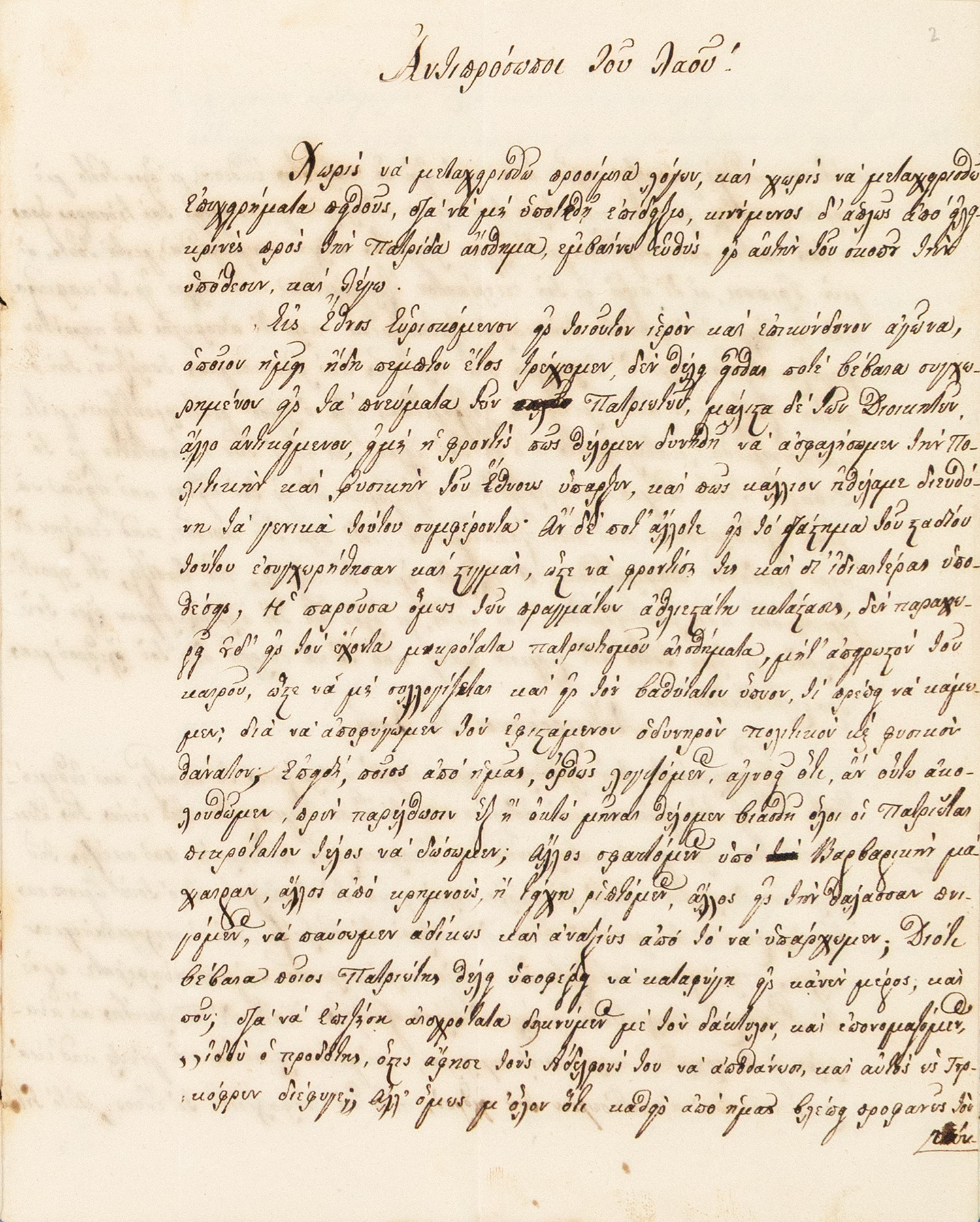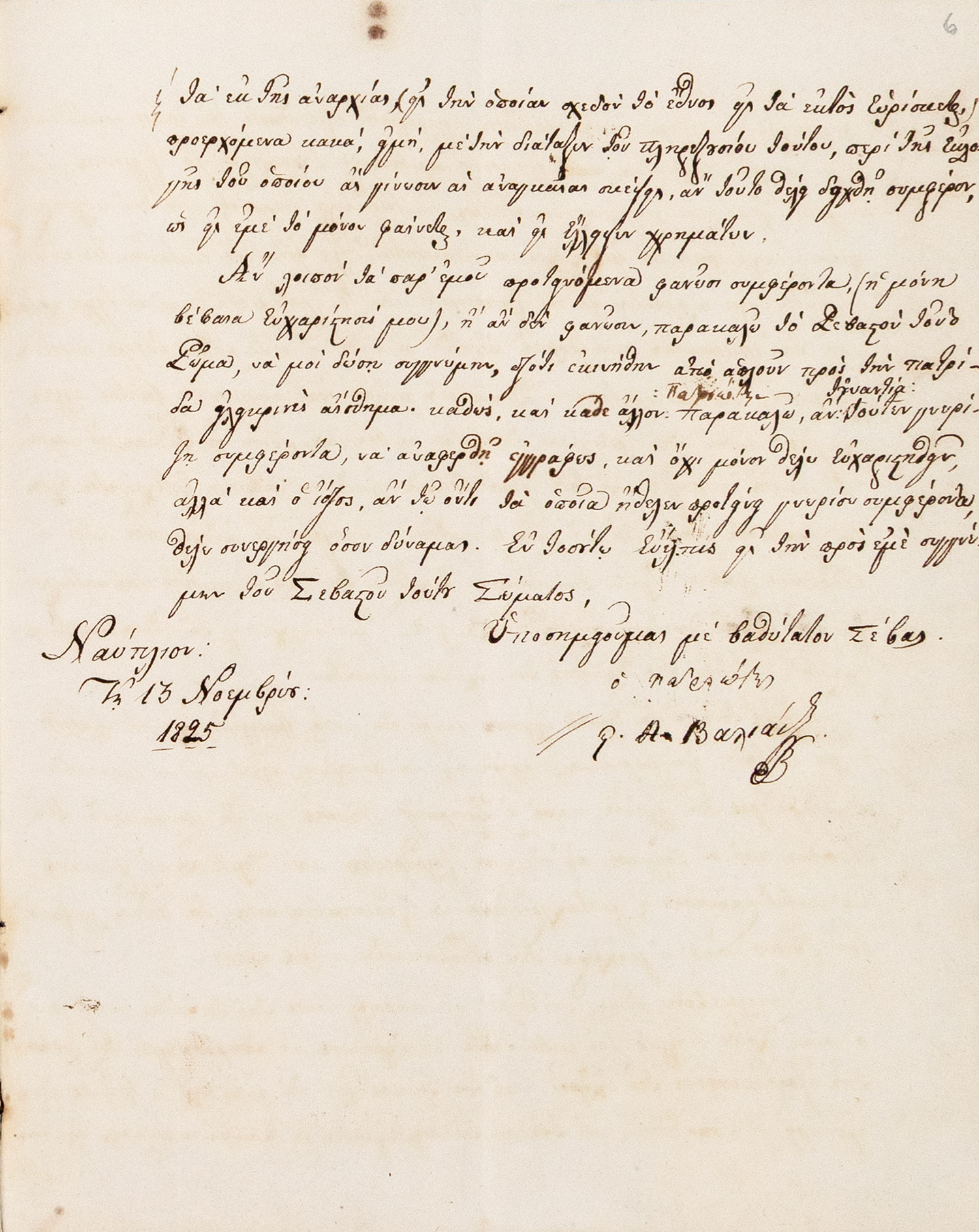 Αὐτόγραφο λόγου του πρὸς τὸ Βουλευτικὸ μὲ σκέψεις σχετικὰ μὲ τὴν ἄμυνα τῆς Πελοποννήσου ἐν ὄψει τῆς ἀποβίβασης καὶ τῶν καταστροφῶν τοῦ Ἰμπραήμ στὴν Πελοπόννησο.