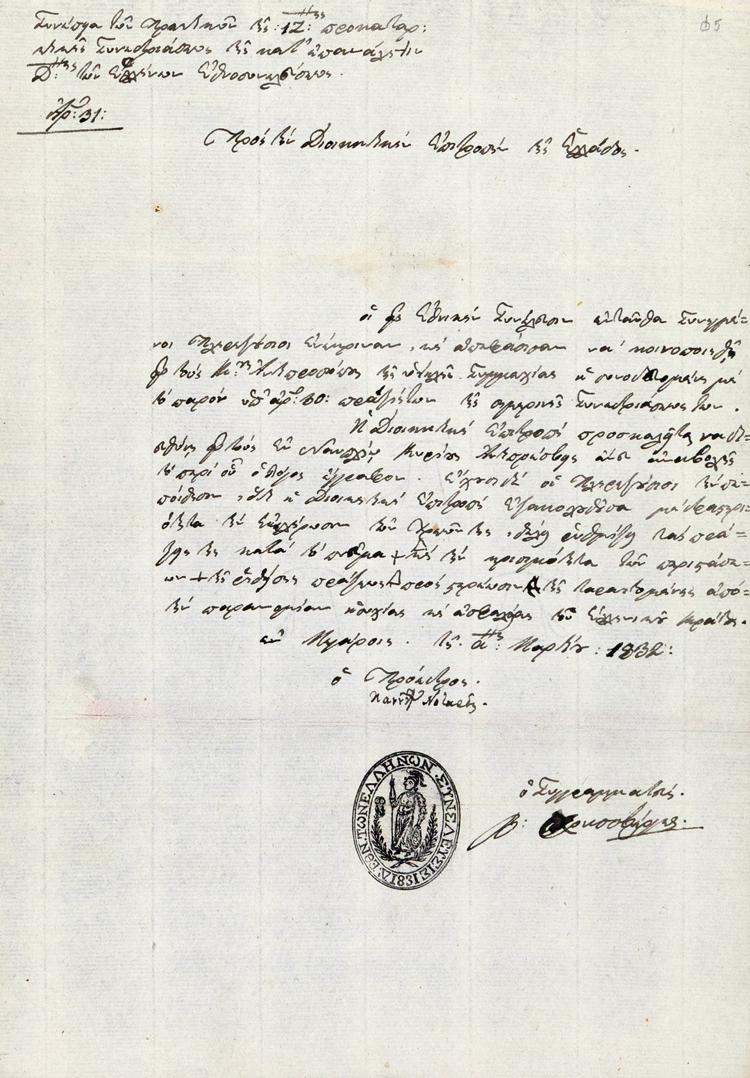 Διαβιβαστικὸ ἔγγραφο τοῦ προέδρου τῶν προκαταρκτικῶν συνεδριάσεων τῆς Δ΄ Ἐθνοσυνελεύσεως Πανούτσου Νοταρᾶ πρὸς τὴ Διοικητικὴ Ἐπιτροπὴ τῆς Ἑλλάδος, μὲ τὸ ὁποῖο ἡ Διοικητικὴ Ἐπιτροπὴ ὀφείλει νὰ ἀποστείλει τὸ διαβιβαζόμενο ἔγγραφο στοὺς Ἀντιπρέσβεις τῶν Συμμάχων στὸ Ναύπλιο.