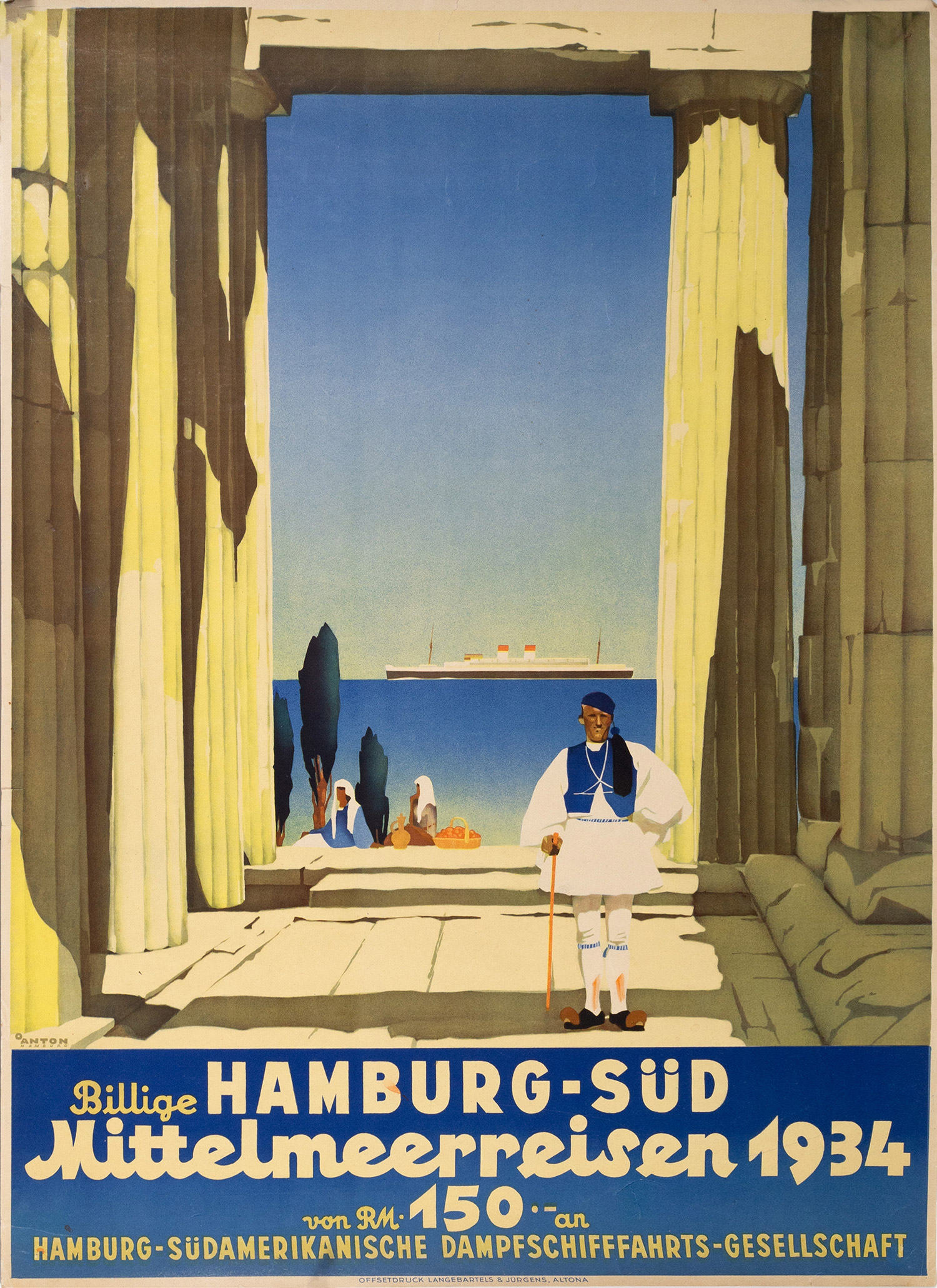 Έγχρωμη αφίσα (φωτολιθογραφία) τυπωμένη σε λεπτό χαρτόνι, 836 x 595 mm. (λίγα μικρά σχισίματα επιδιορθωμένα με σελοτέιπ στην πίσω όψη). Έκδοση της Hamburg-Südamerikanische Dampfschifffahrts-Gesellschaft.