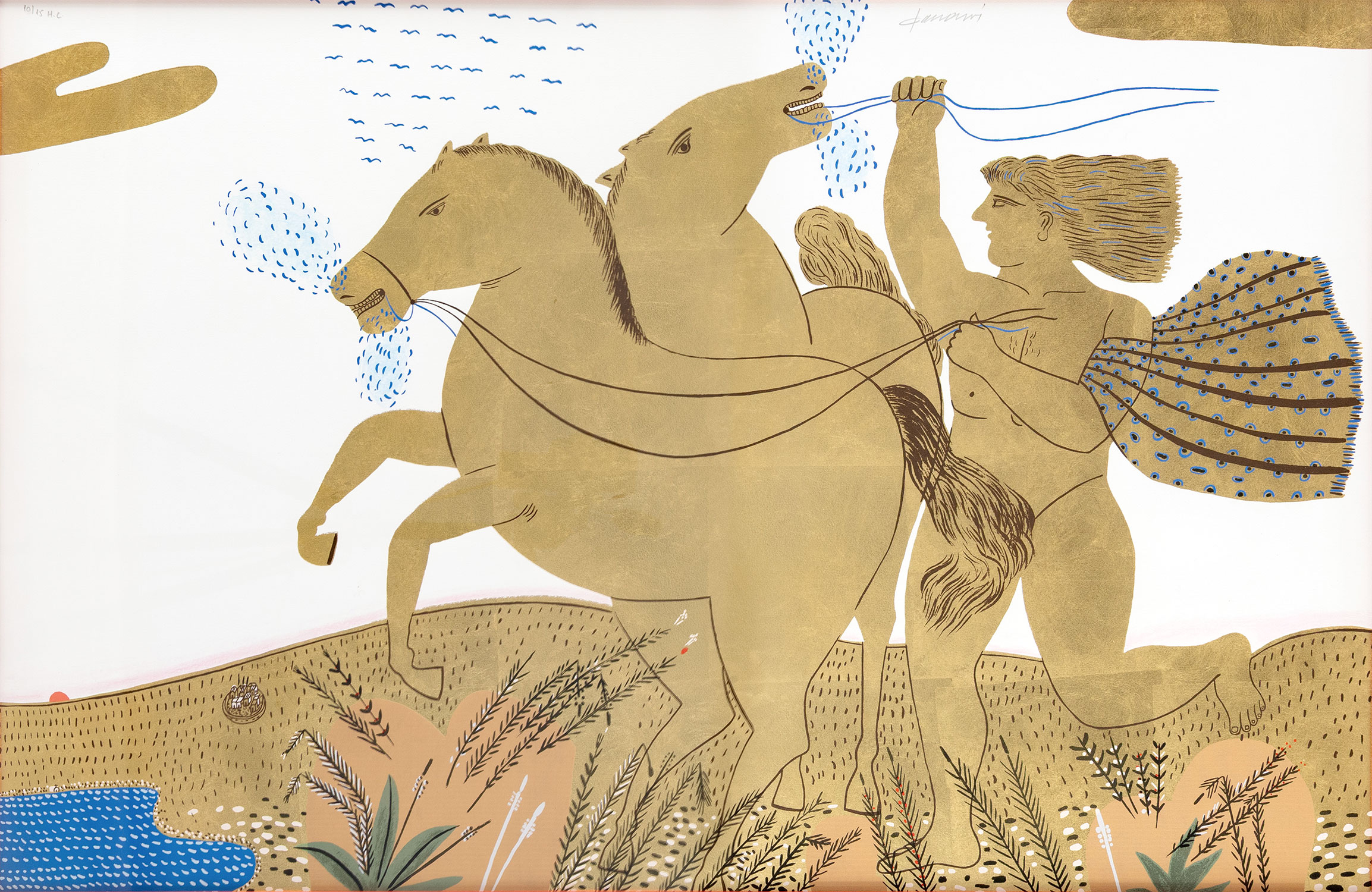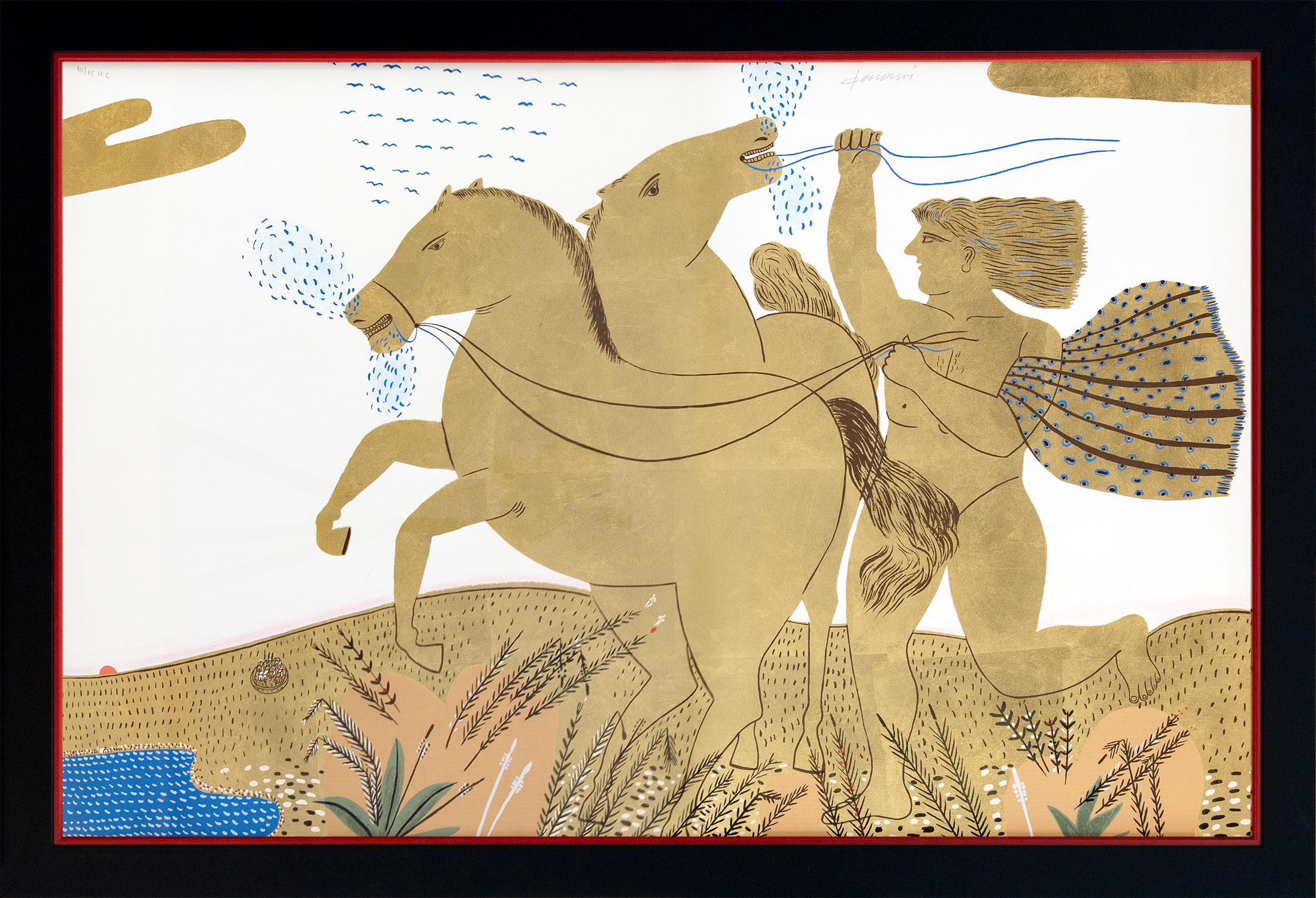 Μεταξοτυπία (χειροποίητη) και φύλλο χρυσού, 625 x 960 mm., επιζωγραφισμένη με το χέρι (κραγιόνια). Η ένδειξη «10/15 H. C.» και υπογραφή πάνω αριστερά και δεξιά αντίστοιχα με μολύβι. Σε κορνίζα.