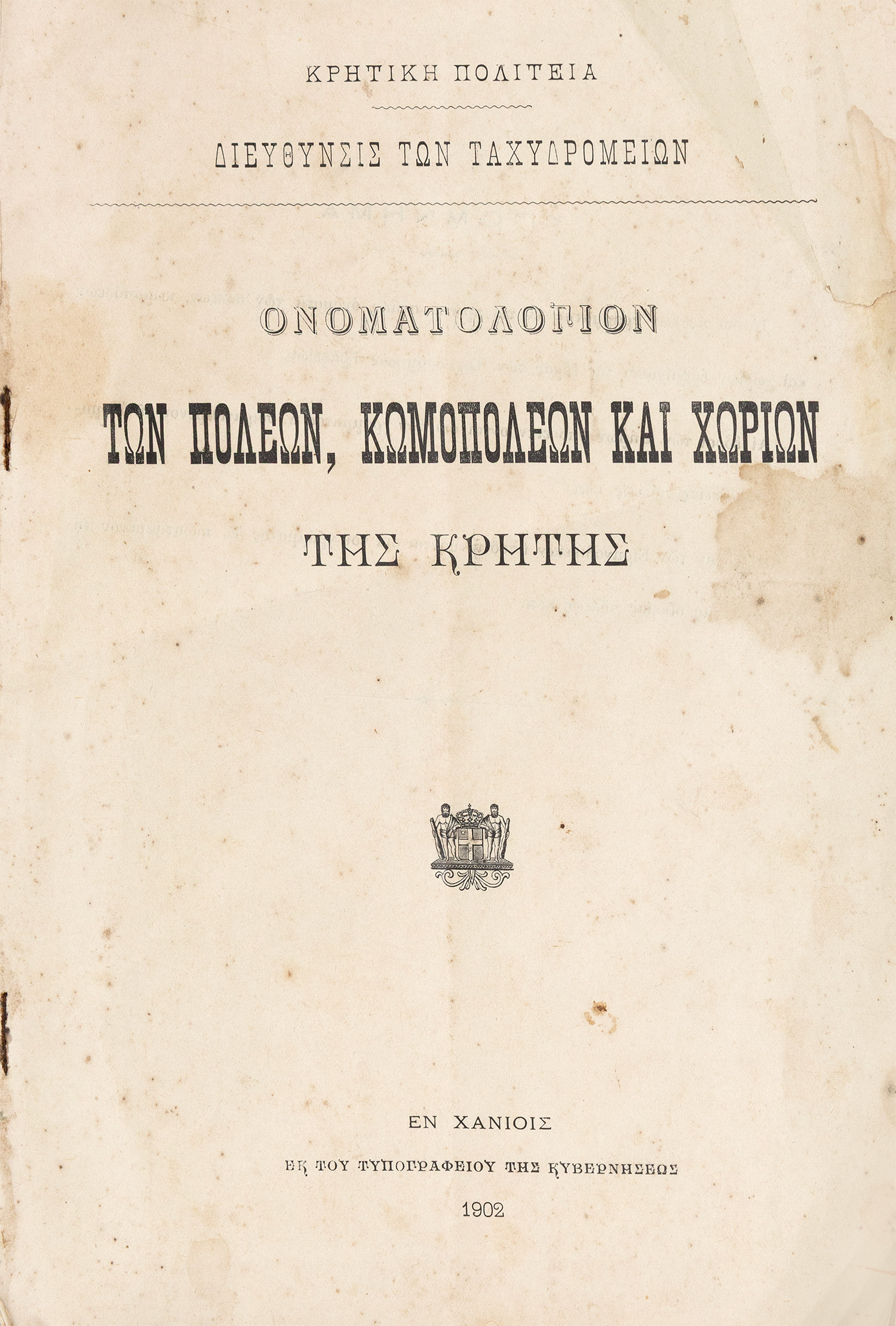 Ὀνοματολόγιον τῶν πόλεων, κωμοπόλεων καὶ χωρίων τῆς Κρήτης [πάνω:] Κρητικὴ Πολιτεία. Διεύθυνσις τῶν ταχυδρομείων.