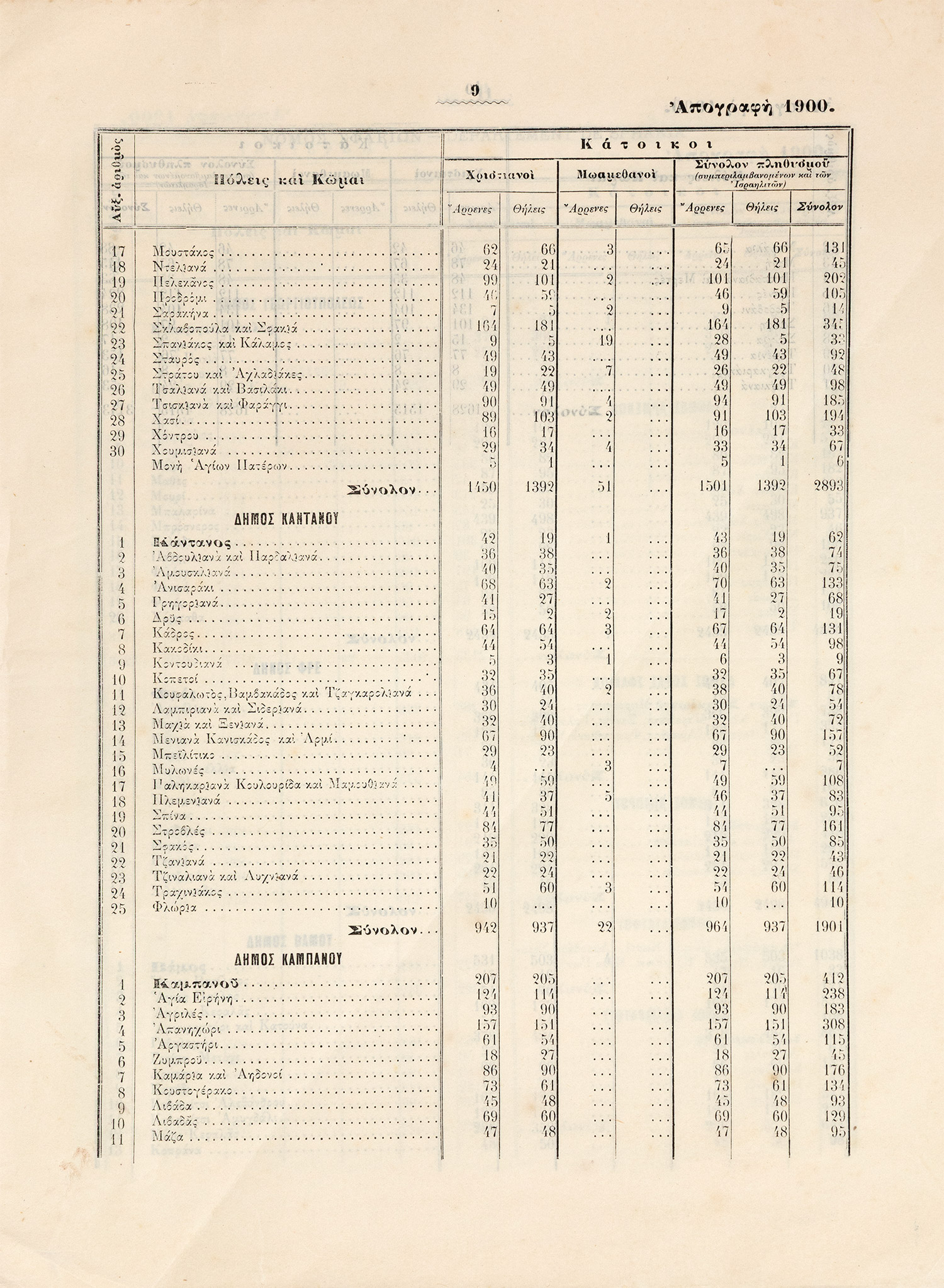 4ο (280 x 203), 34 σ. (λίγο λερωμένος ο τίτλος, φθορές στο τελευταίο φύλλο). Απόδετο. [μαζί:] [Ἀποτελέσματα τῆς γενικῆς ἀπογραφῆς τῶν κατοίκων τῆς Κρήτης] [στη σ. [1]:] Ἀπογραφὴ πληθυσμοῦ κατὰ τὴν 4/17 Ἰουνίου 1900. • 4ο (280 x 203), ιζ΄ + 109 σ. (λείπει το πρώτο τεύχος: σ. α΄-η΄. Αντίτυπο σε άρραφα τεύχη (άκοπο).