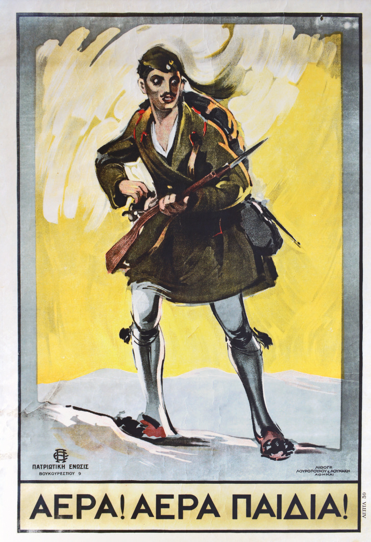 Χρωμολιθόγραφη ἀφίσα, 820 x 560 mm. (σχίσιμο στήν ἀριστερή πλευρά). Σέ κορνίζα. Καραχρῆστος 20.