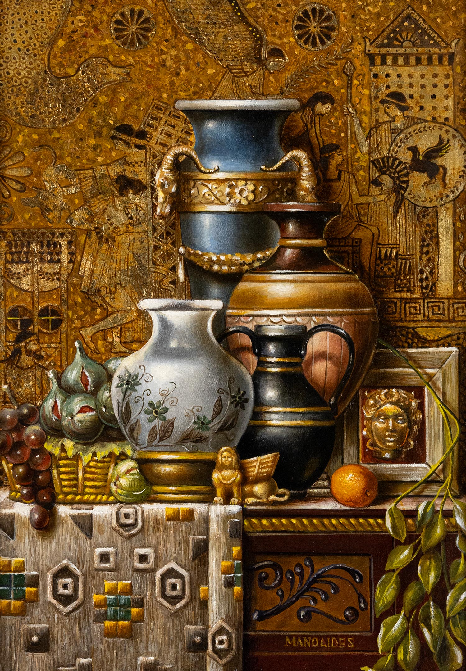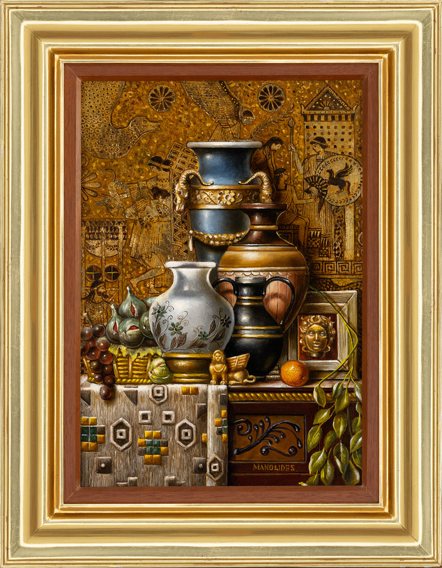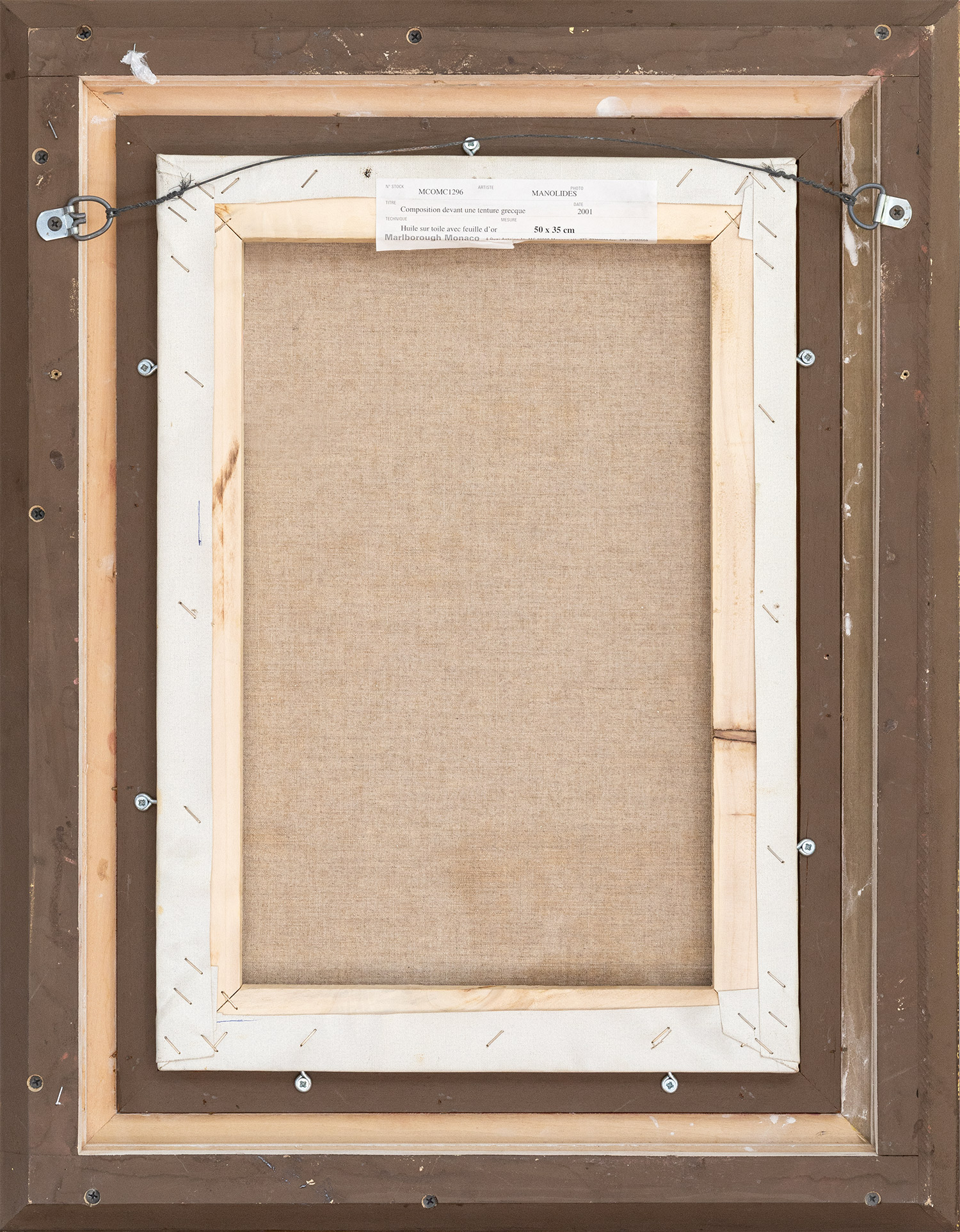 υπογεγραμμένο κάτω δεξιά μέσα στο θέμα: MANOLIDES τίτλος σε ετικέτα στην πίσω όψη