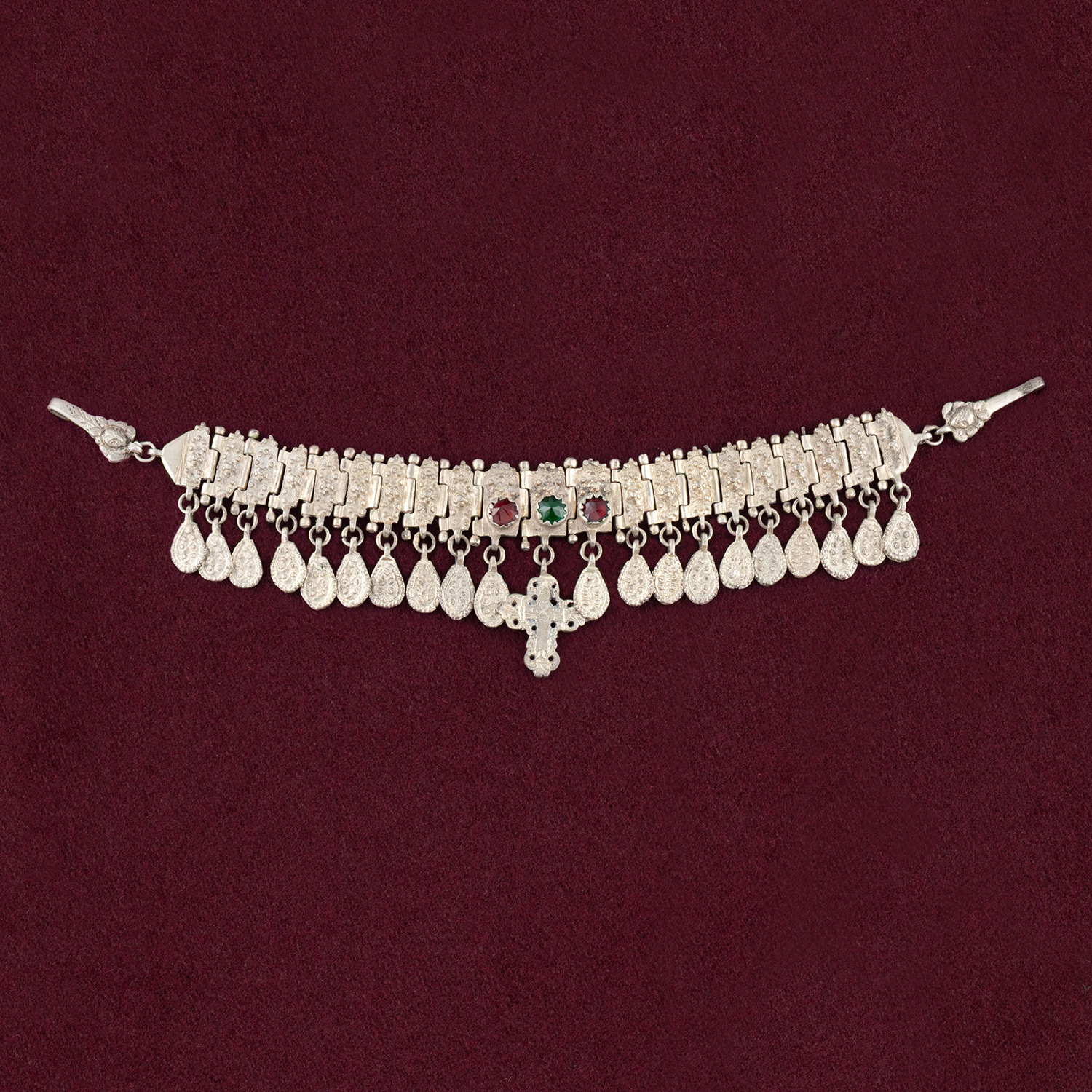 Τιμή εκτίμησης: € 1.000 - 1.500Σχηματίζεται από είκοσι μία (21) χυτές πλάκες με κοκκιδωτό διάκοσμο και τρεις ένθετες χρωματιστές πέτρες. Φέρει αμυγδαλόσχημα κρεμασίδια και σταυρό αναρτημένο στην κεντρική πλάκα.