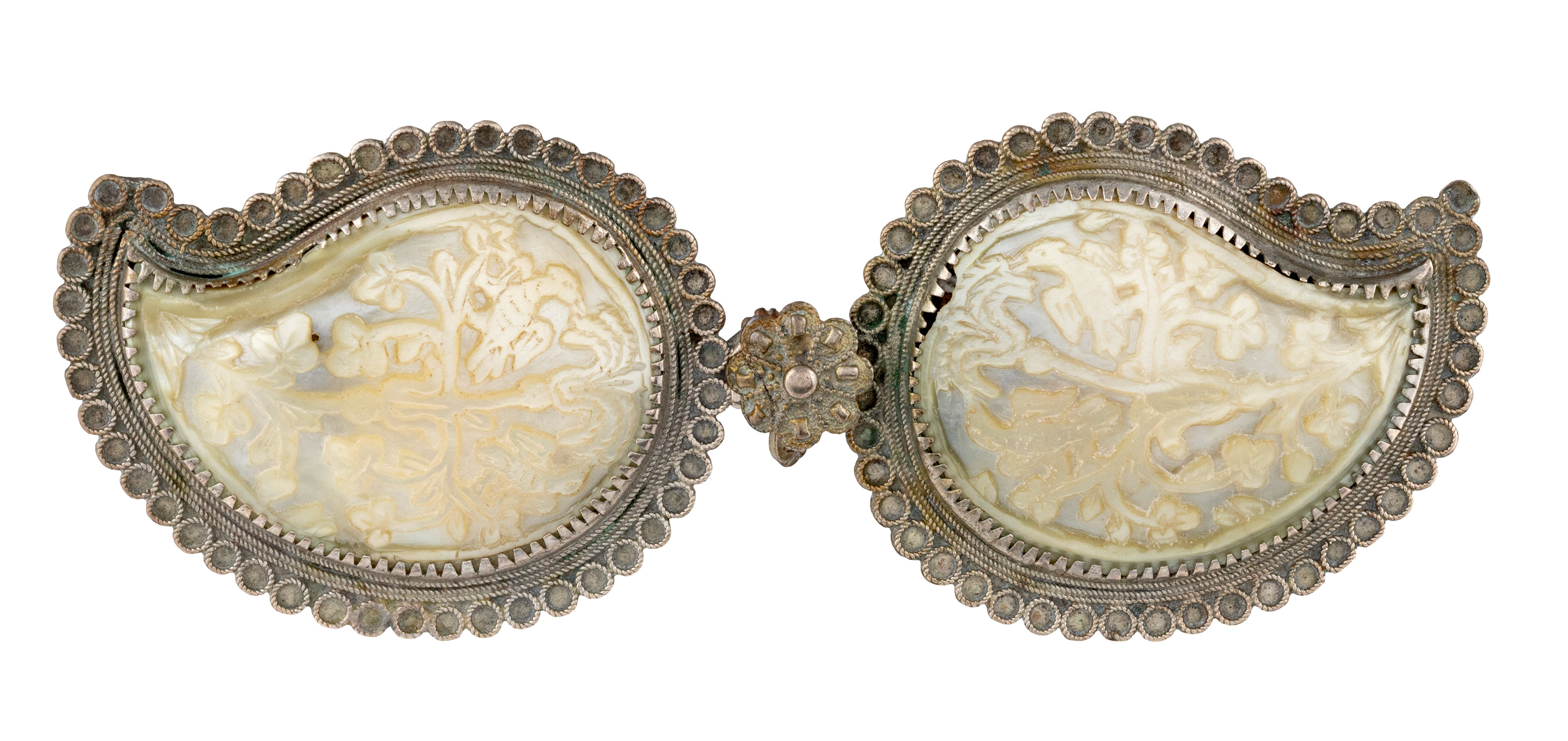 Τιμή εκτίμησης: € 1.500 - 2.000Αποτελείται από δύο φυλλόσχημες χυτές υποδοχές με περιμετρικό συρματερό διάκοσμο, στις οποίες προσαρμόζονται σεντεφένια τμήματα με παραστάσεις πουλιών να τσιμπολογούν καρπούς από κεντρικό άνθος. Στο κλείδωμα πολύφυλλος ρόδακας.