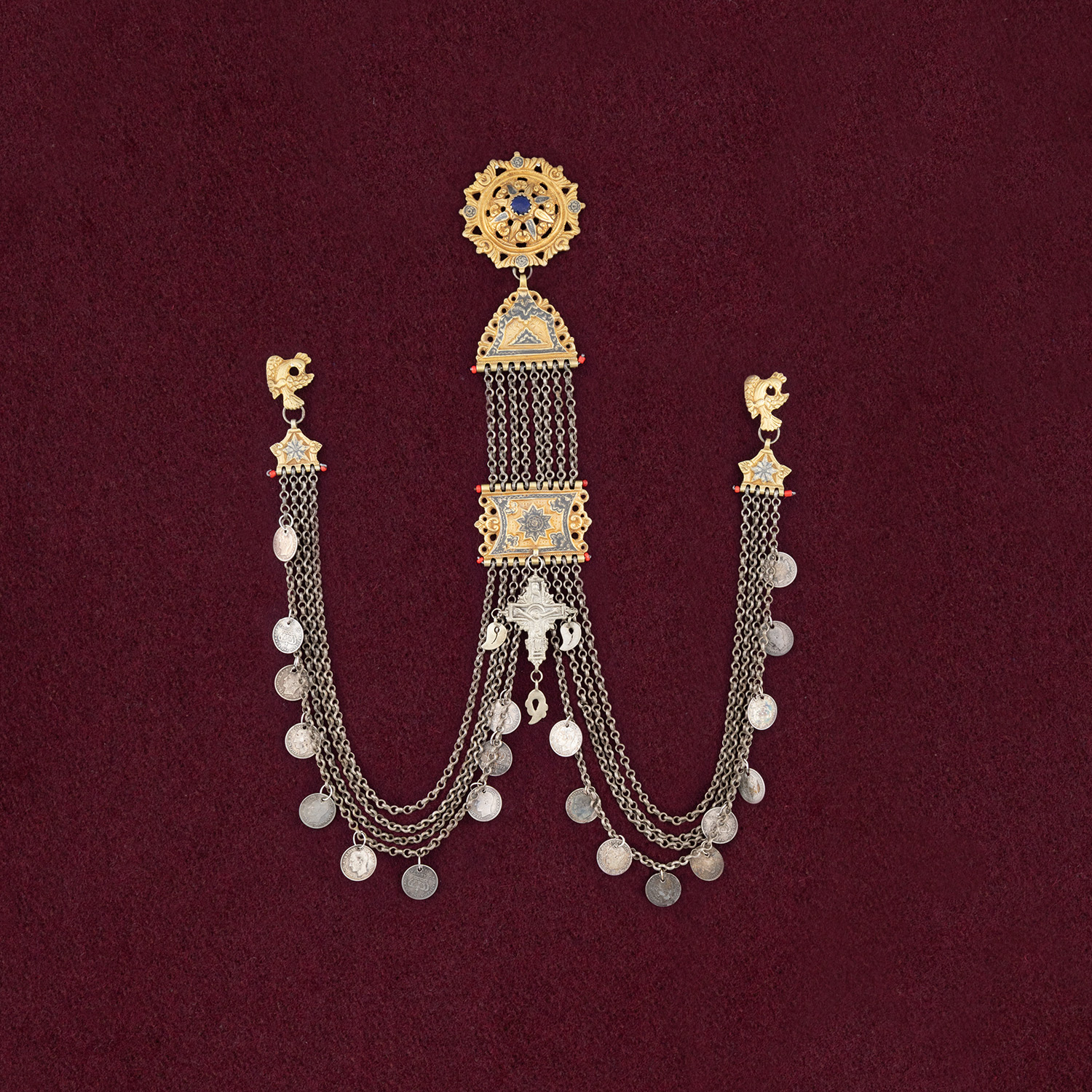 Τιμή εκτίμησης: € 1.600 - 2.000Αποτελείται από τρεις ασημένιες επίχρυσες πλάκες ενωμένες μεταξύ τους με αλυσίδες που καταλήγουν σε δύο τριγωνικού τύπου ελάσματα με πτηνόμορφους γάντζους. Η κυκλική πλάκα της κορυφής φέρει γυάλινη χρωματιστή πέτρα πλαισιωμένη από σαβατλίδικα μοτίβα. Οι άλλες δύο, όπως και τα ελάσματα, διακοσμούνται με φυτικά και αστεροειδή μοτίβα φιλοτεχνημένα με σαβάτι, ενώ από την μία πλάκα κρέμεται ασημένιος σταυρός. Οι αλυσίδες είναι διακοσμημένες με νομίσματα των 20 λεπτών του 1874 και του 1883 του βασιλιά Γεωργίου Α´ .