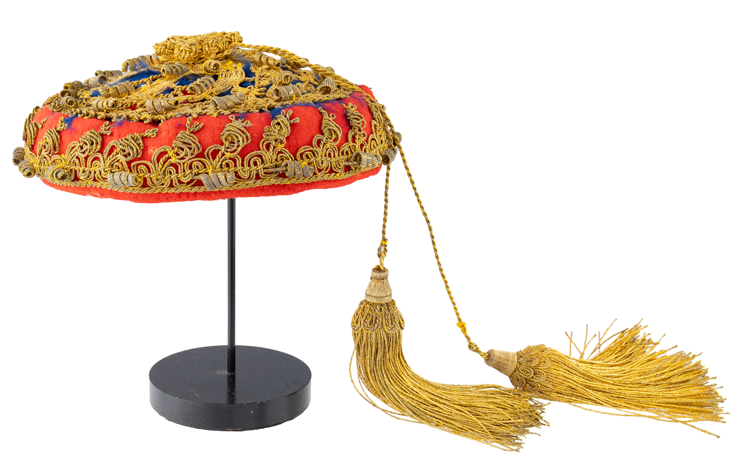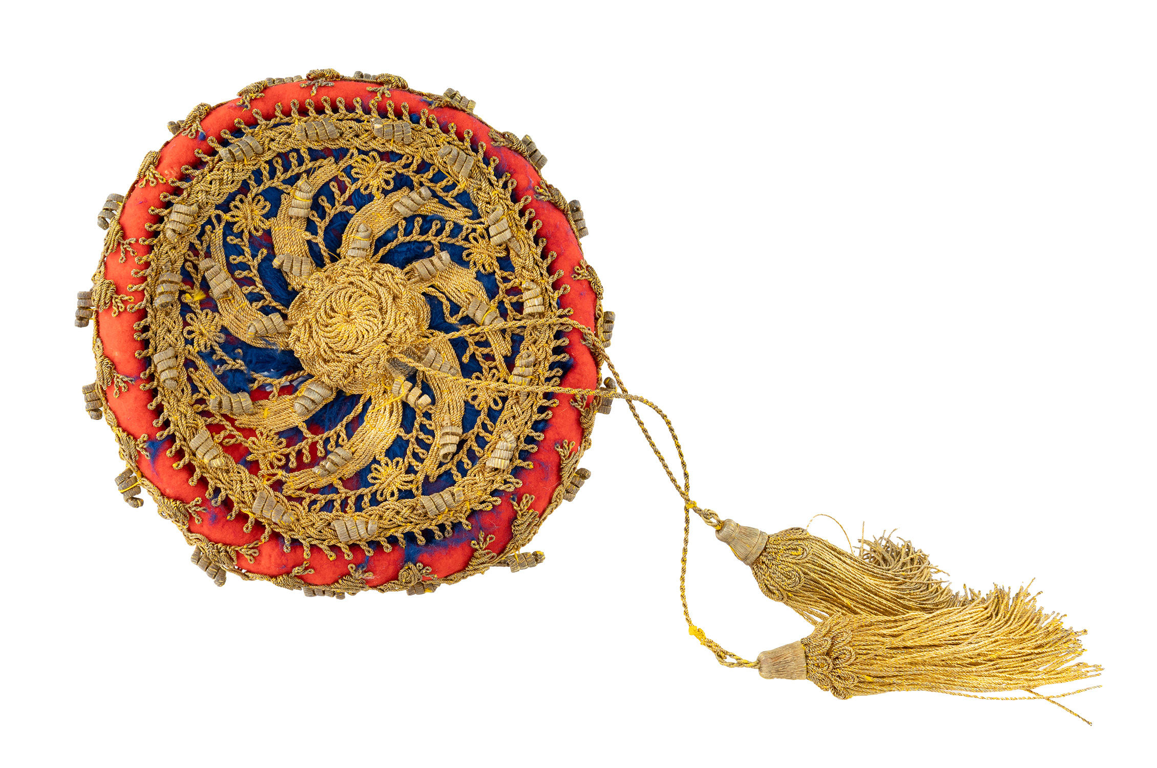 Τιμή εκτίμησης: € 2.000 - 3.000Μέρος της παλιάς αθηναϊκής φορεσιάς. Κόκκινη τσόχα με χρυσοΰφαντο σειρήτι στην περιφέρεια. Στον τεπέ περίτεχνο συρμακέσικο χρυσοκέντημα με άνθη, ανά γλυφους έλικες και ακτινωτά μοτίβα.