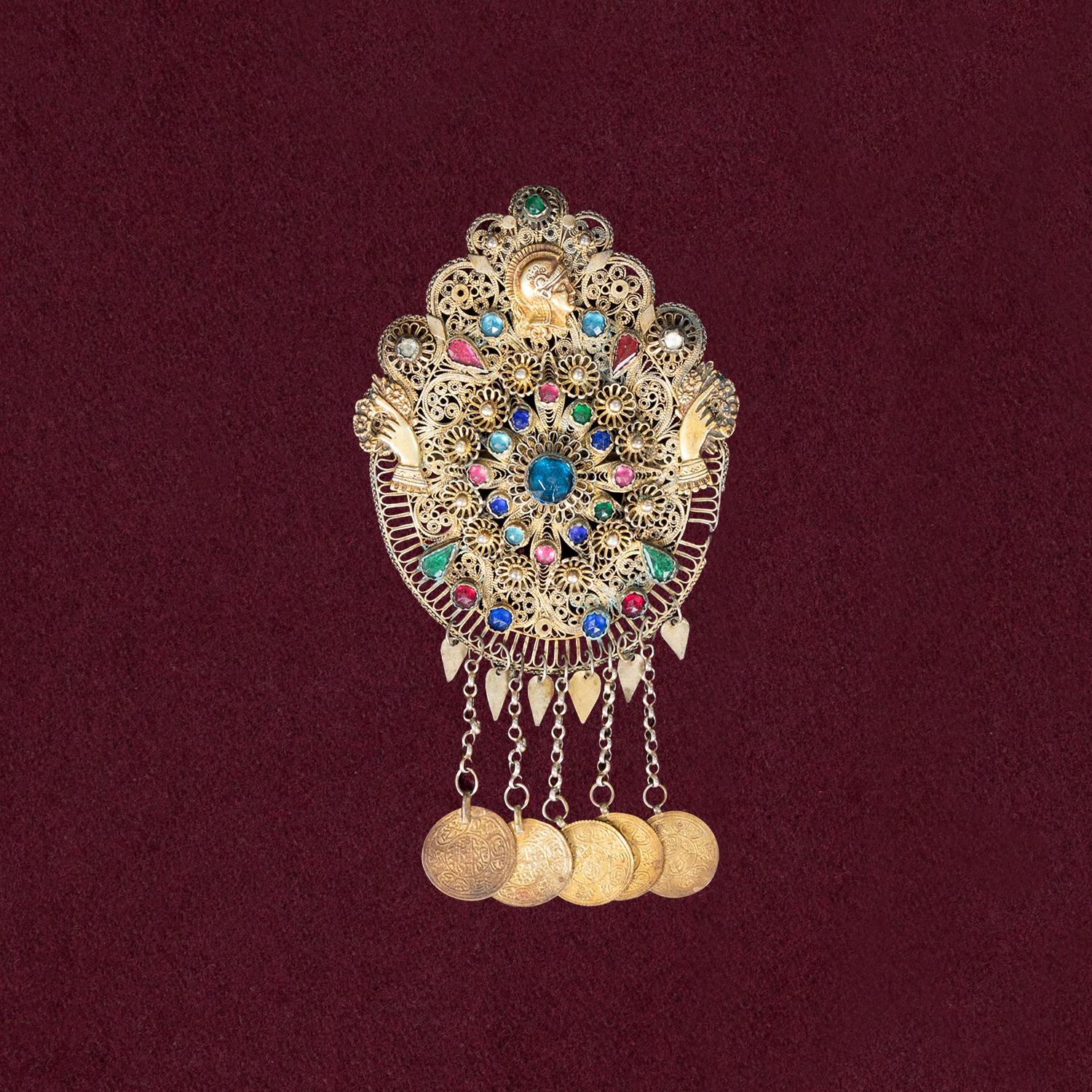 Τιμή εκτίμησης: € 600 - 800Διάτρητος συρματερός διάκοσμος με ένθετες χρωματιστές πέτρες και απομιμήσεις φλουριών ως κρεμασίδια. Στο πάνω τμήμα φέρει κεφαλή της Θεάς Αθηνάς.