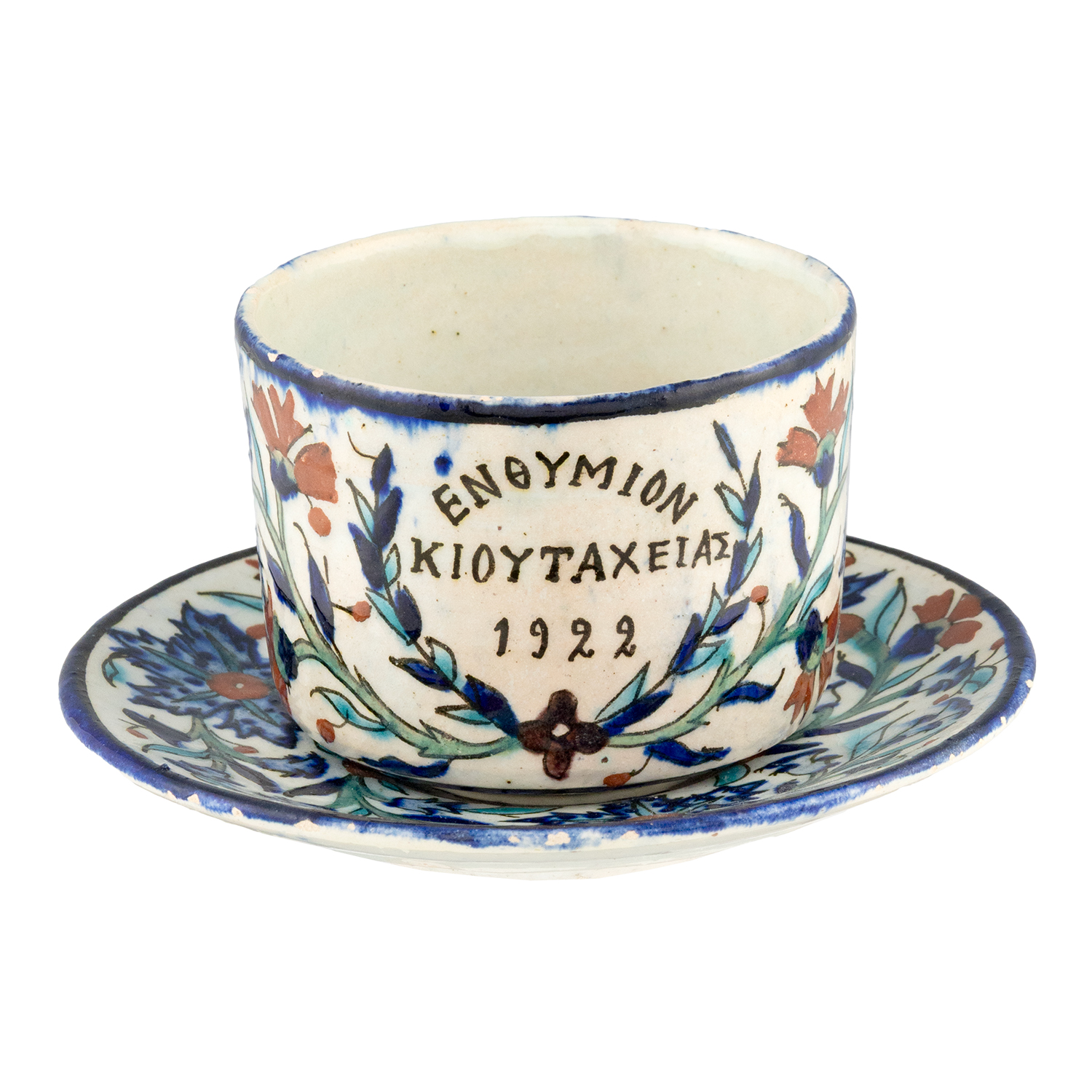 Κιουτάχεια. Φλιτζάνι καφέ-τσαγιού με ελληνική επιγραφή «ΕΝΘΥΜΙΟΝ ΚΙΟΥΤΑΧΕΙΑΣ 1922».